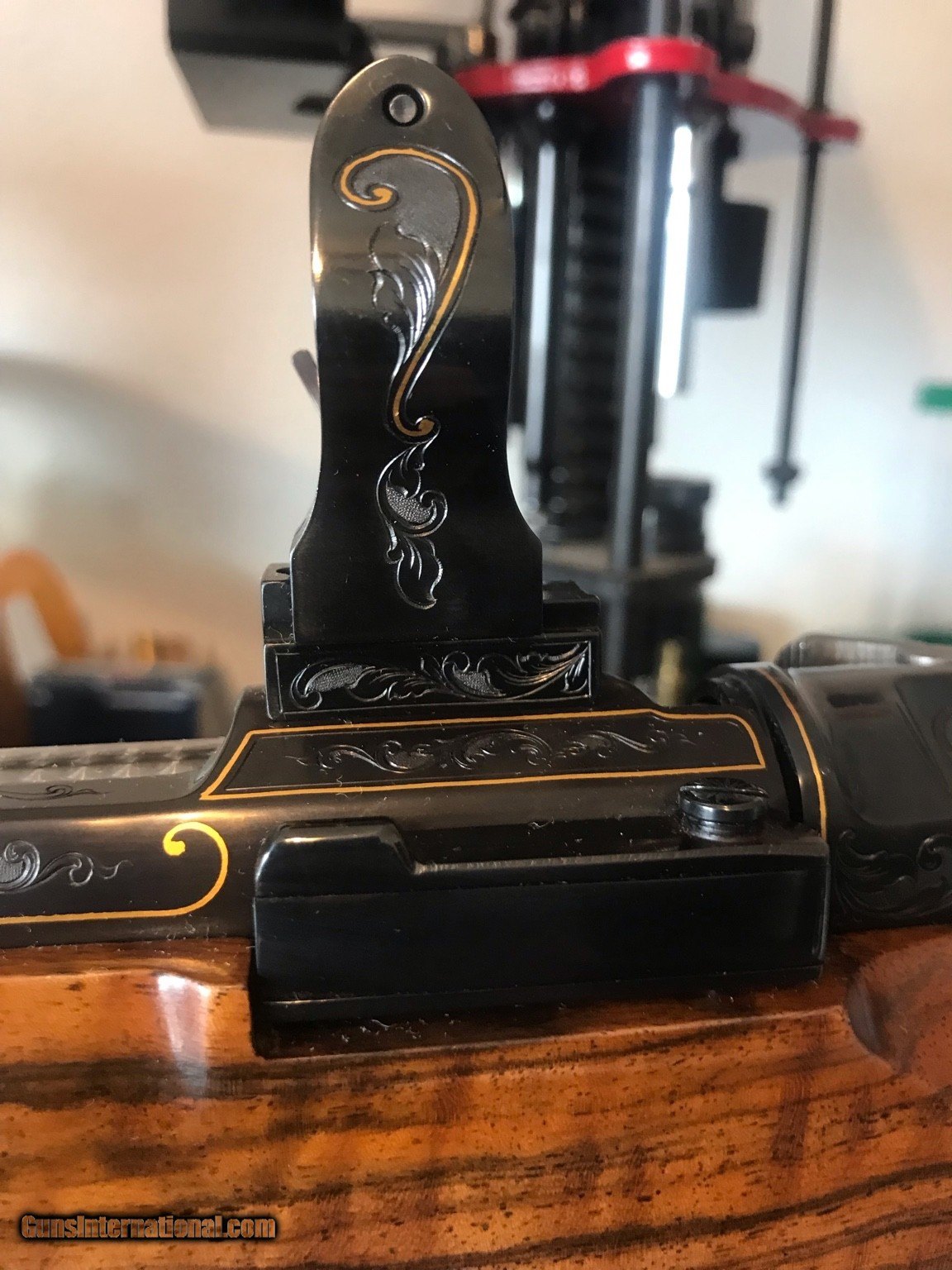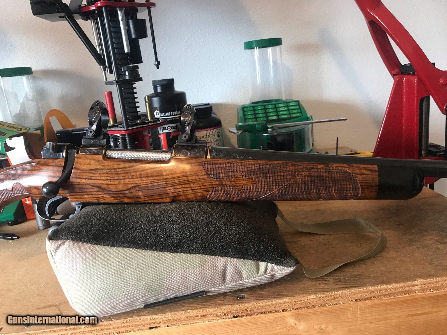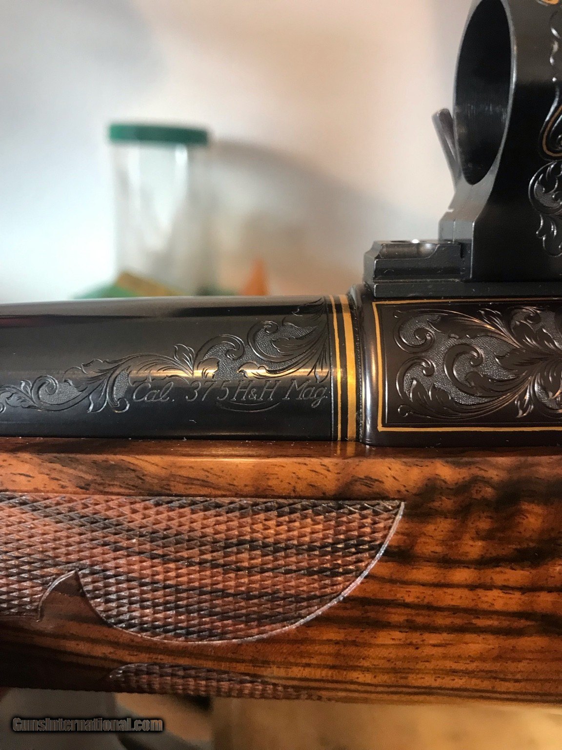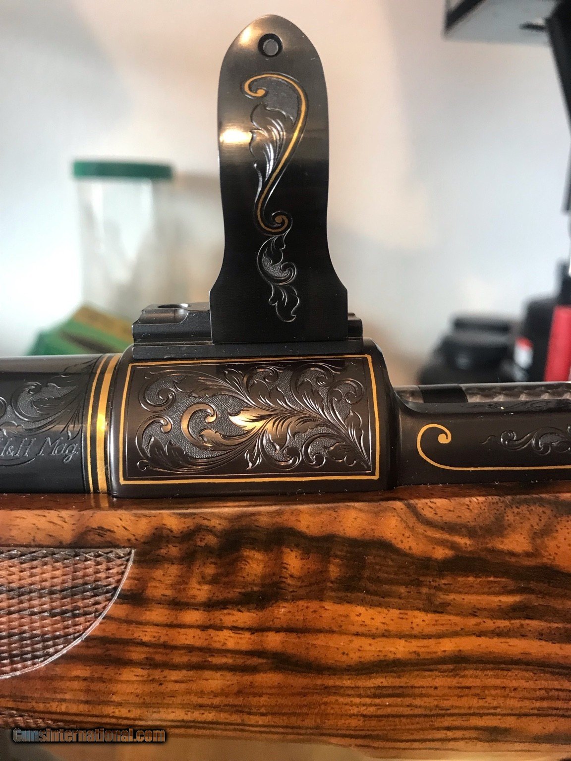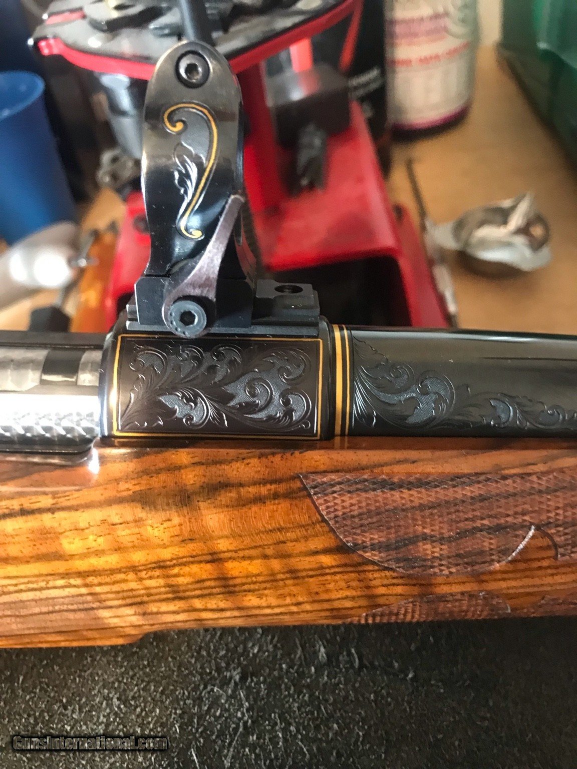 Description: Custom built incredibly engraved Mauser in 375 H&H. Must see pictures to believe. Grade 6 wood. 23 inch barrel 13 3/4 LOP. Sweet shooting soft recoiling rifle. 1 inch scope rings. $8,250 to have built. $5,200 shipped within US SOLD Rifle Caliber: .375 H&H Magnum |