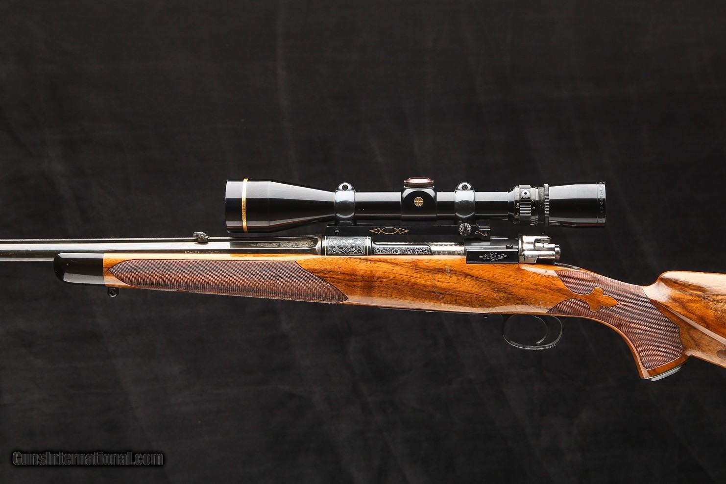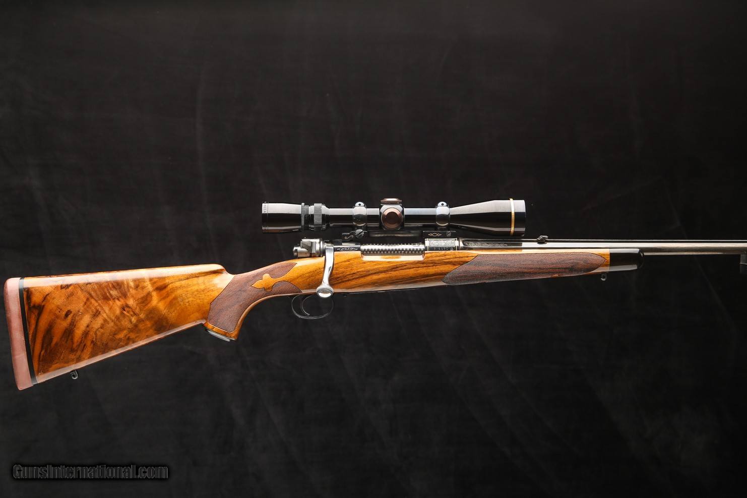 Description: Mauser 98 .244 Rem, this custom rifle was built by Dale Goens using a beautiful piece of highly figuered English walnut, the stock is fleur de Lis checkered, an ebony forend tip, Contral rings and bases, the rifle is fully engraved and gold inlayed by we believe tommy Kaye, a shadow line cheek piece, features a full length solid rib, a 1" red rubber butt pad, an engraved steel grip cap, front and rear ball sling studs, and topped with a Leupold vari-X III 3,5-10X42 scope. Rifle Caliber: .244 Remington Price: $4,795.00 Contact Seller |