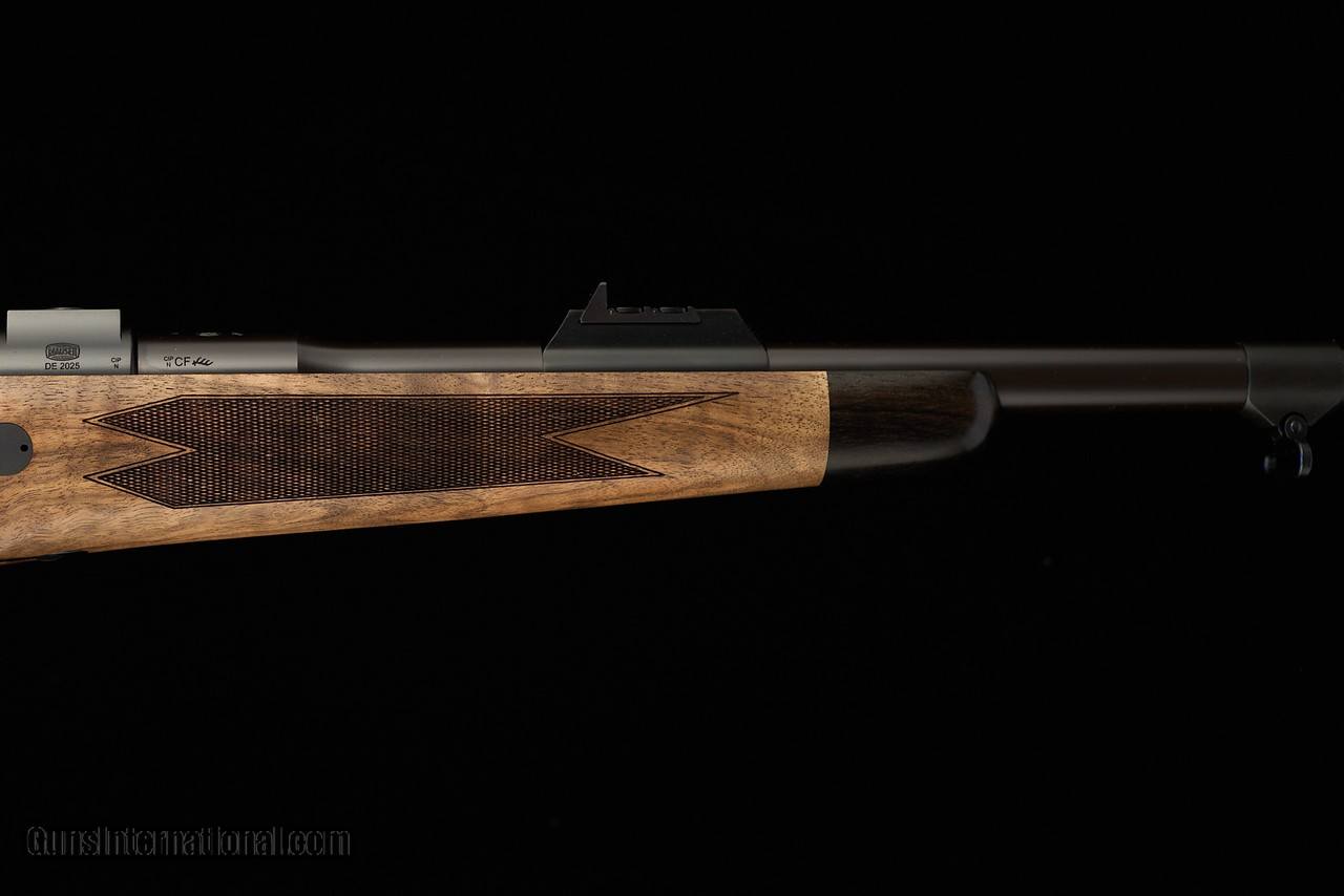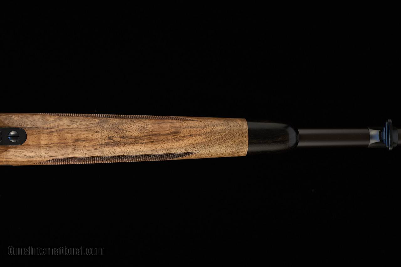 This is Das Original Mauser 98 chambered in .375 H&H, featuring a less expensive and frankly much more attractive blued finish on the bolt and extractor. Featuring a double square bridge Magnum Mauser action of the same dimensions as the legendary prewar actions, one of the modern upgrades is the integral bases machined into the double square bridges to accommodate Recknagle swing-off scope rings—which return to zero after scope removal for travel, for example. The stocks are made from Turkish walnut officially classified by the Mauser factory as Wood Grade 5, but frankly this rifle should have been graded as a 7. Depending upon wood density, the weight is just under 10lbs.
