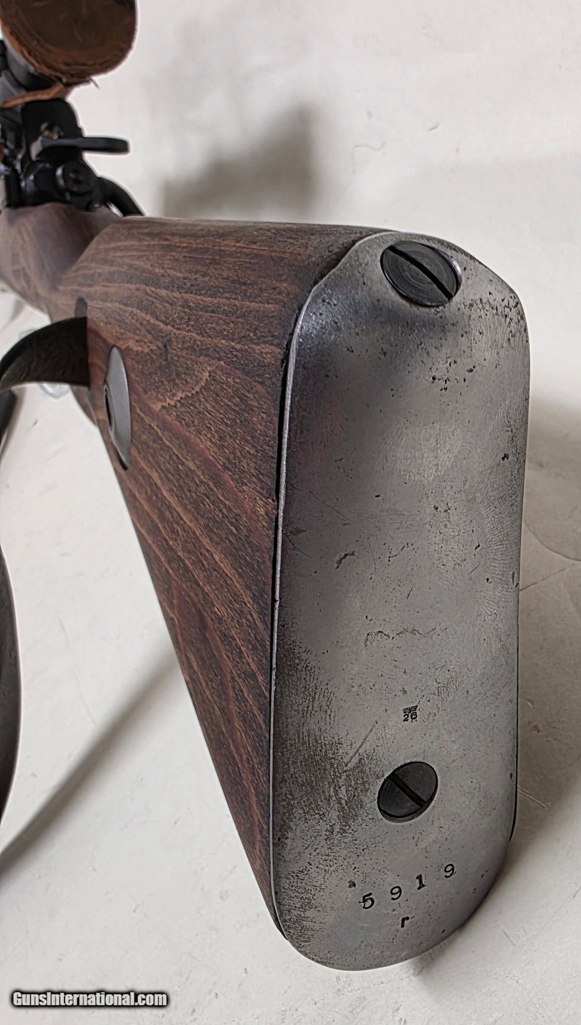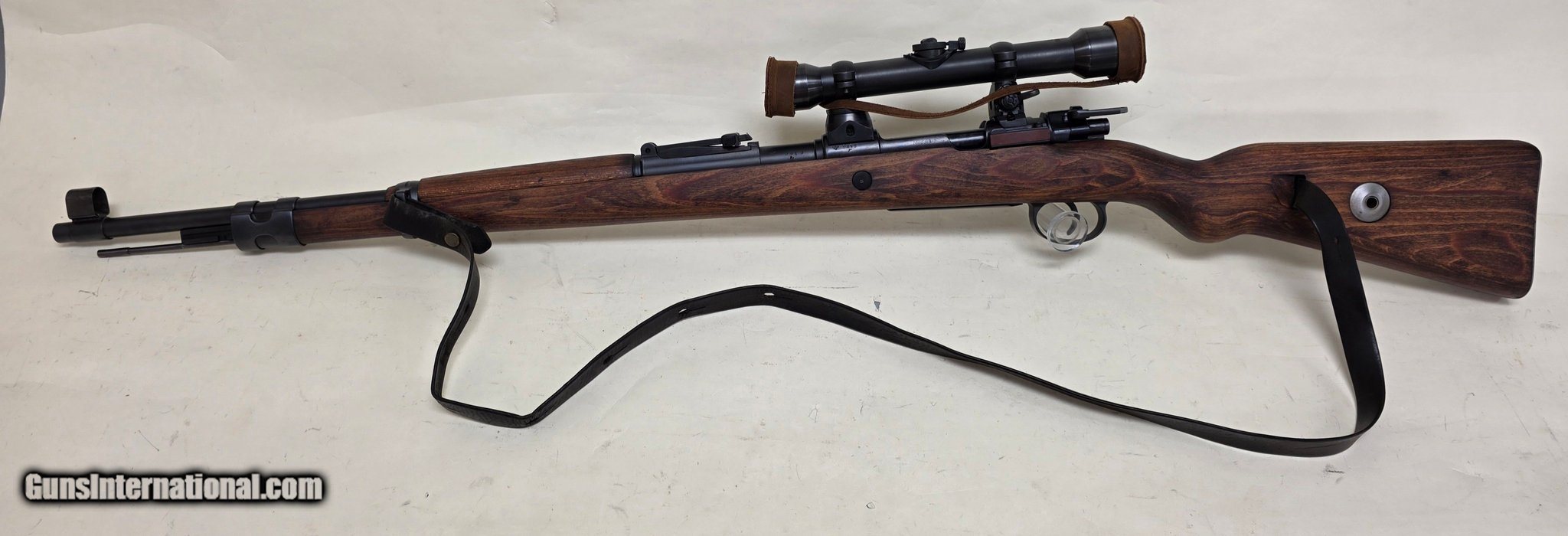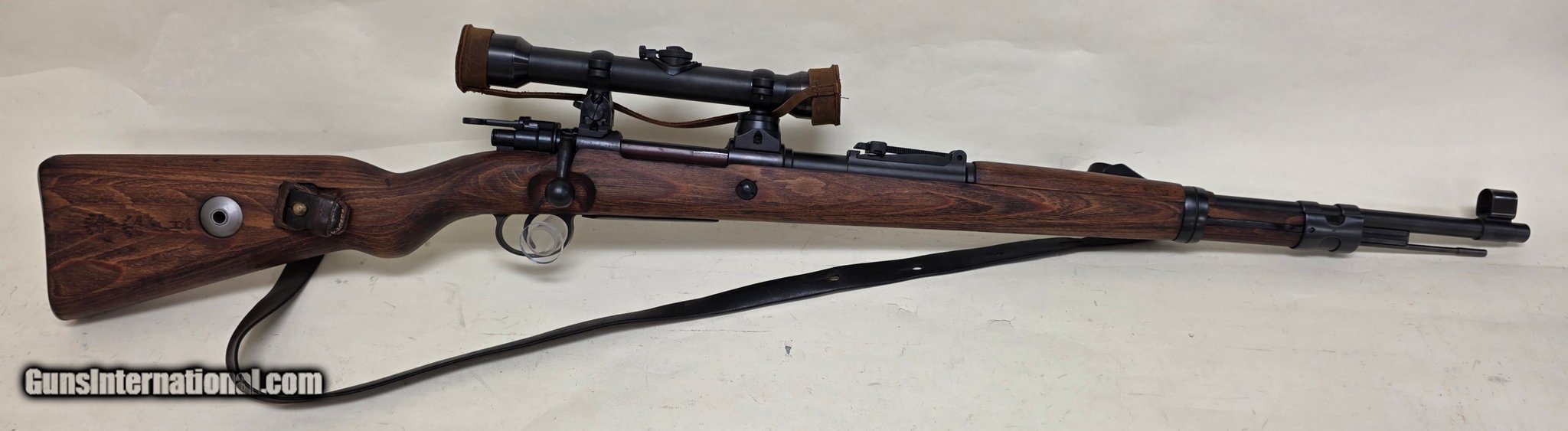 Description: Guns Listing ID: 529549 Extremely cool reproduction of a Mauser K98k high turret. Reproduction bases and scope, includes sling and scope cap. Gun is in good shape with a very clean bore and crown. Bolt, cocking piece, rear sight, floor plate, front cap butt plate and front barrel band match. Rear bands appear to match, safety appears reproduction like bases and scope, no numbers. Stock DOES NOT match gun. Gun appears to have been arsenal refinished at some point with some light pitting to metal on bolt handle, receiver, and ejector box. Birds appear to have been struck on metal, stock components and rear sight slider waffenamt is \"26\", stock shows \"655\", all other waffenamts appear illegible due to refinishing. SOLD Manufacturer: MAUSER Model: Mod. 98 Caliber Info: 8X57MM MAUSER Condition: Used - Non-Certified Barrels: 23.6 Action: BOLT ACTION Finish: blue |