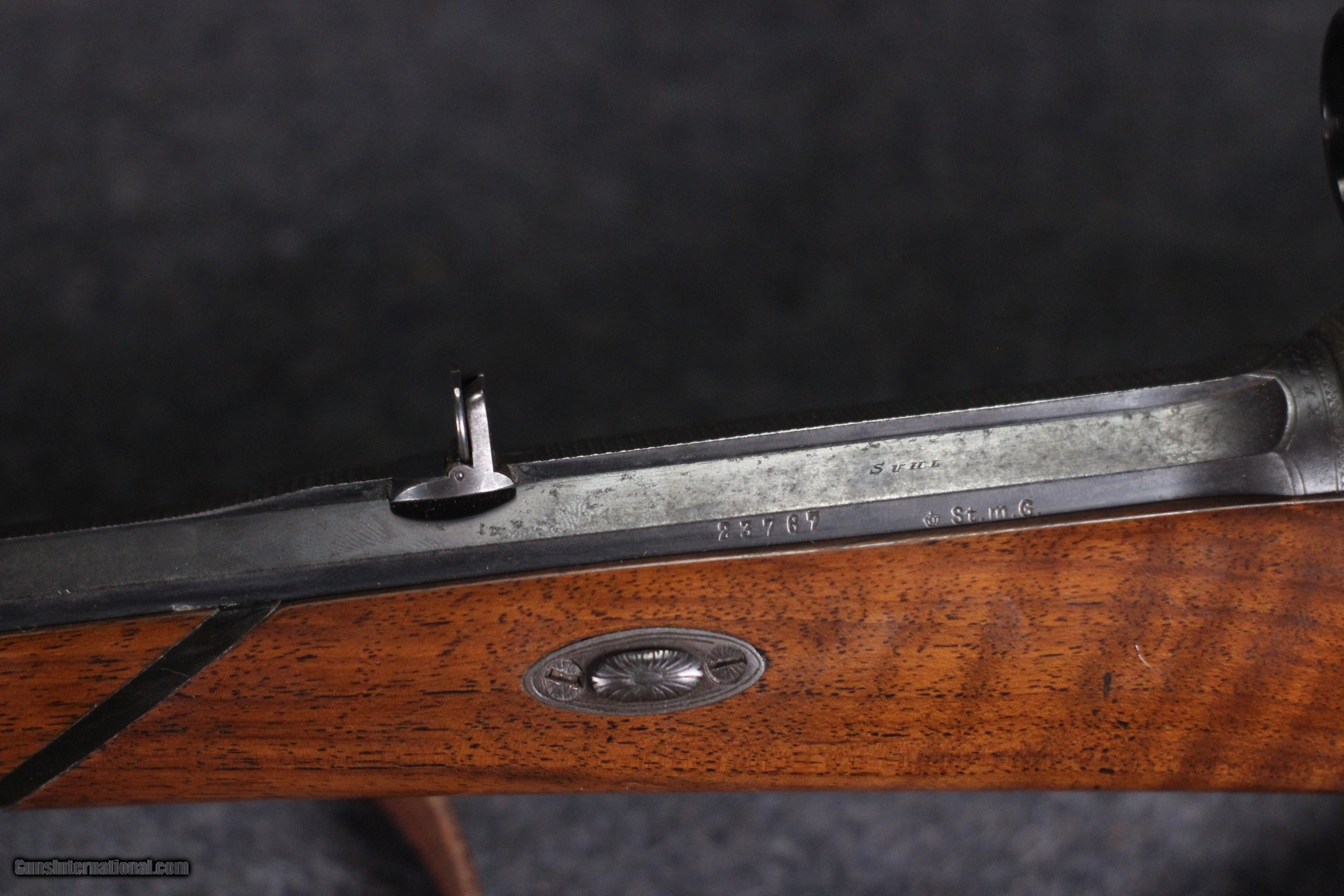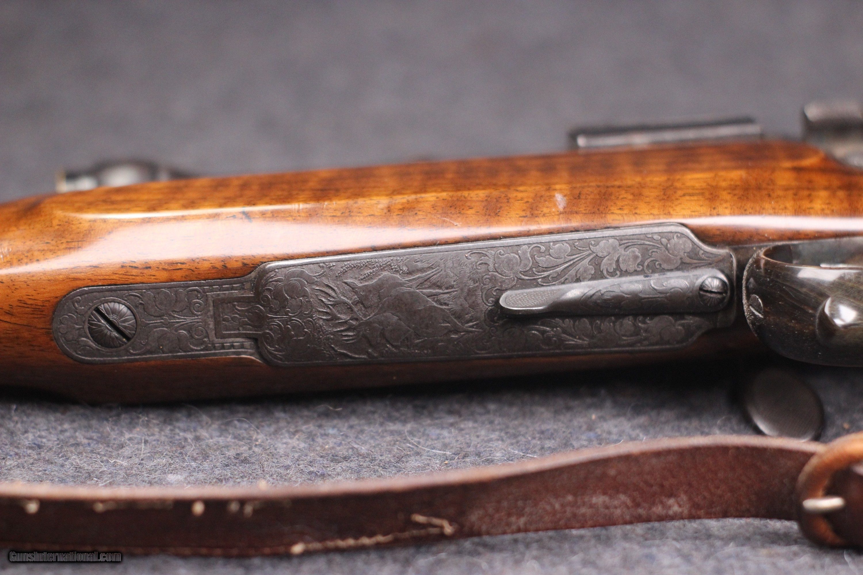 Description: 24in octagon to round full ribbed barrel Original claw mount scope system, Dr. Geard scope included Full Mannlicher stocked with fiddle backed european walnut Split forearm, schnable horn tip Side panels on action and horn grip/buttplate Fully engraved reciever and floor plate/trigger guard With medium scroll and game scene Case colored reciever and bolt, rust blue barrel 1920s manufactured All original 7lbs 13oz +$65 shipping SOLD |