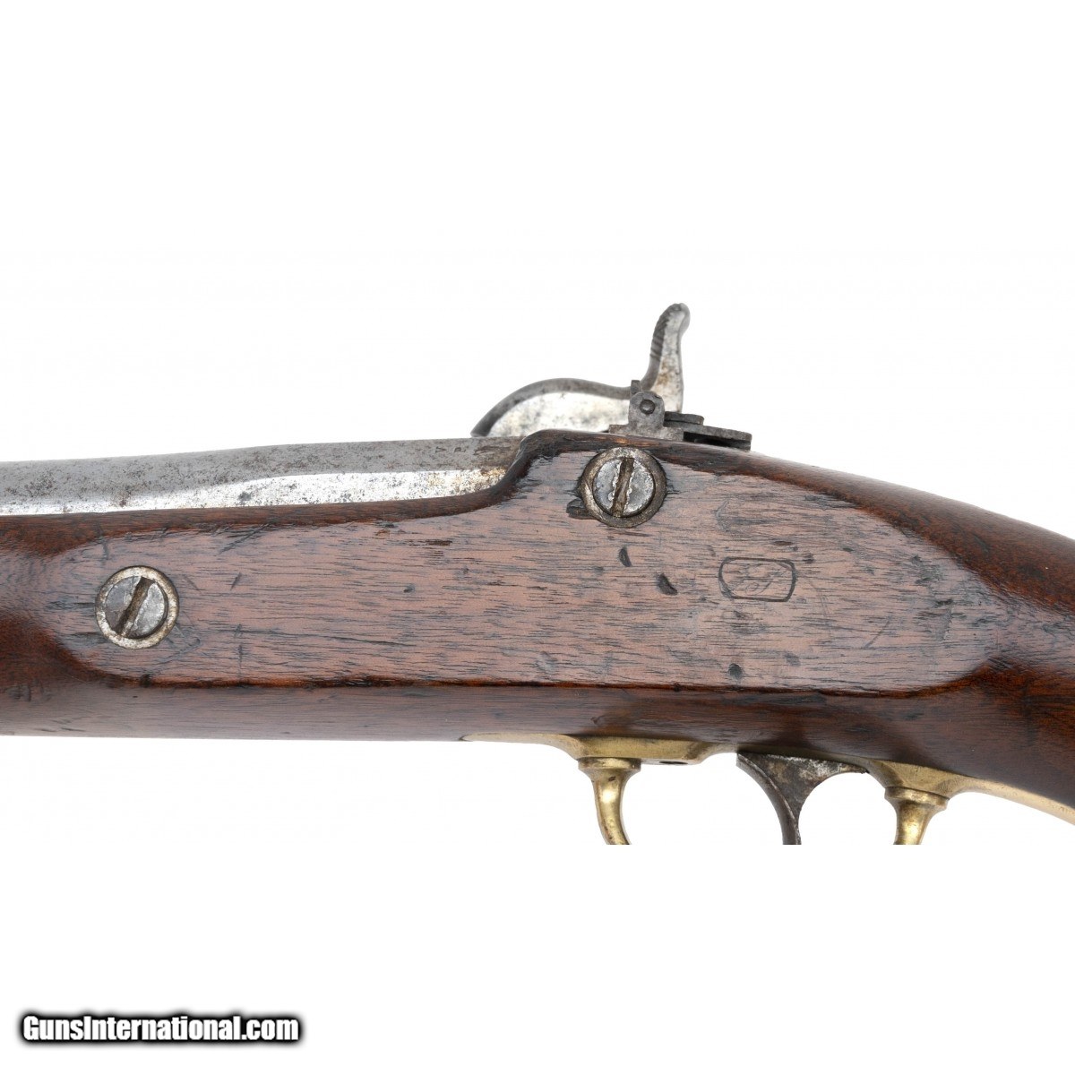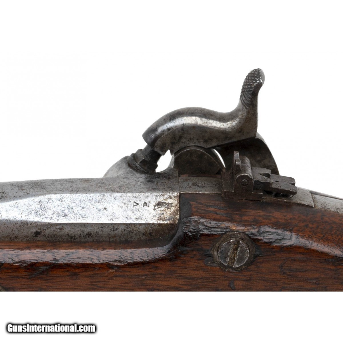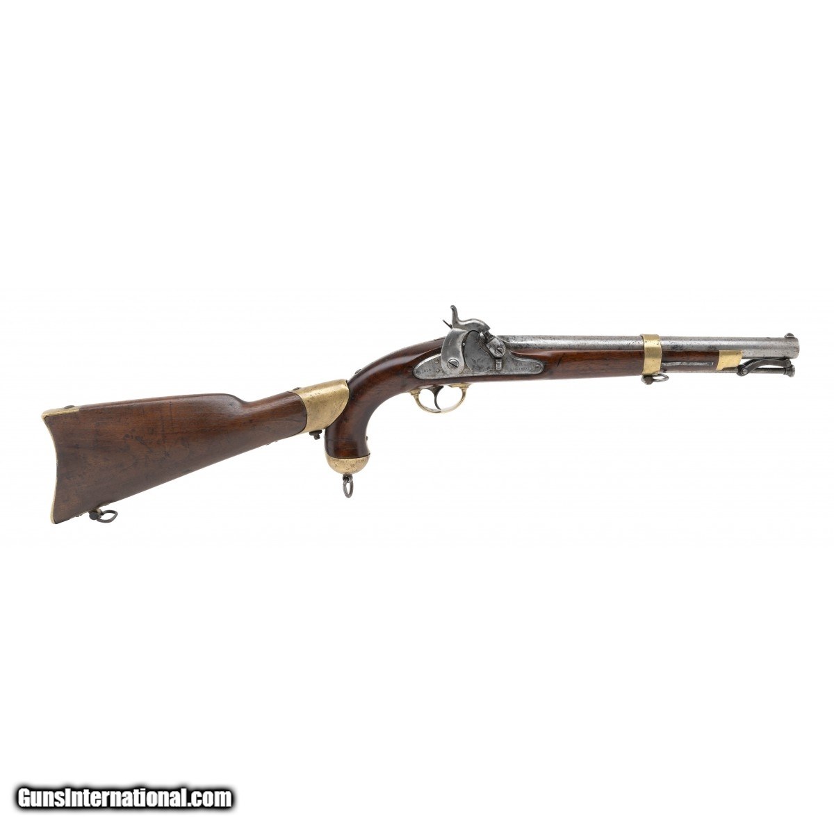 Description: " The Maynard tape-primed 58 caliber percussion Model 1855 pistol-carbine was the companion piece to the Model 1855 rifle musket, the Model 1855 rifle, and the Model 1855 carbine. Springfield Armory manufactured 4,021 in 1855 and 1856. They were used through the Civil War. The 12"" round barrel on this example has a very good bore with strong rifling and some firing erosion. The 12"" barrel has the V over P over eagle at the breech and is dated 1855. It is mostly bright with scattered freckling. The blade front sight and two-leaf rear sight are present. the lock is marked U.S. over SPRINGFIELD at the front and 1856 at the tail. The Maynard tape primer door has the eagle with the left side strongly struck and right side weak. The lock and hammer are bright with scattered spotting. The brass nose cap, barrel band, trigger guard, and butt cap have and even age patina. The captured ramrod and swivels are present. The stock is very good with an old age crack toward the butt cap, light wear, and a visible cartouche. The butt cap is numbered 17. The shoulder stock is very good with the brass having a even age patina. The swivel is present. The stock has no chips or cracks and light to moderate issue wear. The stock attachment is numbered 17. It is unusual to find a gun that has matching numbers on the butt cap and stock attachment. The action, including the Maynard tape priming mechanism, functions correctly. This much better than average U.S. Model 1855 pistol-carbine is ready for your Springfield or Civil War collection. SOLD Antique: Yes |
