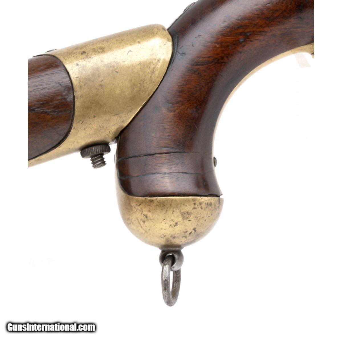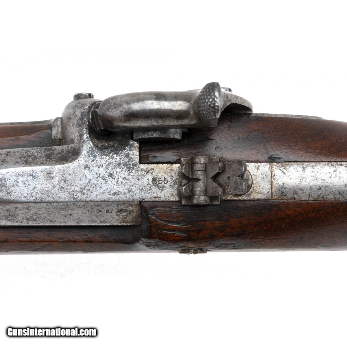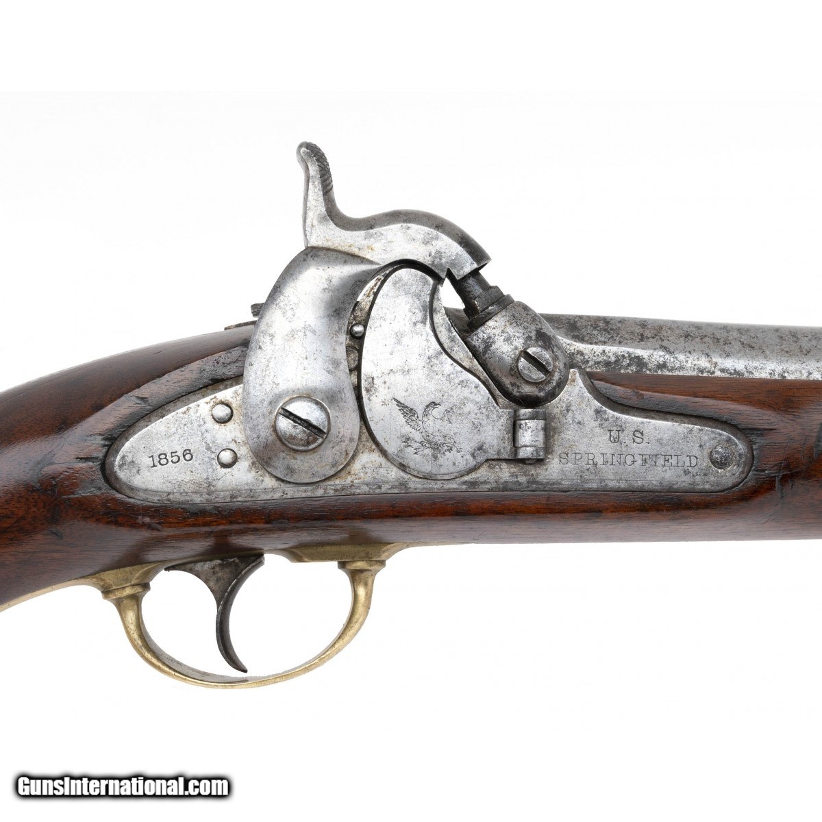 Description: " The Maynard tape-primed 58 caliber percussion Model 1855 pistol-carbine was the companion piece to the Model 1855 rifle musket, the Model 1855 rifle, and the Model 1855 carbine. Springfield Armory manufactured 4,021 in 1855 and 1856. They were used through the Civil War. The 12"" round barrel on this example has a very good bore with strong rifling and some firing erosion. The 12"" barrel has the V over P over eagle at the breech and is dated 1855. It is mostly bright with scattered freckling. The blade front sight and two-leaf rear sight are present. the lock is marked U.S. over SPRINGFIELD at the front and 1856 at the tail. The Maynard tape primer door has the eagle with the left side strongly struck and right side weak. The lock and hammer are bright with scattered spotting. The brass nose cap, barrel band, trigger guard, and butt cap have and even age patina. The captured ramrod and swivels are present. The stock is very good with an old age crack toward the butt cap, light wear, and a visible cartouche. The butt cap is numbered 17. The shoulder stock is very good with the brass having a even age patina. The swivel is present. The stock has no chips or cracks and light to moderate issue wear. The stock attachment is numbered 17. It is unusual to find a gun that has matching numbers on the butt cap and stock attachment. The action, including the Maynard tape priming mechanism, functions correctly. This much better than average U.S. Model 1855 pistol-carbine is ready for your Springfield or Civil War collection. SOLD Antique: Yes |