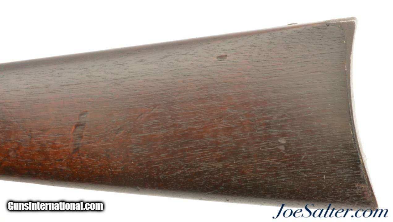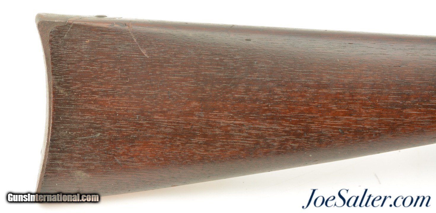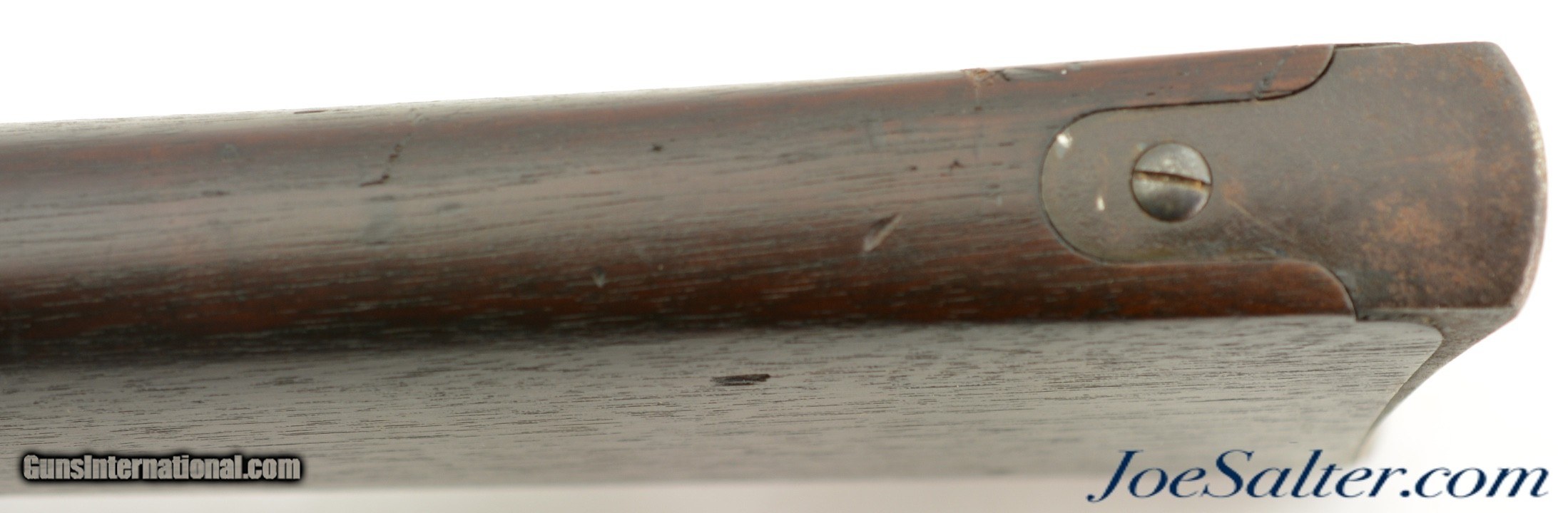Description: Serial #12137, .50 Caliber, 20" barrel with an excellent, bright bore. This is a handsome carbine that has 90-92% of the original blue remaining on the barrel with some mild fading at the muzzle and slight silvering along the edges of the octagonal breech. Thin patches of plum-brown freckling are also present along parts of the barrel. The frame and lever retains traces of muted original color case-hardening, with the balance turned to a mixed gray and plum-brown color. The hammer retains some of the original blue finish, with speckled brown on the balance, while the sling bar and ring have some bright gray on the contact points with small impact marks and mild freckling throughout. The walnut buttstock is in very good-fine condition with only minor handling marks and surface blemishes marring the original oil finish, and the cartouches on the left side are crisp and clear. The barrel lock-up is tight and the mechanism functions flawlessly. This is a great Civil War carbine in fine-near excellent condition. Antique; SOLD Antique: Yes |
