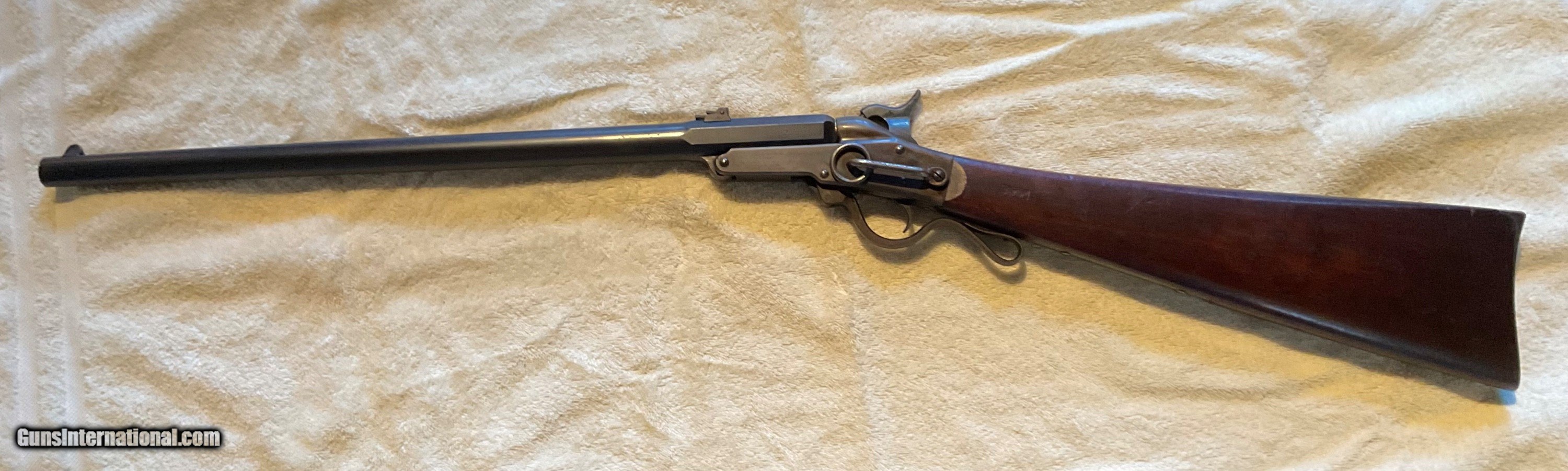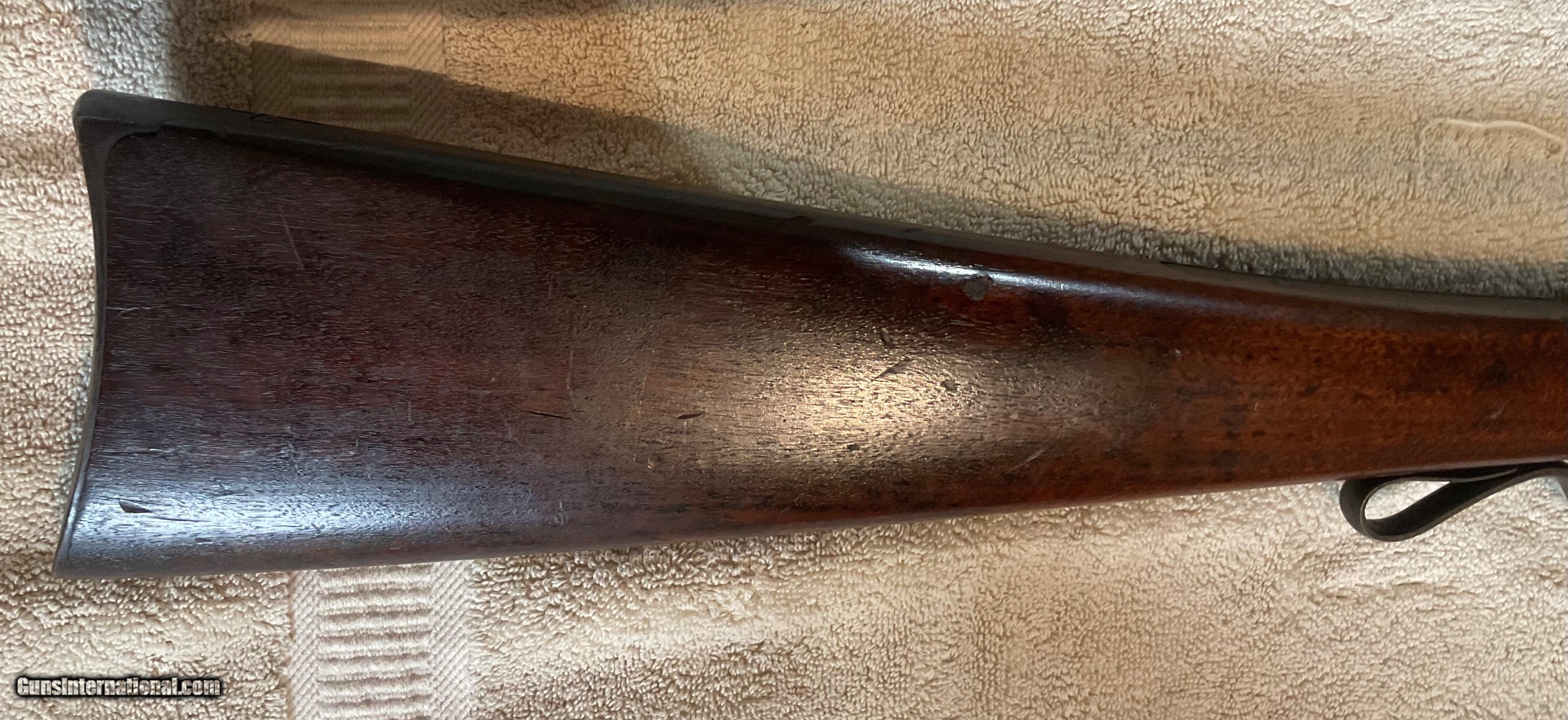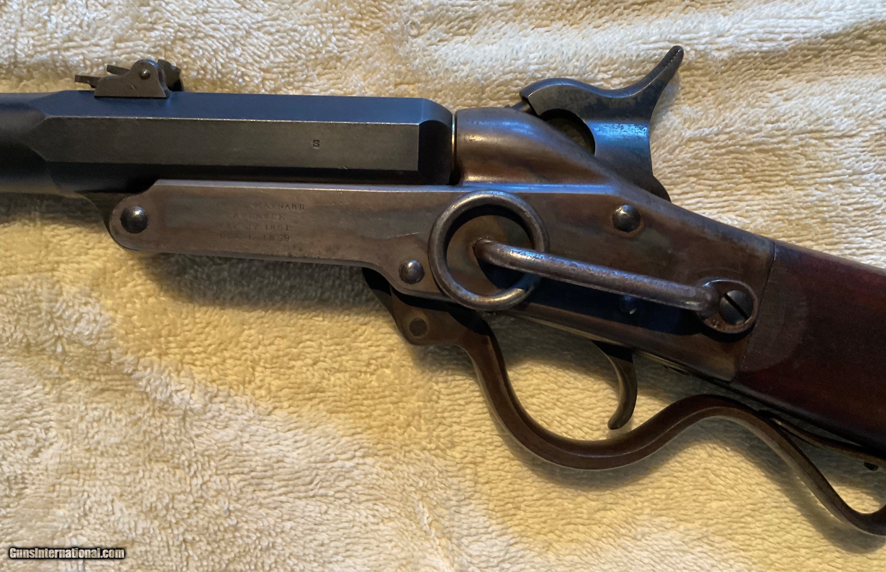Description: This antique, all original 2nd Model Maynard Carbine is in excellent condition, and was probably unissued. The 20" barrel retains most of its bluing and the bore is pristine, showing very little use. The receiver shows the majority of its original color case-hardened finish. All of the original blued receiver screws are present, with no marred slots. The wood to metal fit is excellent. The nipple has not corroded, and is clear to the chamber. The hammer and trigger springs are strong, and the lever locks the action securely. This carbine functions perfectly, and is in better condition with more remaining color than many you will find. I will send additional photos of any specific areas of interest upon request. Included is a reproduction brass case, and a copy of the 1860 Catalog. The 1860 Catalog is entertaining and contains a lot of interesting Maynard information and historical facts. This is a high quality example at a reasonable price. SOLD Antique: Yes Rifle Caliber: .50 |