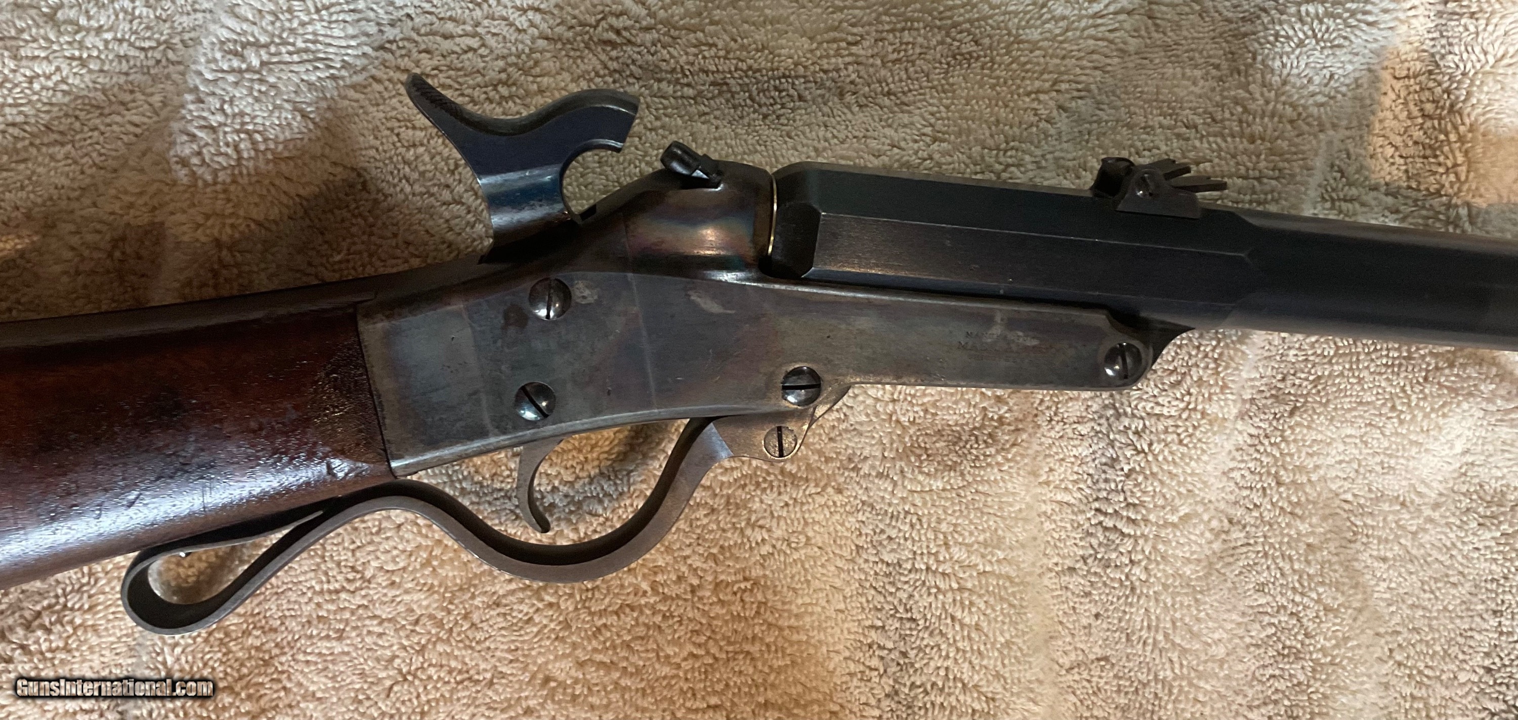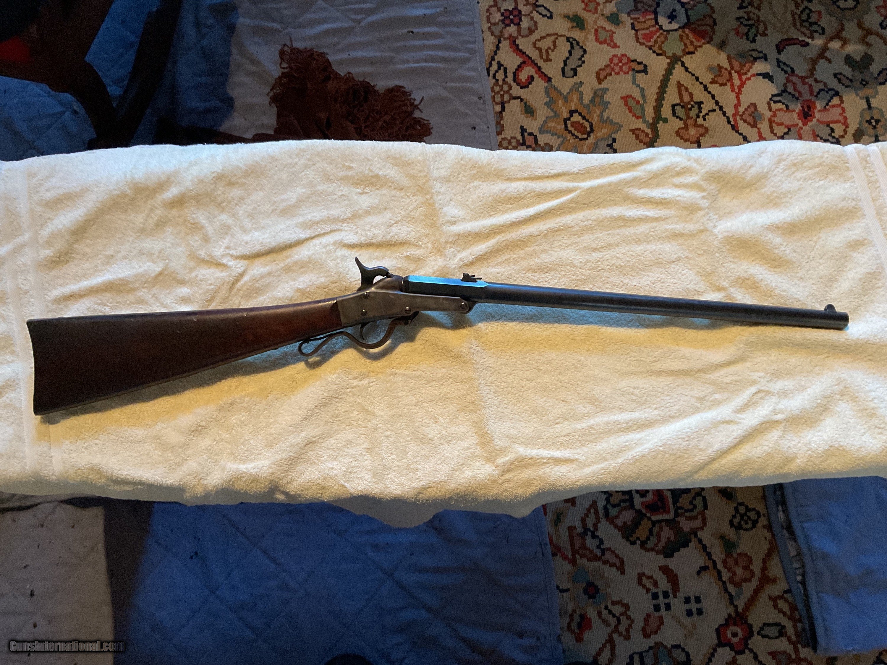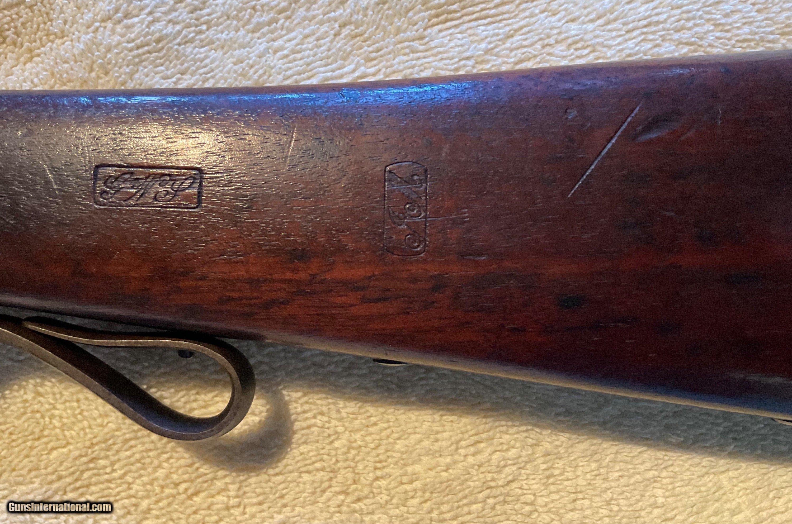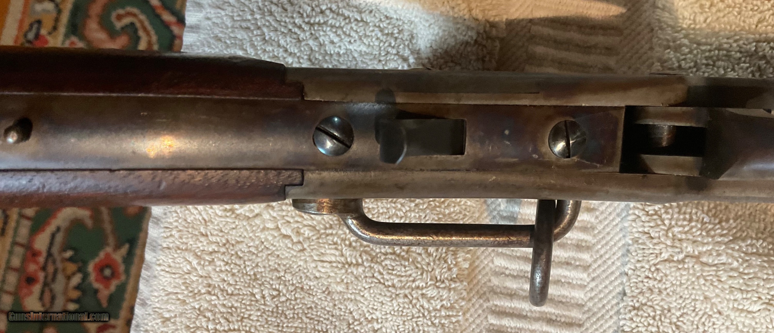 Description: This antique, all original 2nd Model Maynard Carbine is in excellent condition, and was probably unissued. The 20" barrel retains most of its bluing and the bore is pristine, showing very little use. The receiver shows the majority of its original color case-hardened finish. All of the original blued receiver screws are present, with no marred slots. The wood to metal fit is excellent. The nipple has not corroded, and is clear to the chamber. The hammer and trigger springs are strong, and the lever locks the action securely. This carbine functions perfectly, and is in better condition with more remaining color than many you will find. I will send additional photos of any specific areas of interest upon request. Included is a reproduction brass case, and a copy of the 1860 Catalog. The 1860 Catalog is entertaining and contains a lot of interesting Maynard information and historical facts. This is a high quality example at a reasonable price. SOLD Antique: Yes Rifle Caliber: .50 |