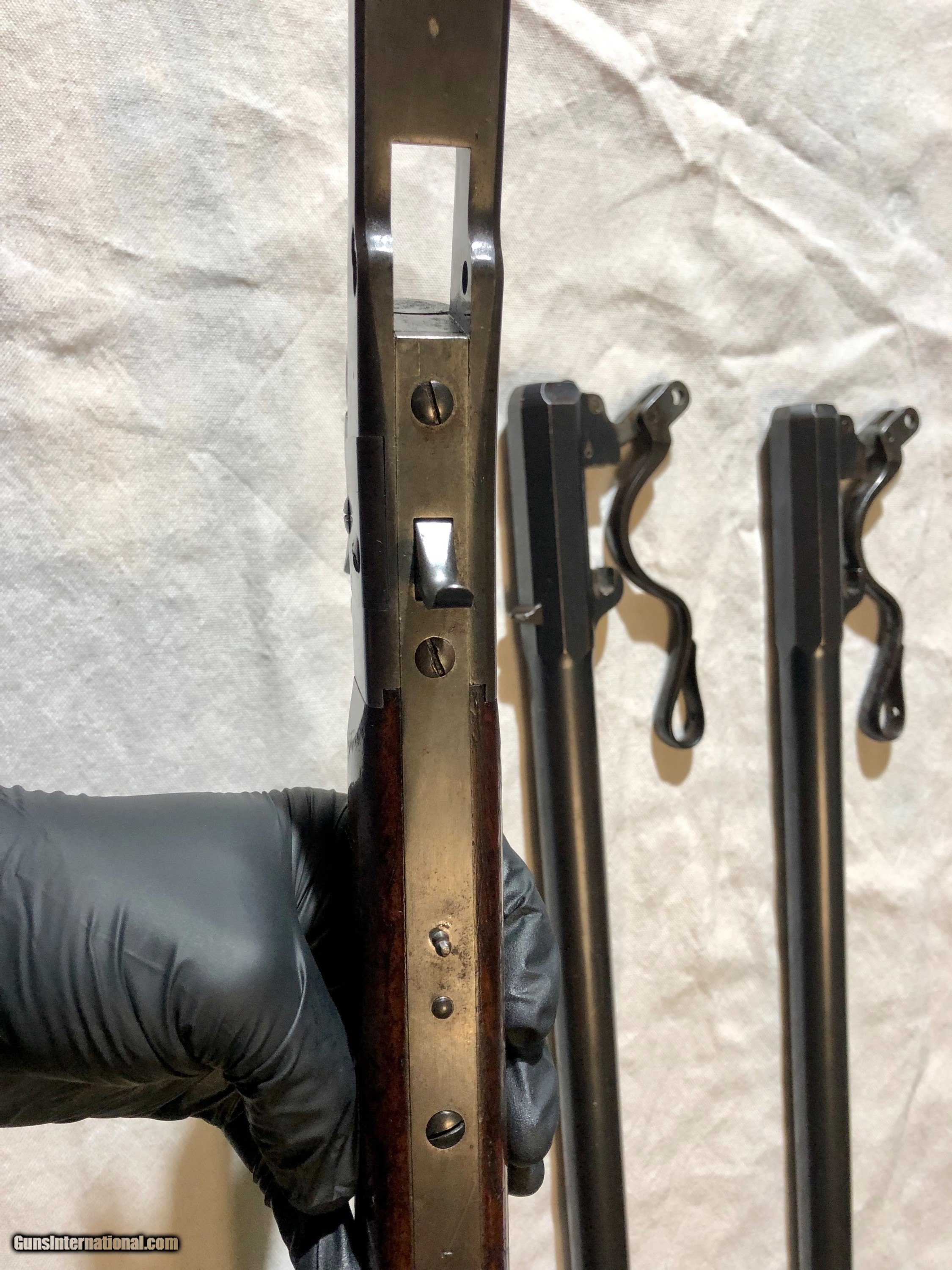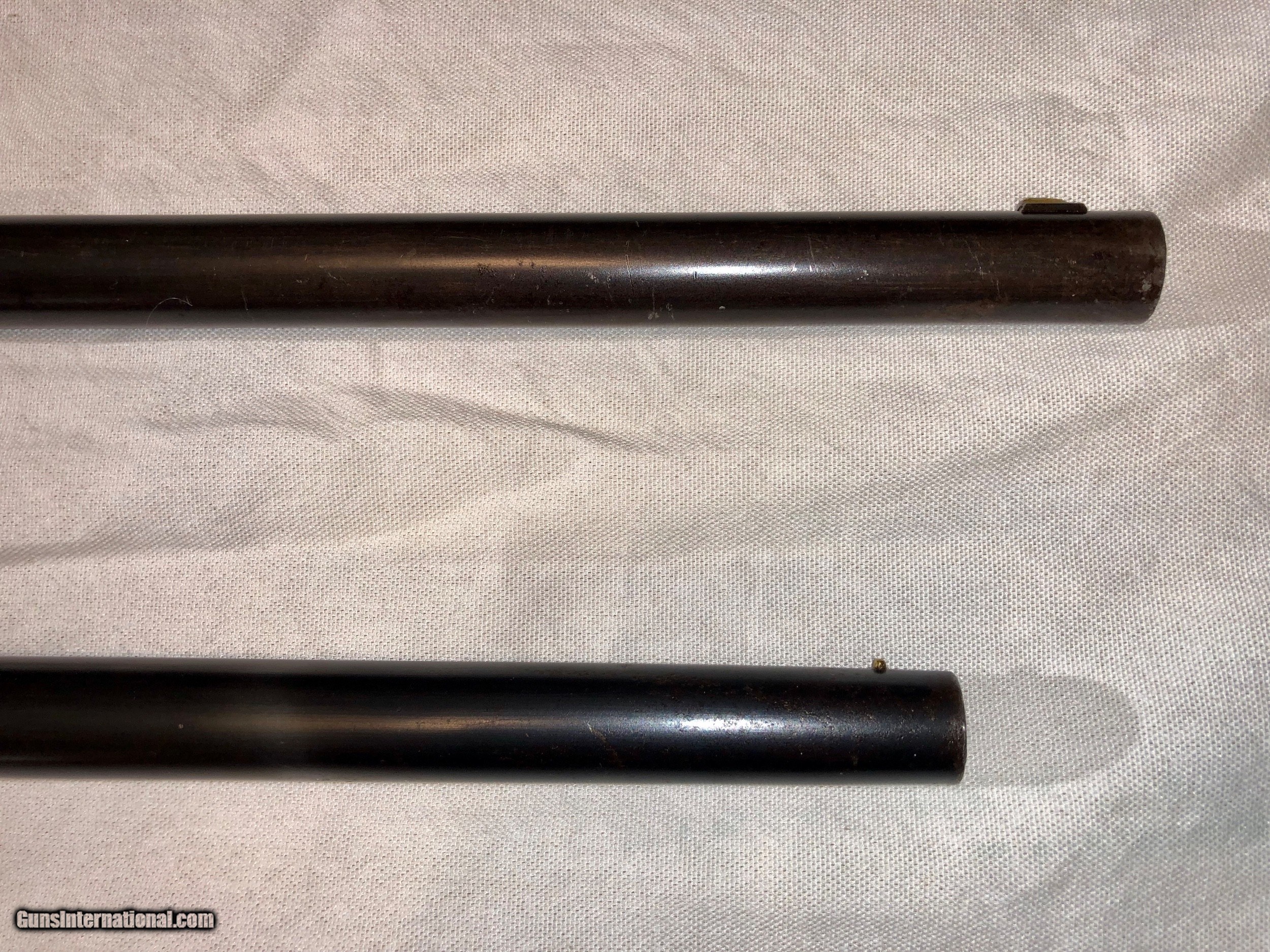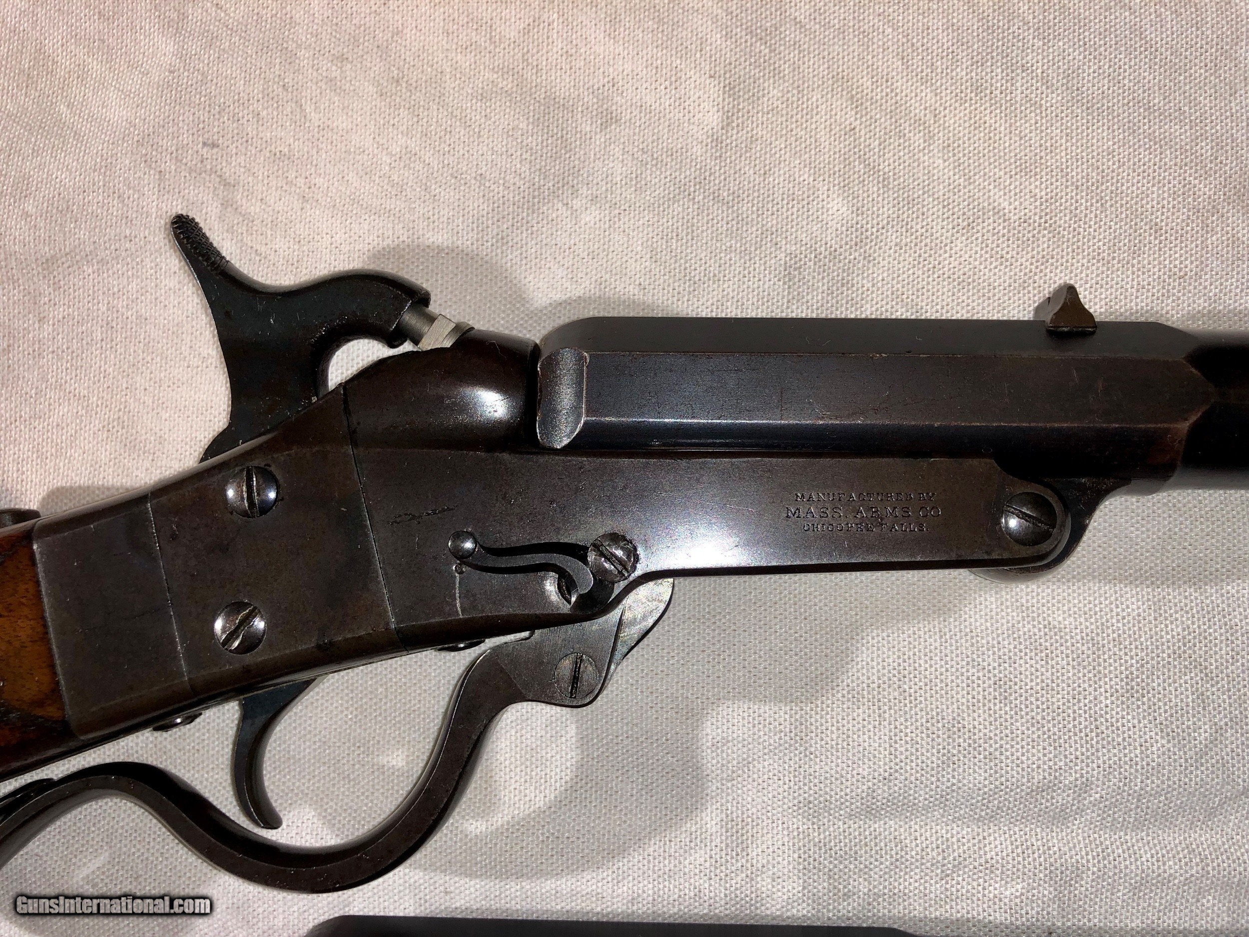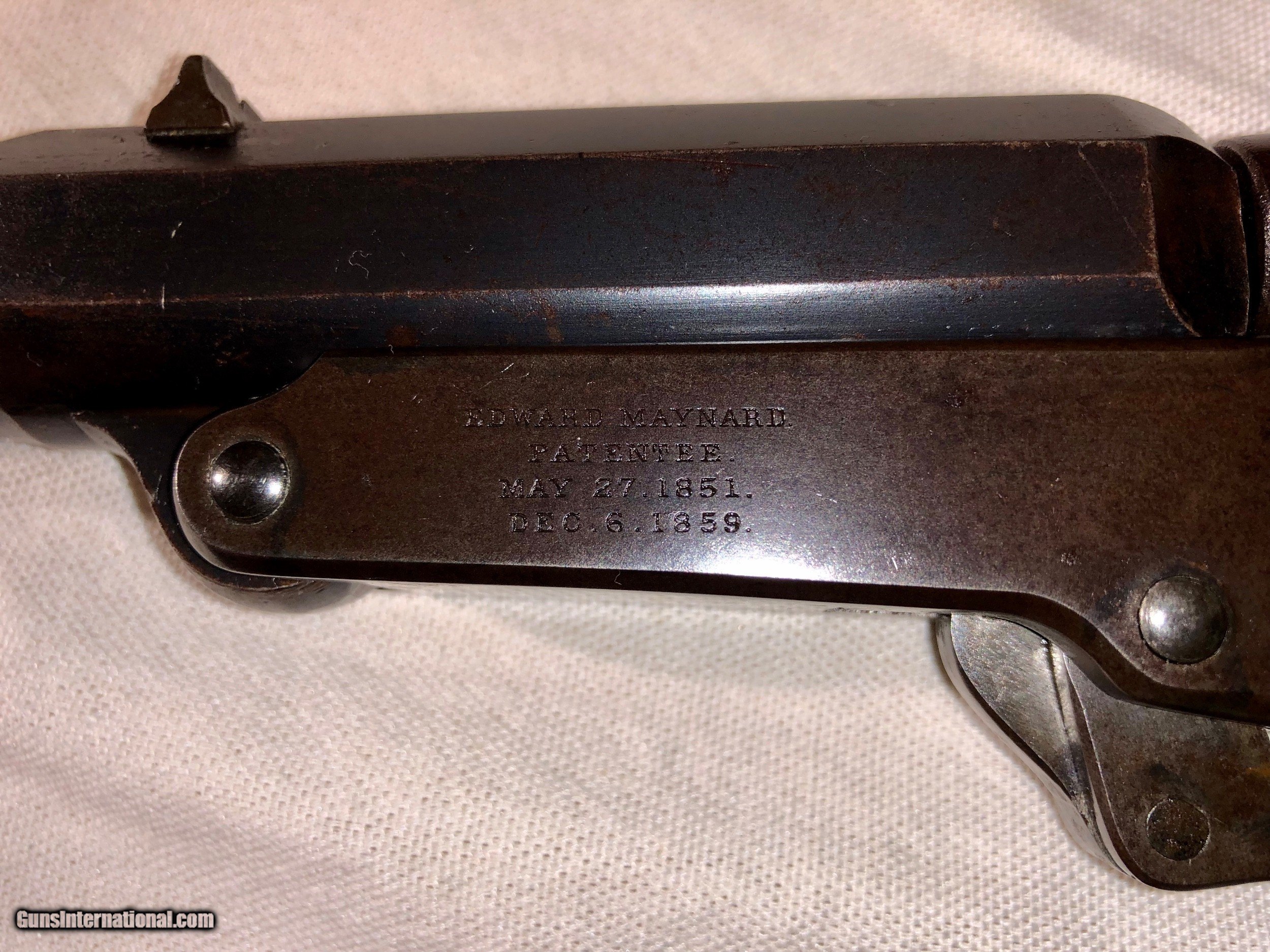 Description: A Maynard Rifle in excellent condition retaining a high amount of original blued finish. The mechanisim is excellent, and the bore's on both barrels are excellent and shiney. All serial numbers are matching on all parts and both barrels. The original nipple that came with the gun is a little battered, most of these pictures are with a modern replacement but the threading is the correct for the Maynard. I will include the original nipple as well. The caliber on the rifle is .36 and included with purchase I will send 40 cases of brass for this correct model, a correct bullet mould and a custome-made bullet sizer specificalyy for this rifle for maximum accuracy. I have shot this Maynard and it shoots nicely. Please feel free to email me with an offer or any questions. SOLD Antique: Yes |
