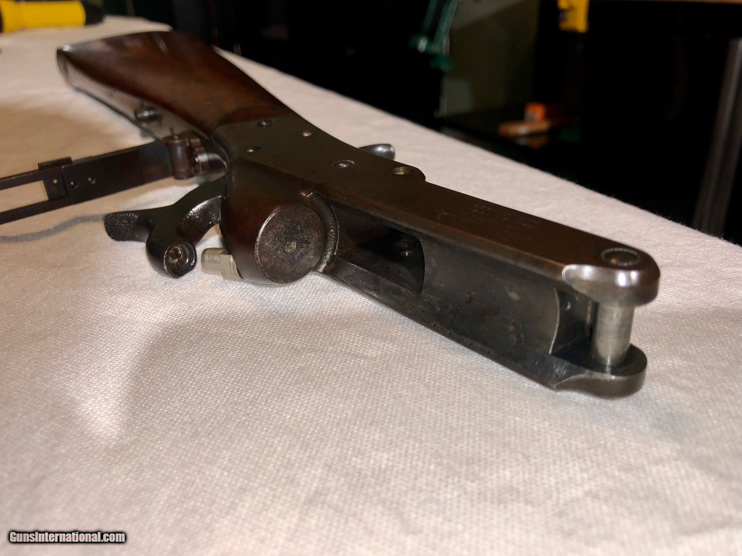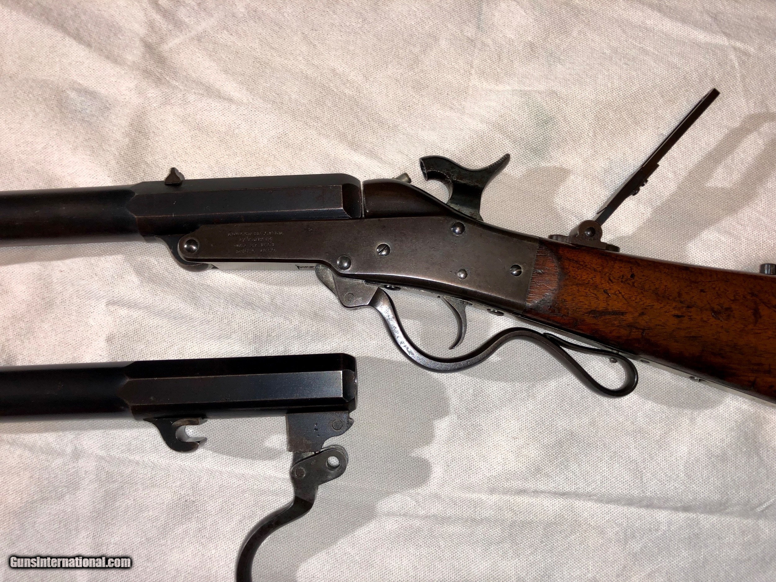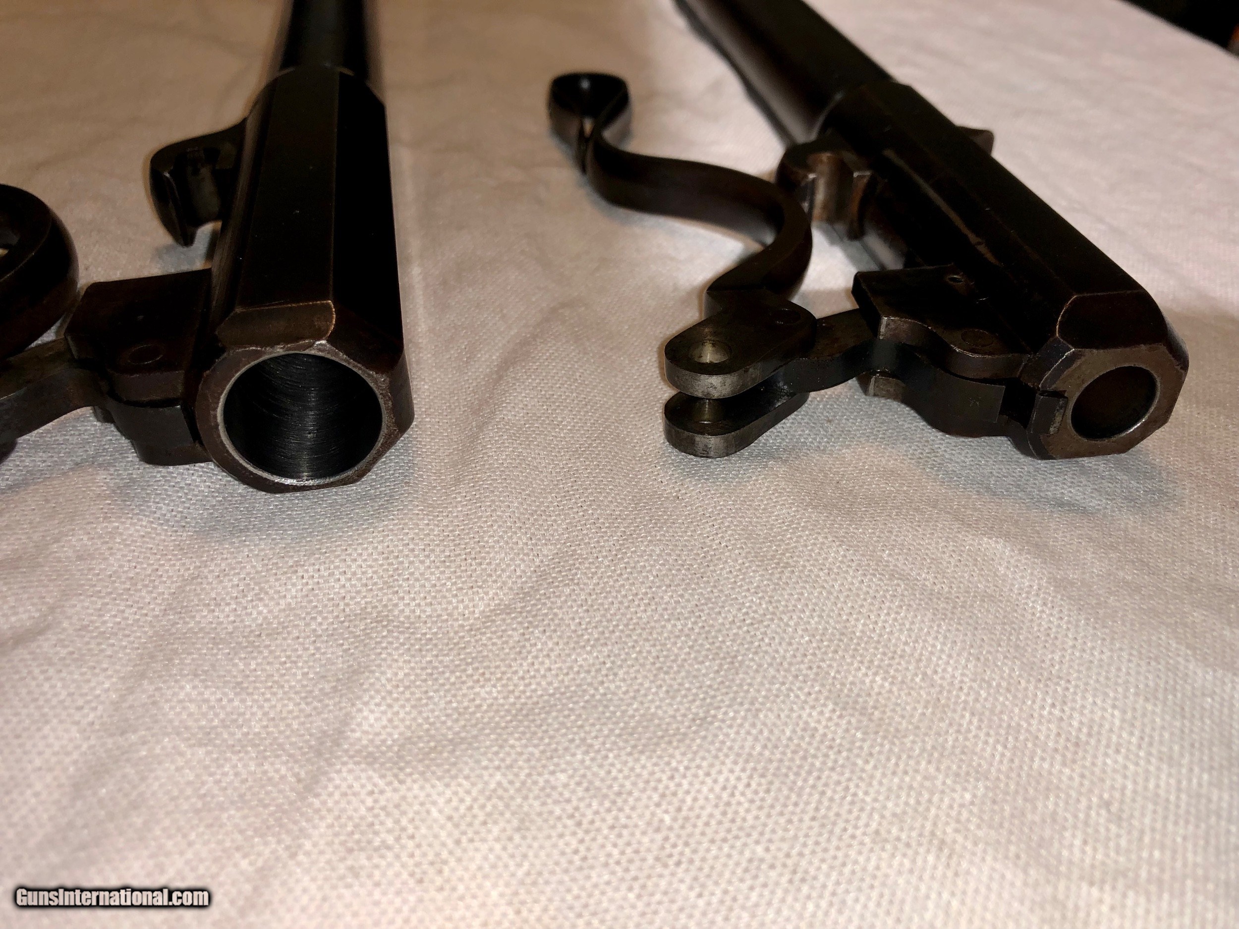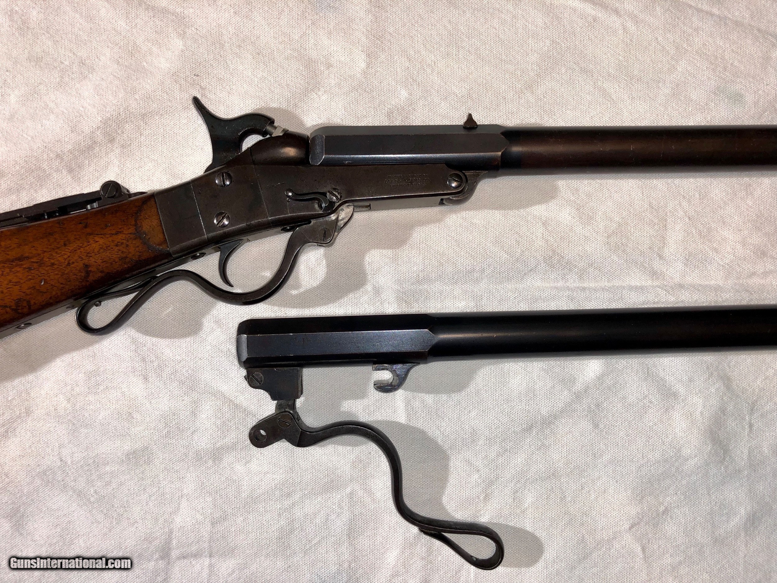 Description: A Maynard Rifle in excellent condition retaining a high amount of original blued finish. The mechanisim is excellent, and the bore's on both barrels are excellent and shiney. All serial numbers are matching on all parts and both barrels. The original nipple that came with the gun is a little battered, most of these pictures are with a modern replacement but the threading is the correct for the Maynard. I will include the original nipple as well. The caliber on the rifle is .36 and included with purchase I will send 40 cases of brass for this correct model, a correct bullet mould and a custome-made bullet sizer specificalyy for this rifle for maximum accuracy. I have shot this Maynard and it shoots nicely. Please feel free to email me with an offer or any questions. SOLD Antique: Yes |