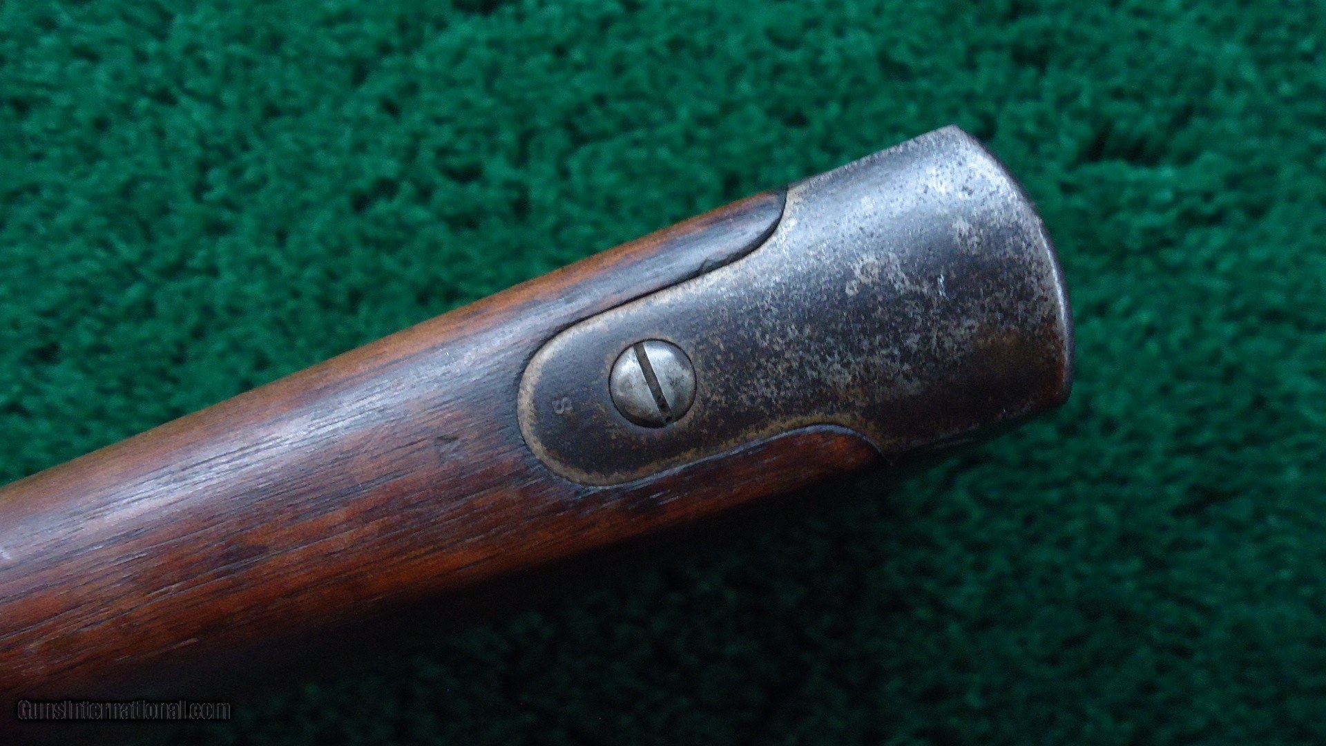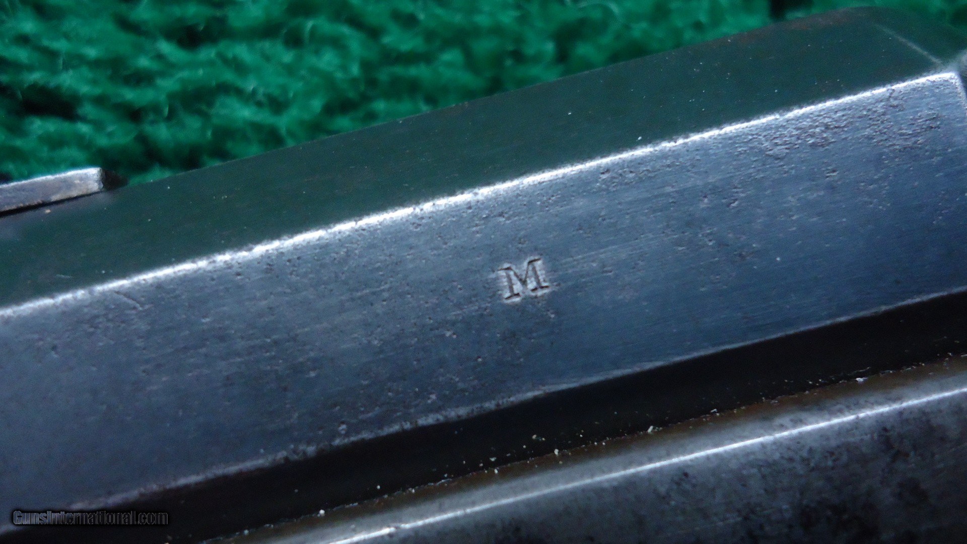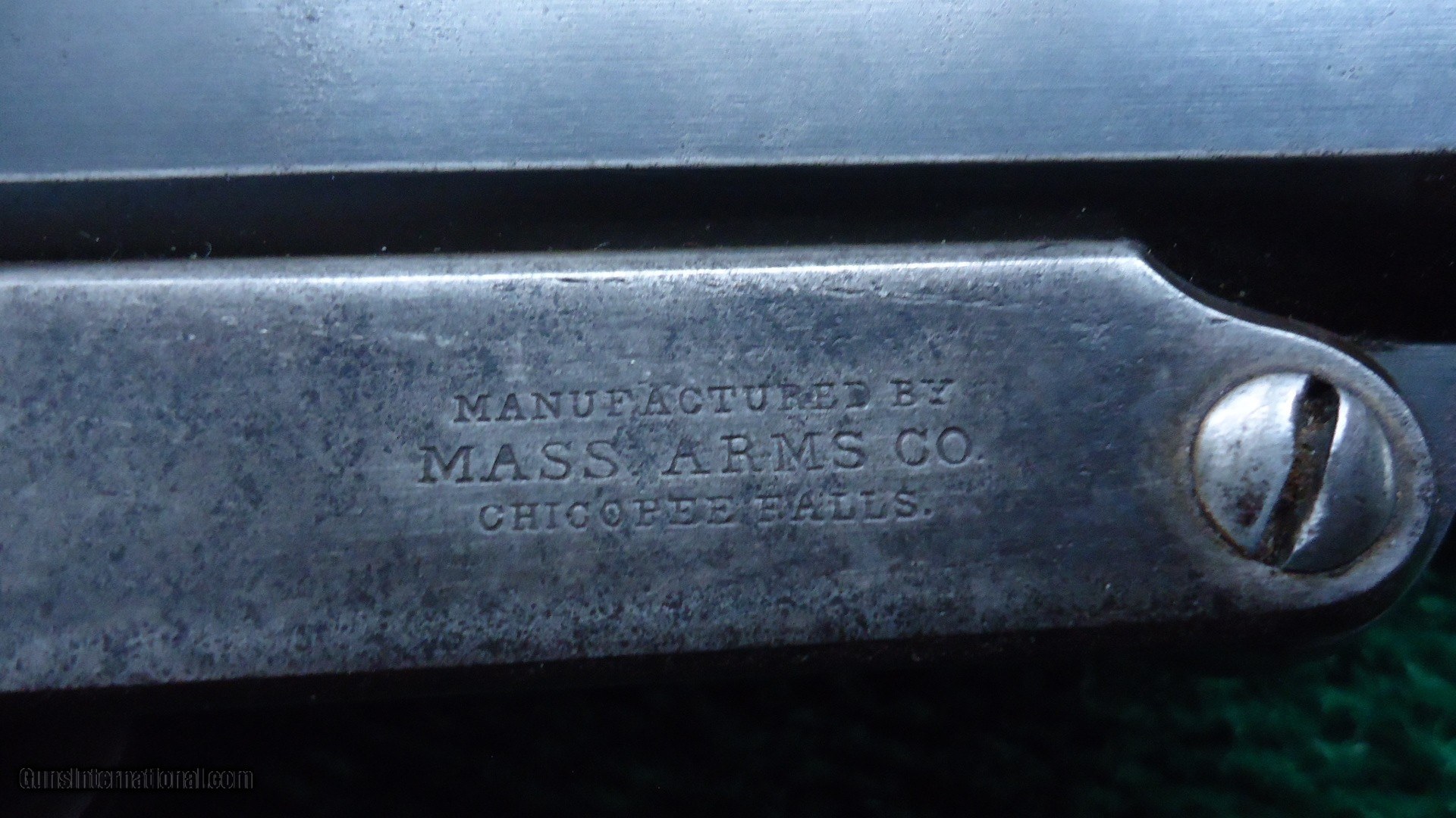 Description: Breech loading percussion carbine features a 20 inch round barrel with octagon shank chambered in 50 caliber. Original sights include a blade front sight with a 2 folding leaf rear sight. Left side of frame has saddle ring & bar with the Edward Maynard 4 line address. Right side of frame is marked "MANUFACTURED BY / MASS. ARMS CO. / CHICOPEE FALLS". The barrel retains about 75% dull fading original blue. The frame finish has faded to mottled gray patina. Stock has been lightly sanded and has scattered handling marks. Bore is bright and shiny. A good example of a Civil War carbine. Leroy Merz Antique Firearms specializes in antique and vintage Winchesters and other fine American firearms. Since 1965 Mr. Merz has taken part in the world of firearms and has been a contributor to many well known reference books. We have hundreds of additional guns in every price range at our home online. Search for Merz Antiques in google. SOLD Antique: Yes |