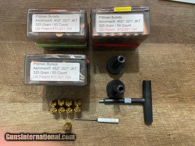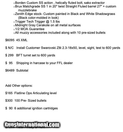 Description: This is truly one of the most accurate guns I have owned and certainly one of the most accurate hunting rifles you can buy. I have 2 load recipes that I can provide to the buyer but the top end load is a 325 grain Pittman custom bullet running just over 3100 fps (not a typo). That load prints 1/4 MOA or better at 100 yards and the scope has ballistic turrets set to 600 yards of data. We have easily run 3" groups at 600 yards. The identical brother to this gun has taken several Cape buffalo and many long distance big game on TV hunting shows. There is plenty of power and more accuracy than can be held in the field. I have about 140 of the custom bullets sized to this barrel and others can be ordered as needed. I have numerous accessories and everything needed to run this incredible gun. Add a primed ignition cartridge (9 are included) and dial the distance on the Swarovski Z8i 2.3-18x56, call the wind and prepare to be amazed. These custom bullets have a G1 of .448 at 3150 fps (Doppler verified) and 7k foot pounds of energy. There is NO disadvantage to this gun…it’s a modern single shot that qualifies for muzzleloader season in numerous states. Build sheet, test target and many photos attached here. $8500 shipped to your FFL with scope dialed in, bullets, speed loaders (empty unless locally purchased), ignition cartridges, Arca plate and other misc accessories included. Ready to go. SOLD Rifle Caliber: .45 |