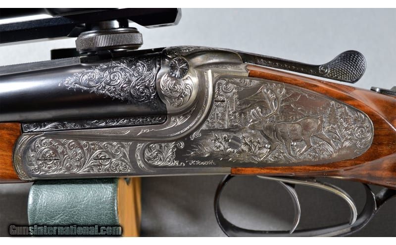 Description: This Beautiful SXS in 9,3x74r was manufactured in the city of Suhl in the state of Thuringia, Germany. The 9.3x74r most commonly used for Africa safari hunting uses a .366 diameter projectile. The cartridge has been favored as a continental alternative to the more popular .375 H&H Magnum More on Merkel: after WWII the production of hunting weapons commenced, and in 1952 the company became owned by the government of the German Democratic Republic (East Germany). After the reunification of Germany in 1990, the company went through modernisation, and in 2007 it was sold to the UAE company Caracal International which is a part of the state's owned EDGE Group. This particular rifle was made back when production was in Germany. On the left side of the receiver is a engraving of a caribou moving through foliage. The bottom has a merkel stamp as well as a smug looking lynx below the stamp. The right side of the receiver has a brown bear looking for his next meal. The rifle has a tang safety, a 23 1/2 inch barrel, and a walnut stock and forearm. 9.3x74R SOLD Chambers: Rifled Metal Condition: Excellent Wood Condition: Great Bore Condition: Excellent Barrels: 23 1/2 Triggers: Dual Butt Pad: Merkel Sights: Zeiss victory 1.1-4x24 Chokes: NA Item Location: Lacey, WA |