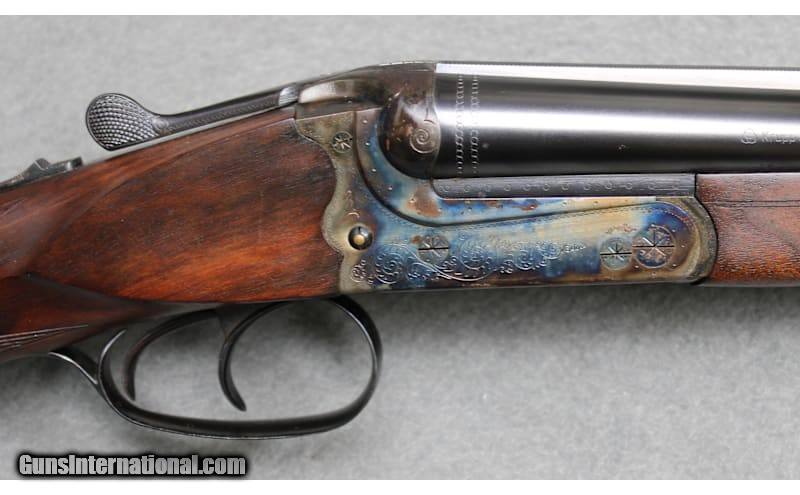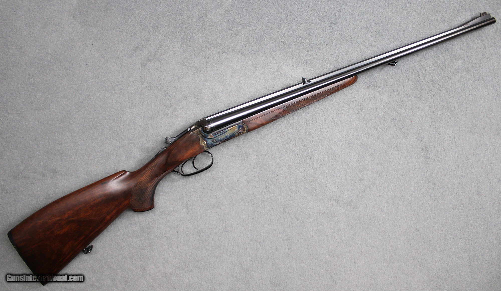 Description: Factory Engraved Gebruder Merkel Model 140 double rifle chambered in 9.3x74R. German proof marks suggesting it was produced in 2000. Comes in a factory leather case. 9.3x74R Metal Condition: Very Good with Minor Handling Marks and Light Oxidation Near Muzzle Wood Condition: Very Good with Minor Handling Marks Bore Condition: Mostly Bright with Slight Darkening Barrels: 23-5/8 inch Solid Rib Item Location: Fort Worth, TX Price: $6,999.99 Contact Seller |