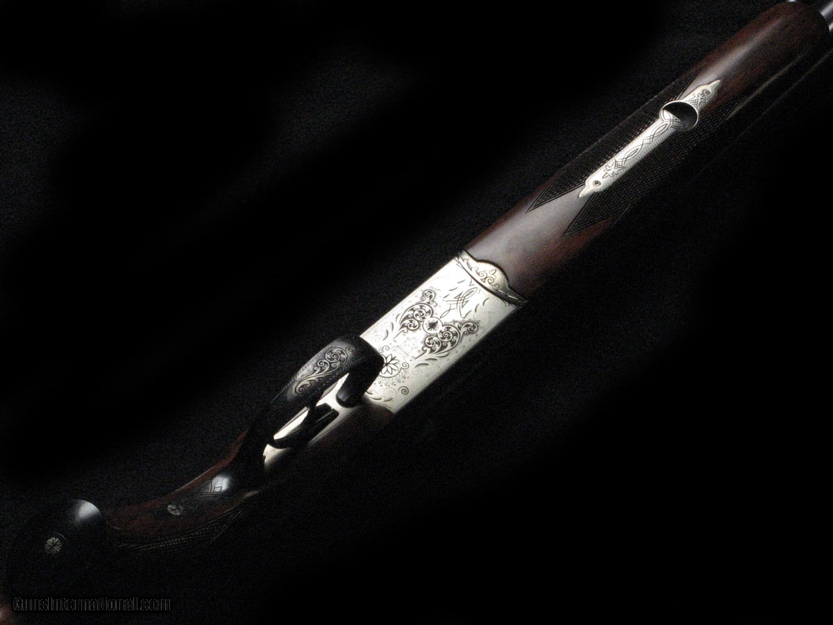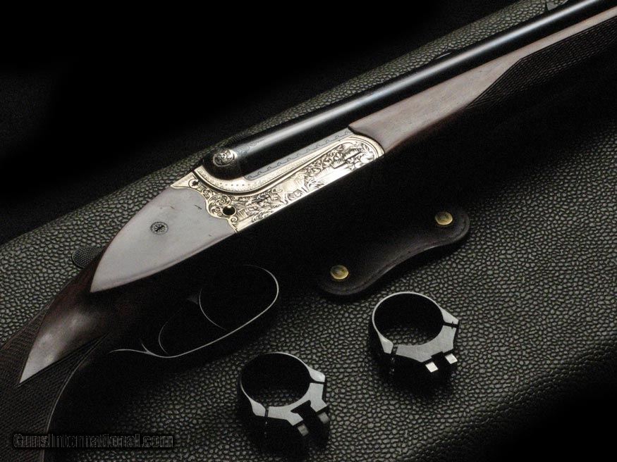 Description: Bright receiver with factory-engraved game scenes, 23.5" heavy barrels fitted with claw mounts (no scope), near new condition, cased in the factory green leather case. 14 3/4" LOP, 2.5" drop, 10 1/2 lbs. Big Medicine. SOLD |