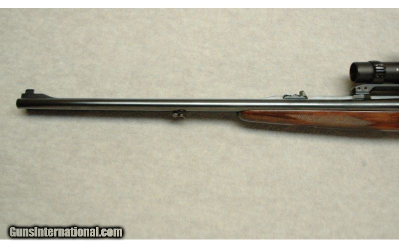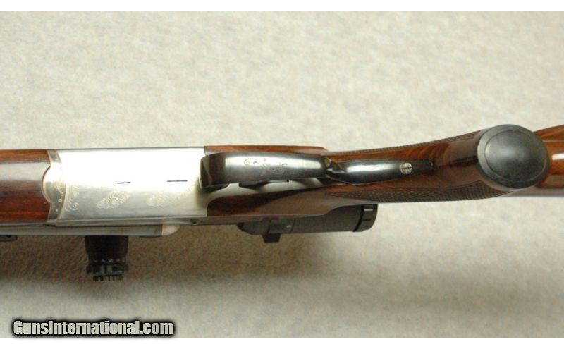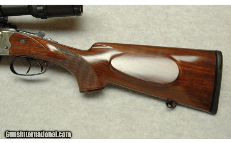 Description: Merkel 140-2 Safari Rifle .375 H&H. Built in the spring of 2007, this beautiful double rifle is regulated at 50 meters using RWS ammunition. Featuring a tastefully engraved coin nickel finished receiver with cocking indicators, ejectors, double triggers, non-automatic safety, express sights and a Sightmark 1-6x scope featuring a heavy duplex reticle. The weight without the scope and mount is 10 pounds 2 ounces and 12 pounds 6 ounces with the scope and mount. An absolutely superb rifle. SOLD Caliber Info: .375 Holland & Holland Magnum Metal Condition: Excellent, few light wear and handling marks. Wood Condition: Excellent Bore Condition: Excellent Barrels: 23 1/2" Barrels Triggers: Double Triggers. Stock: Deluxe Checkered Walnut, RH Cheek Piece Butt Stock Stock Dimensions: 14 1/4" LOP. Fore End: Checkered Walnut Fore Arm. Butt Pad: Merkel Butt Pad Weight: 12 lbs. 6 ozs. Sights: Sightmark 1-6x scope installed. Extras: With box. Item Location: Hamburg, PA |