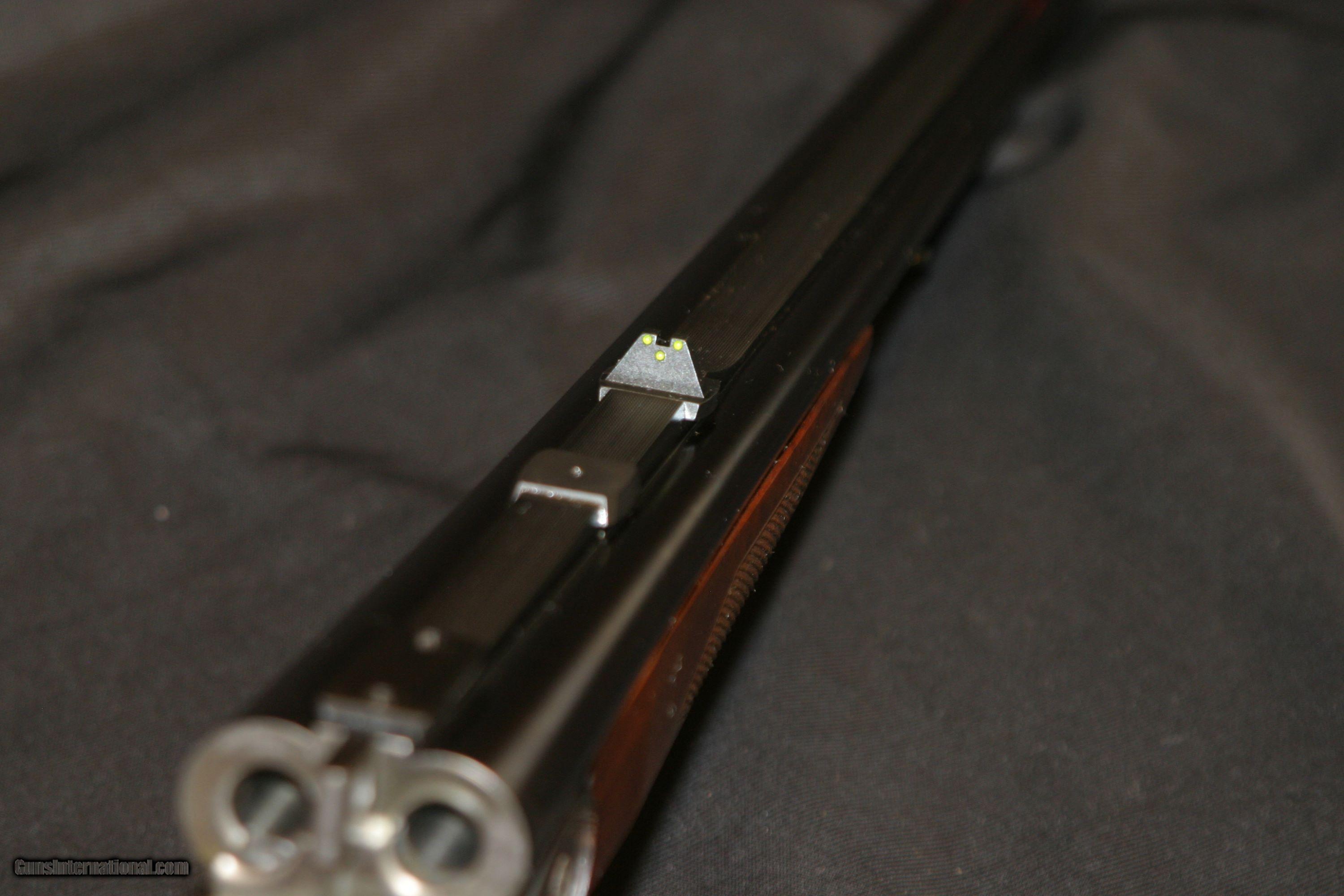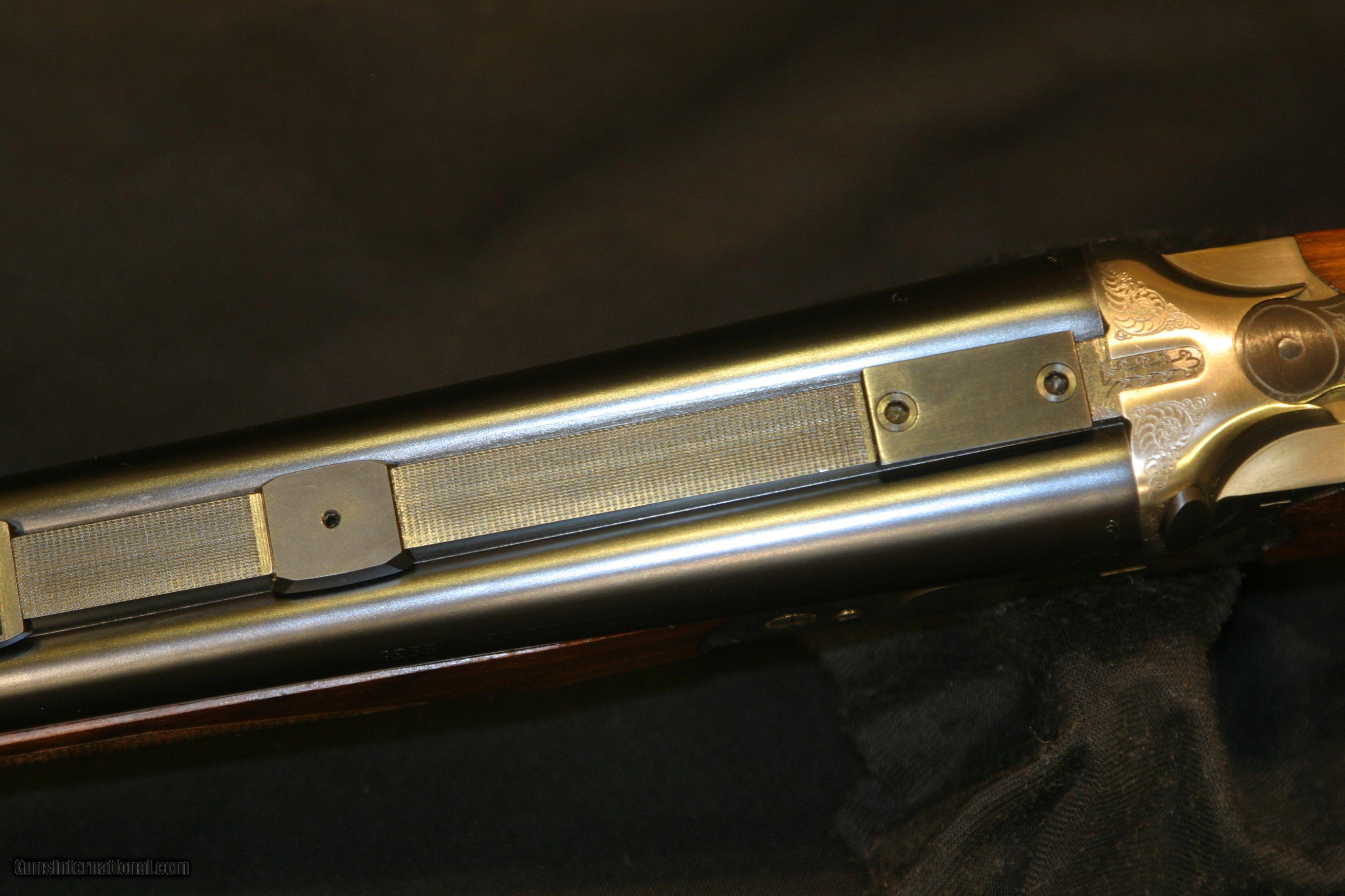 Description: The 141 model is a variation of the 140 side-by-side rifle. The particularly narrow receiver and the short barrels make this gun one of the lightest side-by-side rifles in the world. The option of vertical and horizontal muzzle adjustment facilitates retrofitting a scope or changing to ammunition with a different load or bullet weight. The rifle is prepared for the fitting of a pivot mount; a driven hunt sight is supplied as standard. This compact action is the result of masterly gunmaking expertise – and rewards future owners with an exceptionally slim and responsive hunting gun. THIS RIFLE IS IN EXCELLENT CONDITION, 6 3/4LBS AND LOP IS 14 5/16". CHAMBERED IN 9.3X74R 21 3/4" BARRELS with ejectors SOLD |