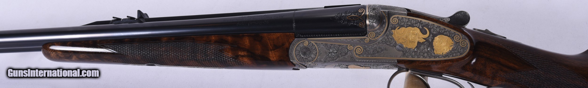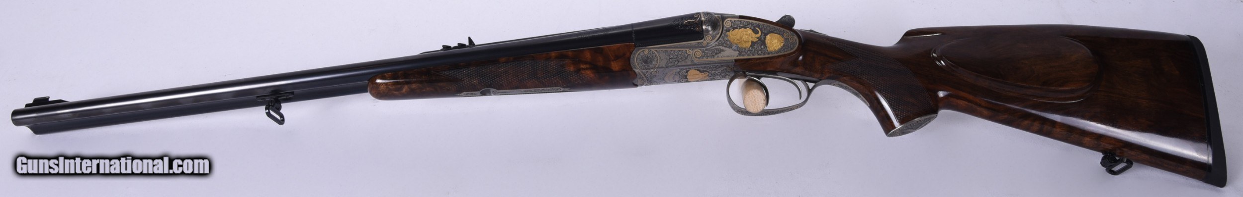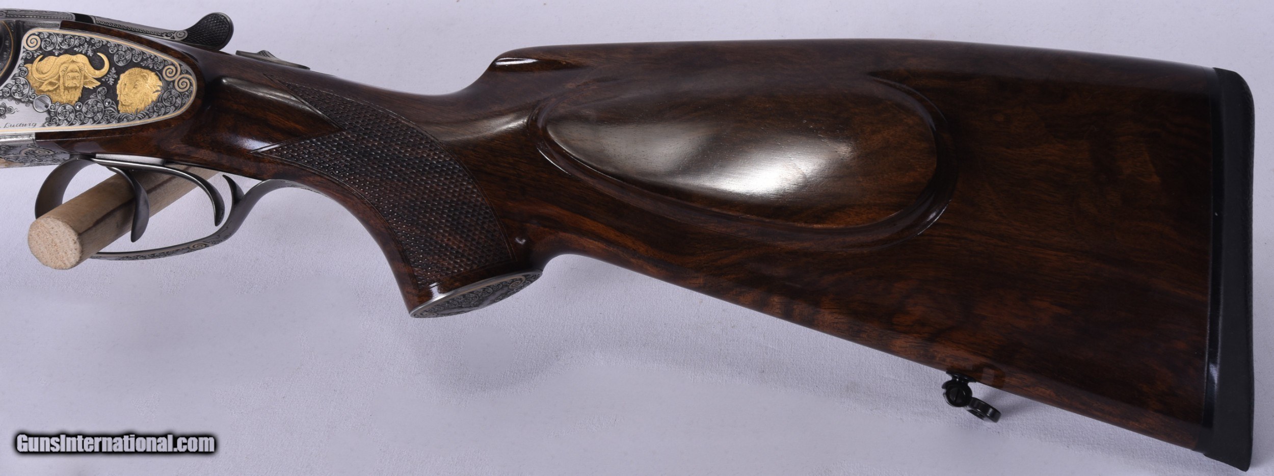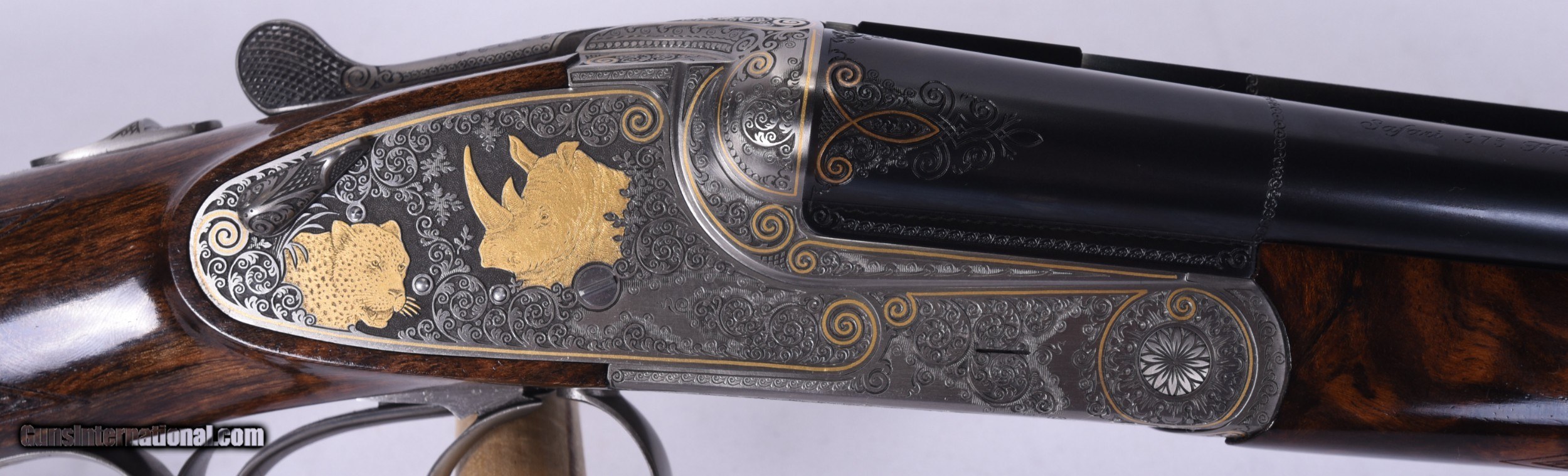 Description: We have for sale a brand new Merkel model 160-2.2 Sidelock SXS double rifle in 375 H&H. One of Three American safari series. 23.6" barrels. Fully engraved with the Big Five (Lion, Rhino, Leopard, Elephant, Cape Buffalo), gold inlay, cocking indicators, express sight with 50, 75 & 100yd leafs. Removeable sidelocks for service - a trus sidelock gun. This is one amazing rifle you must see! We have all three rifles of the set. We can make a deal if interested on all three. SOLD |