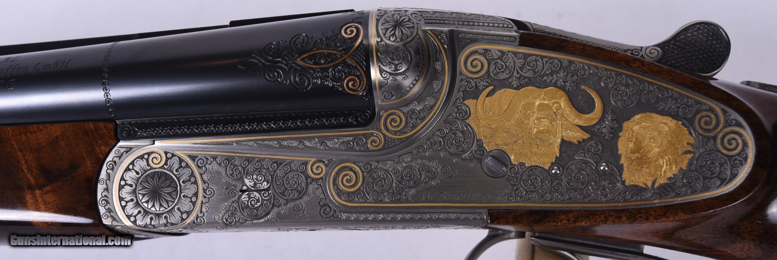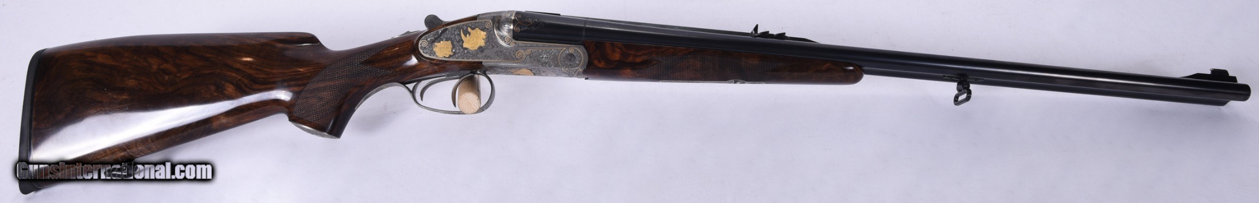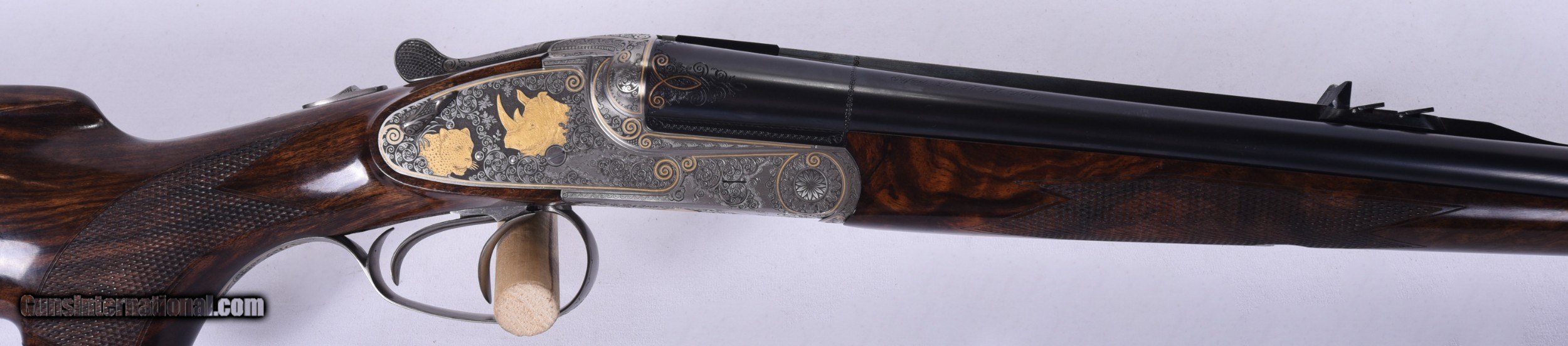 Description: We have for sale a brand new Merkel model 160-2.2 Sidelock SXS double rifle in 375 H&H. One of Three American safari series. 23.6" barrels. Fully engraved with the Big Five (Lion, Rhino, Leopard, Elephant, Cape Buffalo), gold inlay, cocking indicators, express sight with 50, 75 & 100yd leafs. Removeable sidelocks for service - a trus sidelock gun. This is one amazing rifle you must see! We have all three rifles of the set. We can make a deal if interested on all three. SOLD |