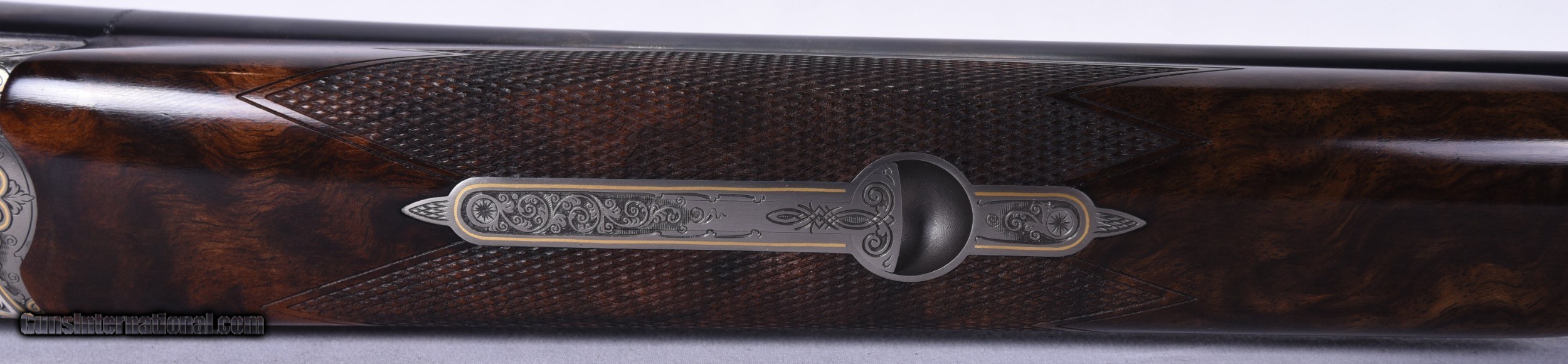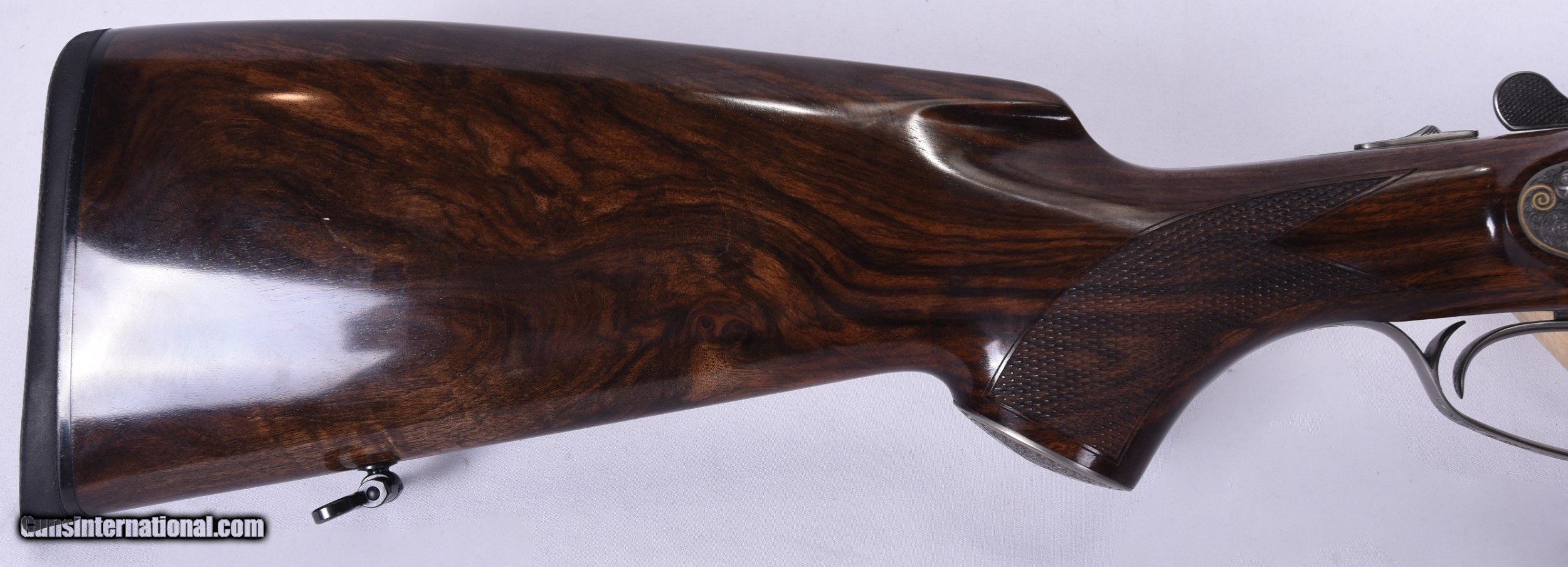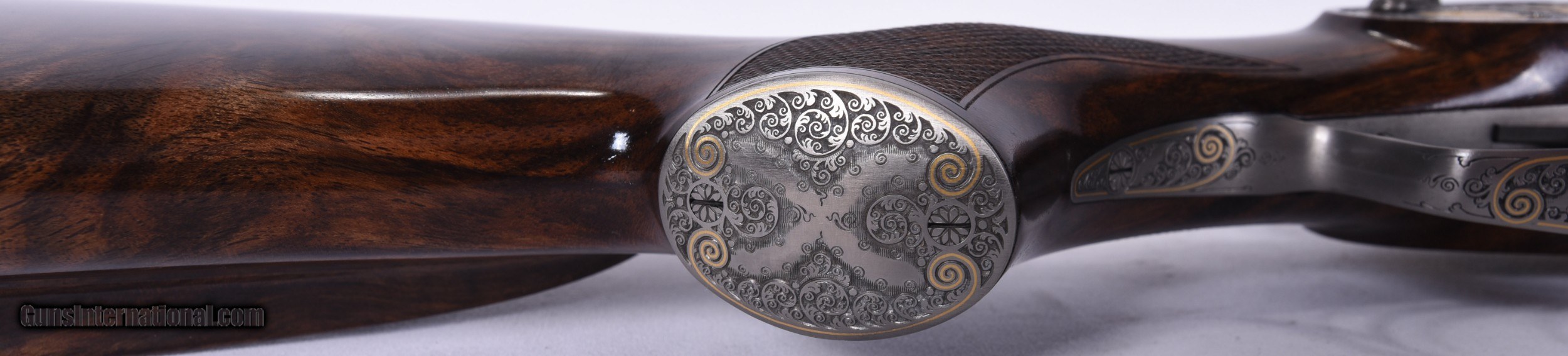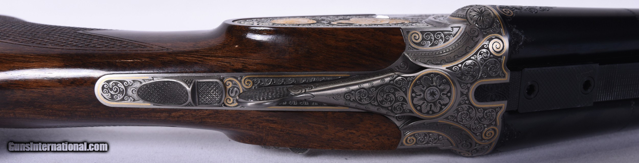 Description: We have for sale a brand new Merkel model 160-2.2 Sidelock SXS double rifle in 375 H&H. One of Three American safari series. 23.6" barrels. Fully engraved with the Big Five (Lion, Rhino, Leopard, Elephant, Cape Buffalo), gold inlay, cocking indicators, express sight with 50, 75 & 100yd leafs. Removeable sidelocks for service - a trus sidelock gun. This is one amazing rifle you must see! We have all three rifles of the set. We can make a deal if interested on all three. SOLD |