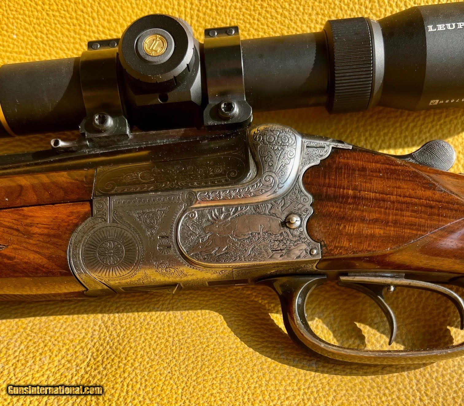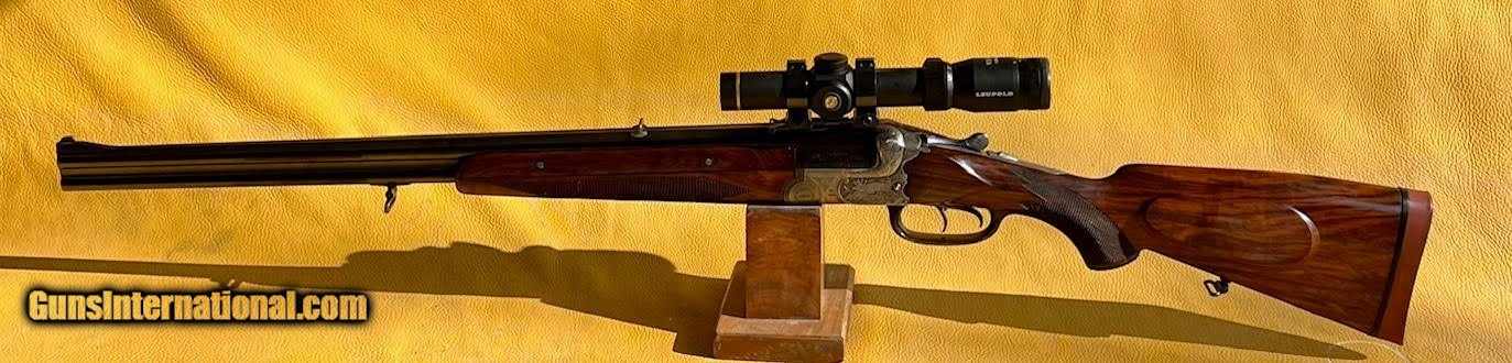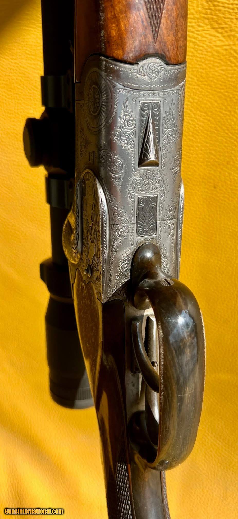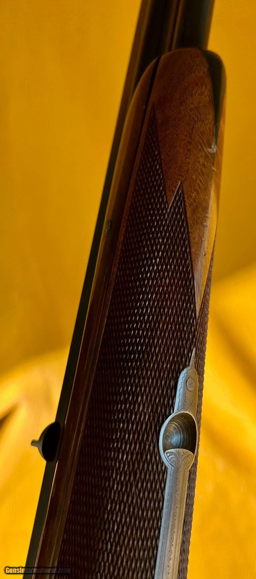 Description: Serial #13604, 1920 era rifle with 25” barrels in Bolher Antinit steel ( to this day, one of the best steel the gun trade can use! ) . Bores and chambers are shinny, rifling is crisp. Regulated with 12 grams bullet which are pretty heavy 7mm projectiles by today’s standards. I shot it with Hornady 162 plastic tip and got a nice 2” group at 100 yards top right over bottom. Owner stated great regulation with 160gr Nosler partition and 47 gr IMR 4350. 3 pieces forend, southgate ejectors , a fix Talley mounted Leupold VXR ill ret 1.25-4x20 on the original base . 300 series action with Purdey flat bolt and Kersten top bolt. Tight on face. Interceptor sears, cocking indicator, double set triggers, 75% coverage floral and game scenes engraving. Weight is 9 lbs 9 oz . LOP is 14 1/4” over a leather faced 7/8” pad. The rifle is mechanically and cosmetically in very good condition. Rifle Caliber: 7x57mmR Manufacturer: MERKEL Model: 300 serie 7x57R ejector Serial Number: 13604 Barrel Length: 25" in Bolher Antinit steel Condition: Very good Butt Pad: Leather faced pad LOP: 14 1/4 Weight: 9 Lbs 9 oz. Engraving: 75% coverage floral and game scenes engraving Optic: fix Talley mounted Leupold VXR ill ret 1.25-4x20 on the original base Price: $5,990.00 Contact Seller |
