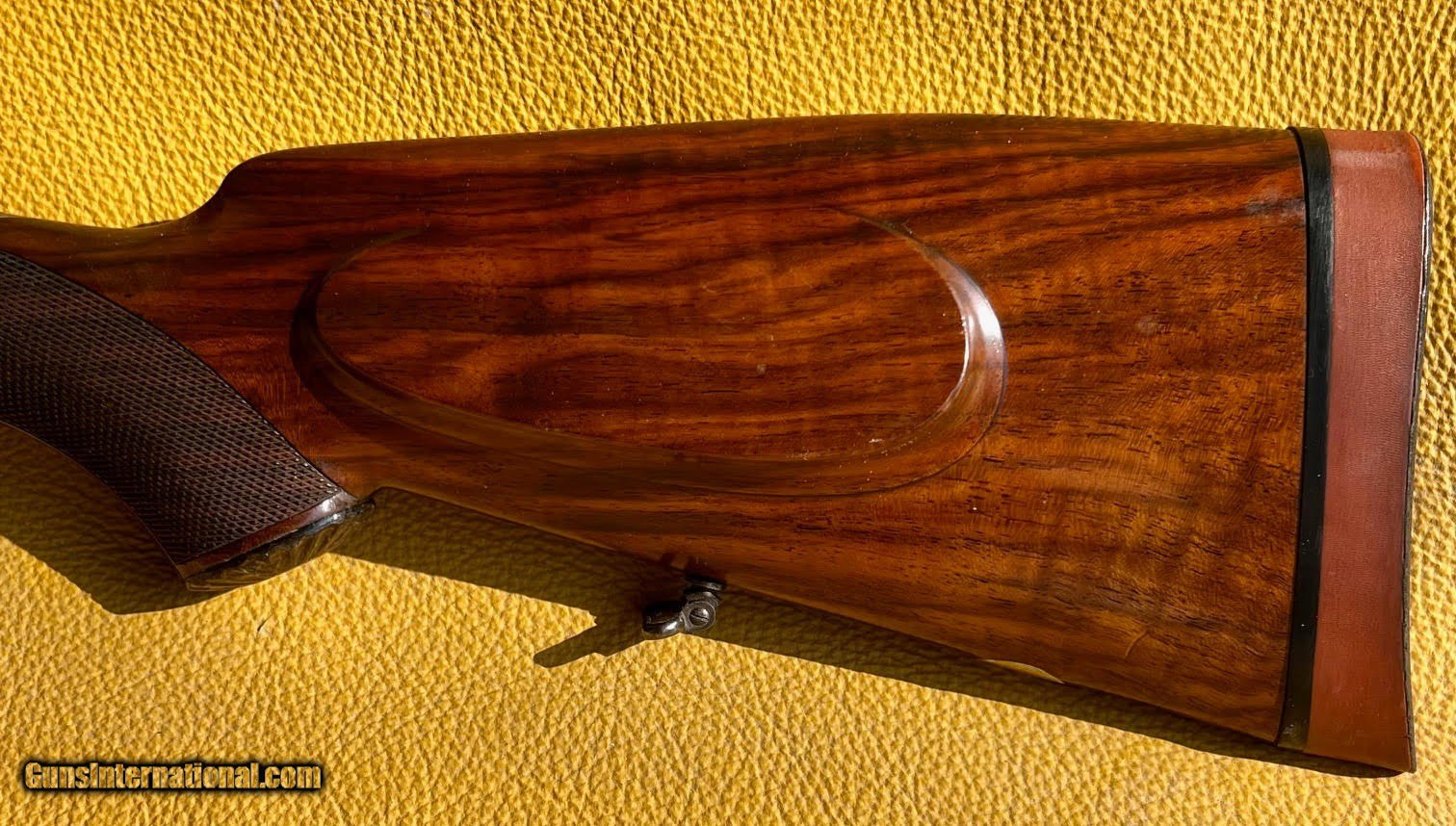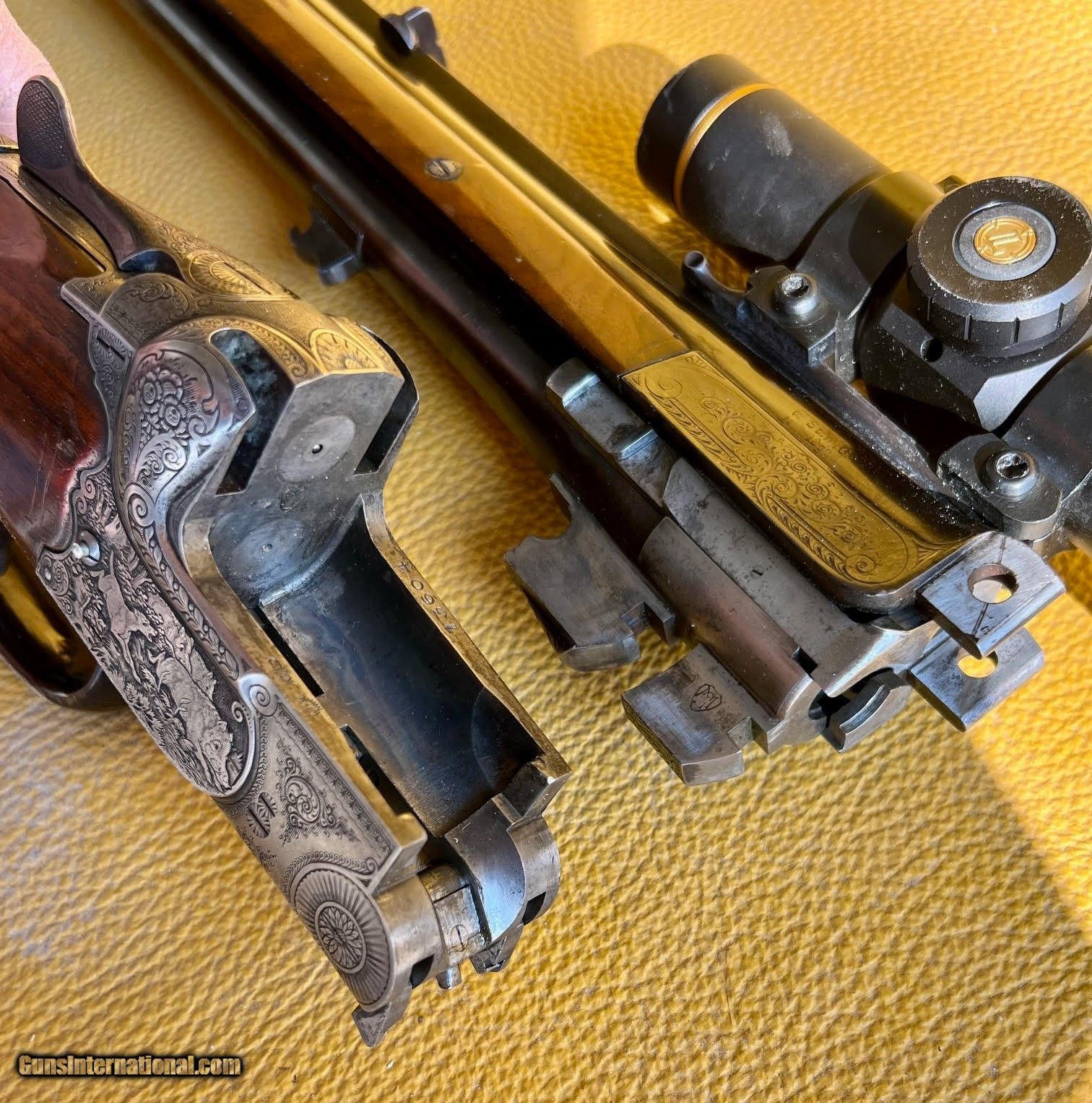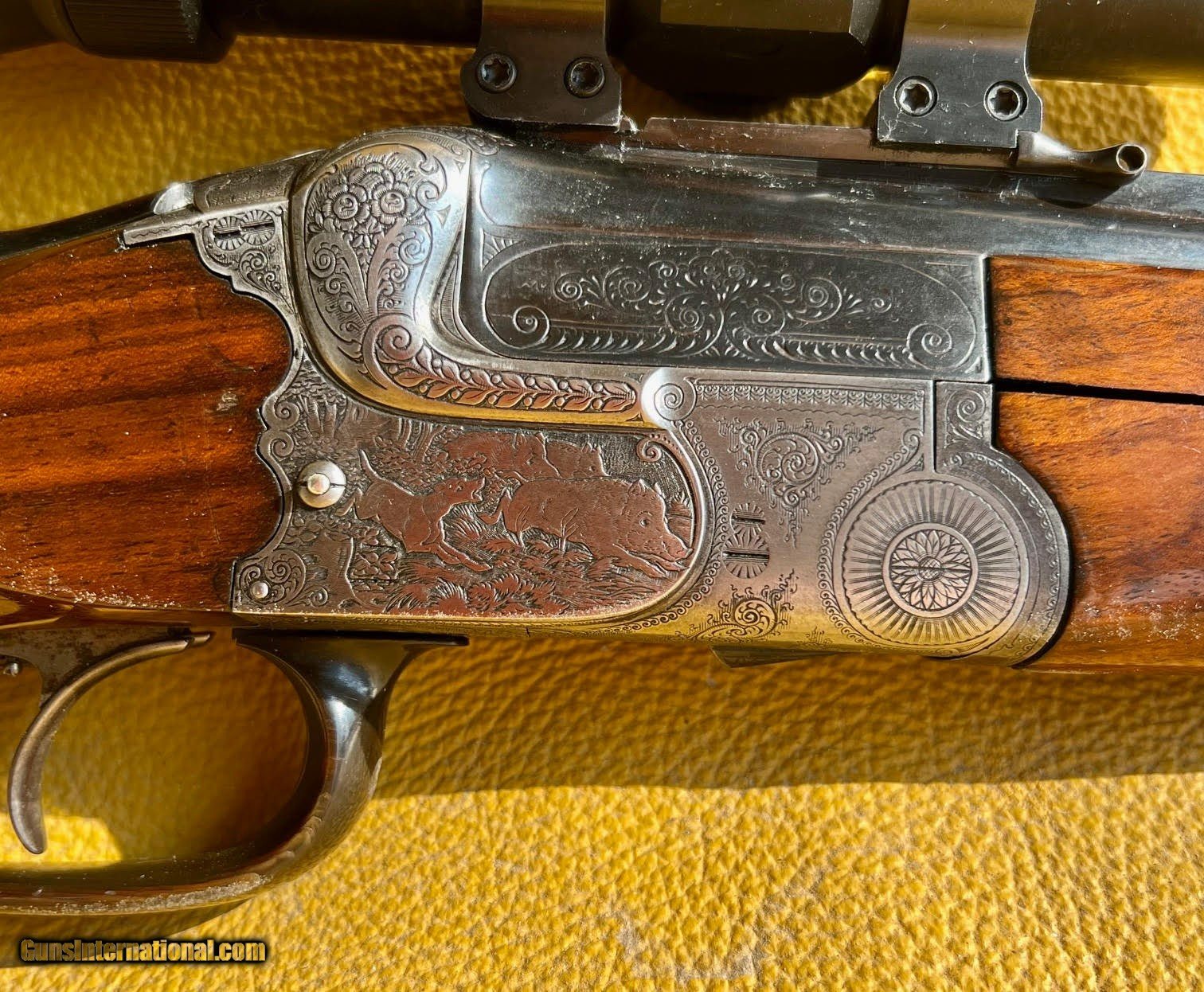 Description: Serial #13604, 1920 era rifle with 25” barrels in Bolher Antinit steel ( to this day, one of the best steel the gun trade can use! ) . Bores and chambers are shinny, rifling is crisp. Regulated with 12 grams bullet which are pretty heavy 7mm projectiles by today’s standards. I shot it with Hornady 162 plastic tip and got a nice 2” group at 100 yards top right over bottom. Owner stated great regulation with 160gr Nosler partition and 47 gr IMR 4350. 3 pieces forend, southgate ejectors , a fix Talley mounted Leupold VXR ill ret 1.25-4x20 on the original base . 300 series action with Purdey flat bolt and Kersten top bolt. Tight on face. Interceptor sears, cocking indicator, double set triggers, 75% coverage floral and game scenes engraving. Weight is 9 lbs 9 oz . LOP is 14 1/4” over a leather faced 7/8” pad. The rifle is mechanically and cosmetically in very good condition. Rifle Caliber: 7x57mmR Manufacturer: MERKEL Model: 300 serie 7x57R ejector Serial Number: 13604 Barrel Length: 25" in Bolher Antinit steel Condition: Very good Butt Pad: Leather faced pad LOP: 14 1/4 Weight: 9 Lbs 9 oz. Engraving: 75% coverage floral and game scenes engraving Optic: fix Talley mounted Leupold VXR ill ret 1.25-4x20 on the original base Price: $5,990.00 Contact Seller |