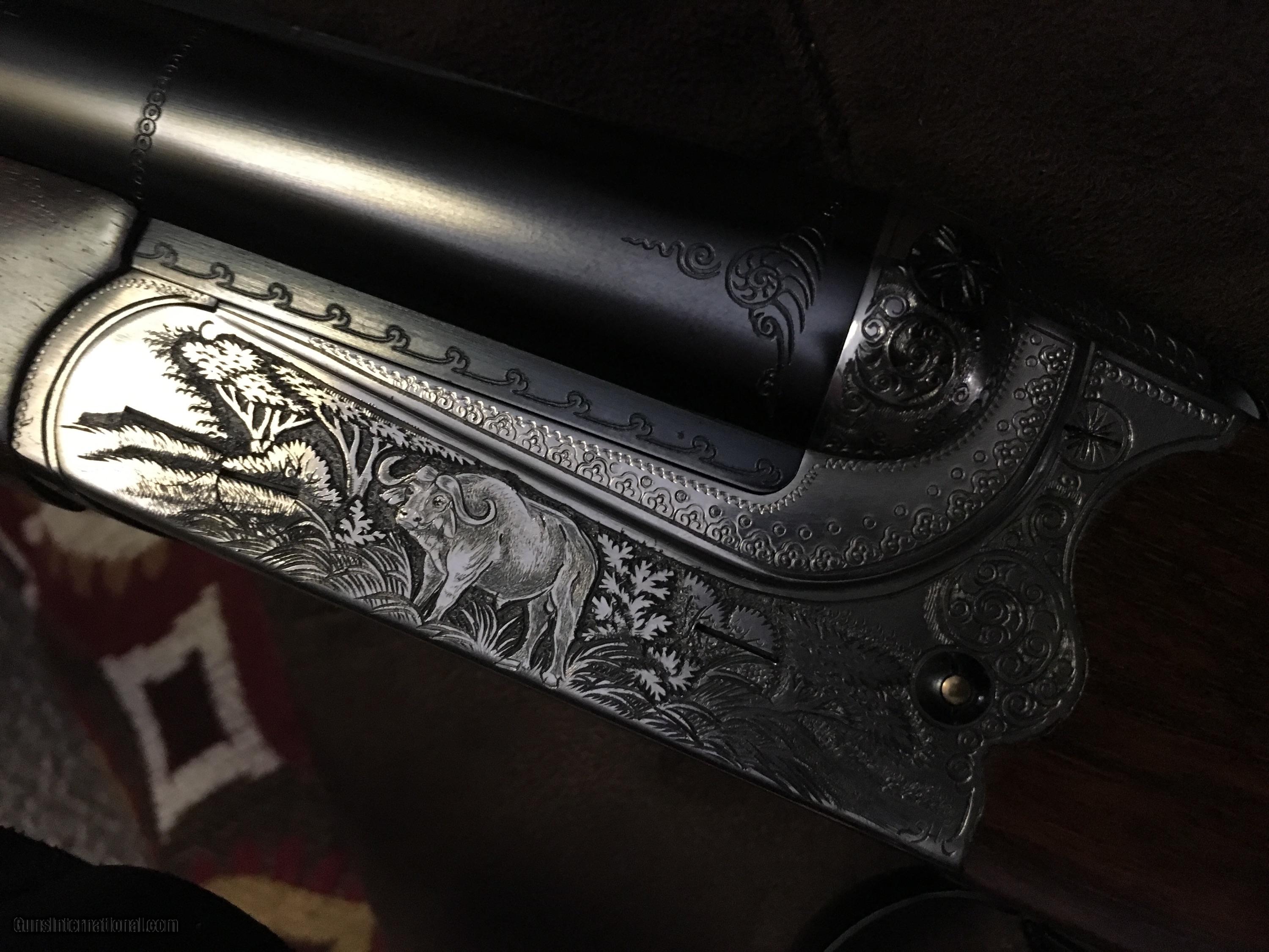 Description: Here it is, the chance of a lifetime, Own one of the worlds most luxurious engraved double rifles. I purchased many years ago and its been in a master safe ever since. This rifle has been unfired by me and I believe is new and just been sitting waiting for the fine firearms conoiseur. I have the rare rich leather case and custom dust cover and I also have the Manufacturers Manual and box. Truly a treasure and heirloom to be passed down. Get this fine tailored firearm before someone else grabs it. The time is now as it is priced to sell.