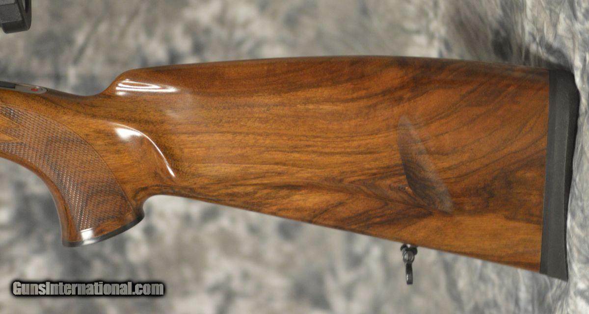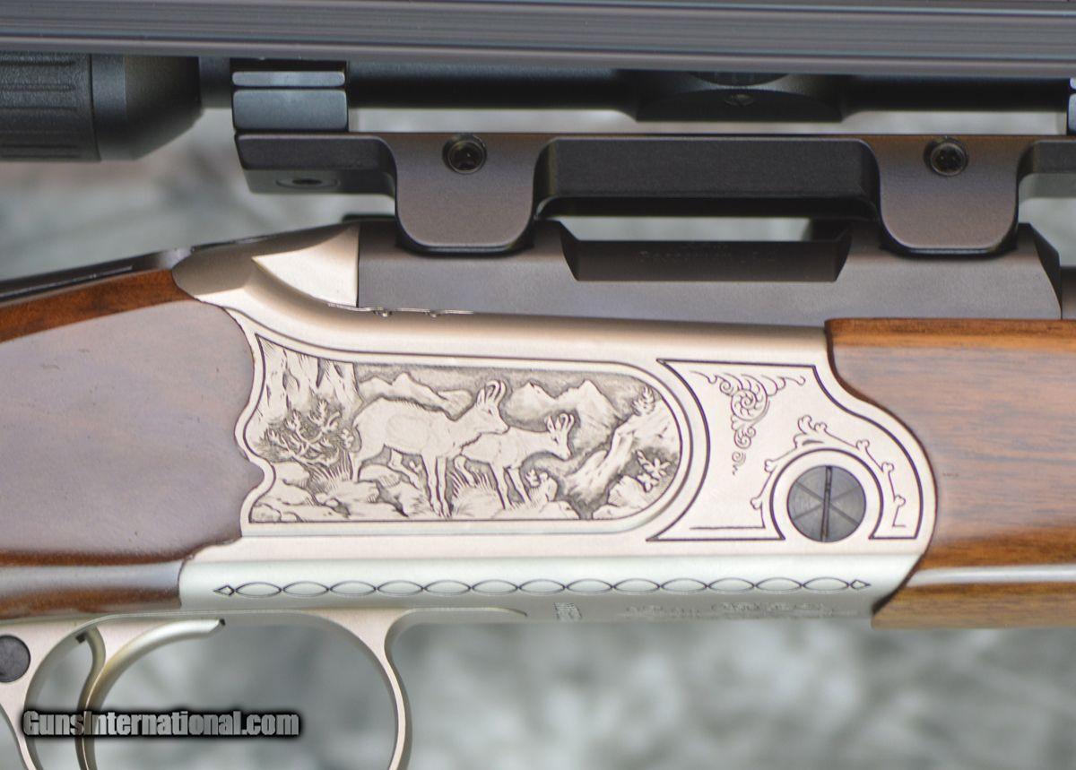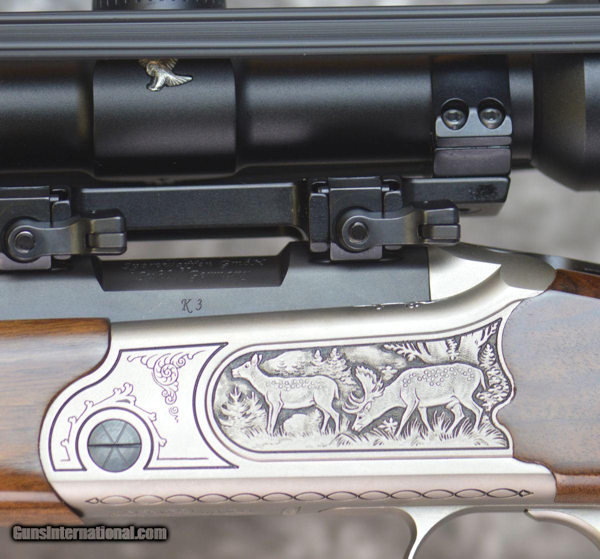 Description: New Merkel K3 Stutzen Single-Shot rifle chambered in .243 Win; 20 1/4" barrel with full Mannlicher style stock, factory iron sights. Includes Swarovski Z3 3-10x42 scope with QD mounts. Nickel finished receiver with deeply engraved game scenes, factory Bavarian style stock with Rabbit Ear style cheek rest and schnabel forearm. Includes factory case, papers. SOLD |
