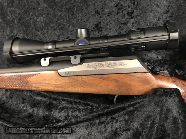Description: This Merkel KR1 in 7mm Rem Mag is a stunning piece of engineering! Rifle is in pristine condition, with no dings or handling marks visible anywhere. Bolt face is clean, and bore is perfect. Gun comes with original mid barrel rear sight and ramp front, and also with a very nice Zeiss Terra 3-9x scope on a quick-detach one piece base. The ideal rifle for the shooter or collector who likes something just a bit different! SOLD Manufacturer: Merkel Model: KR1 Caliber Info: 7mm Rem Mag |
