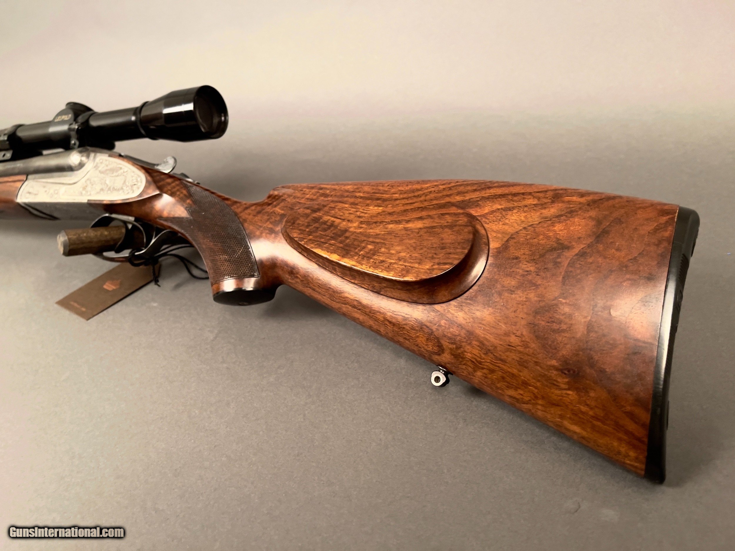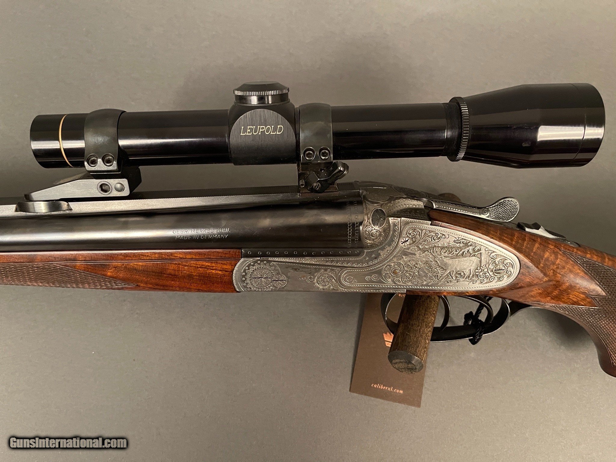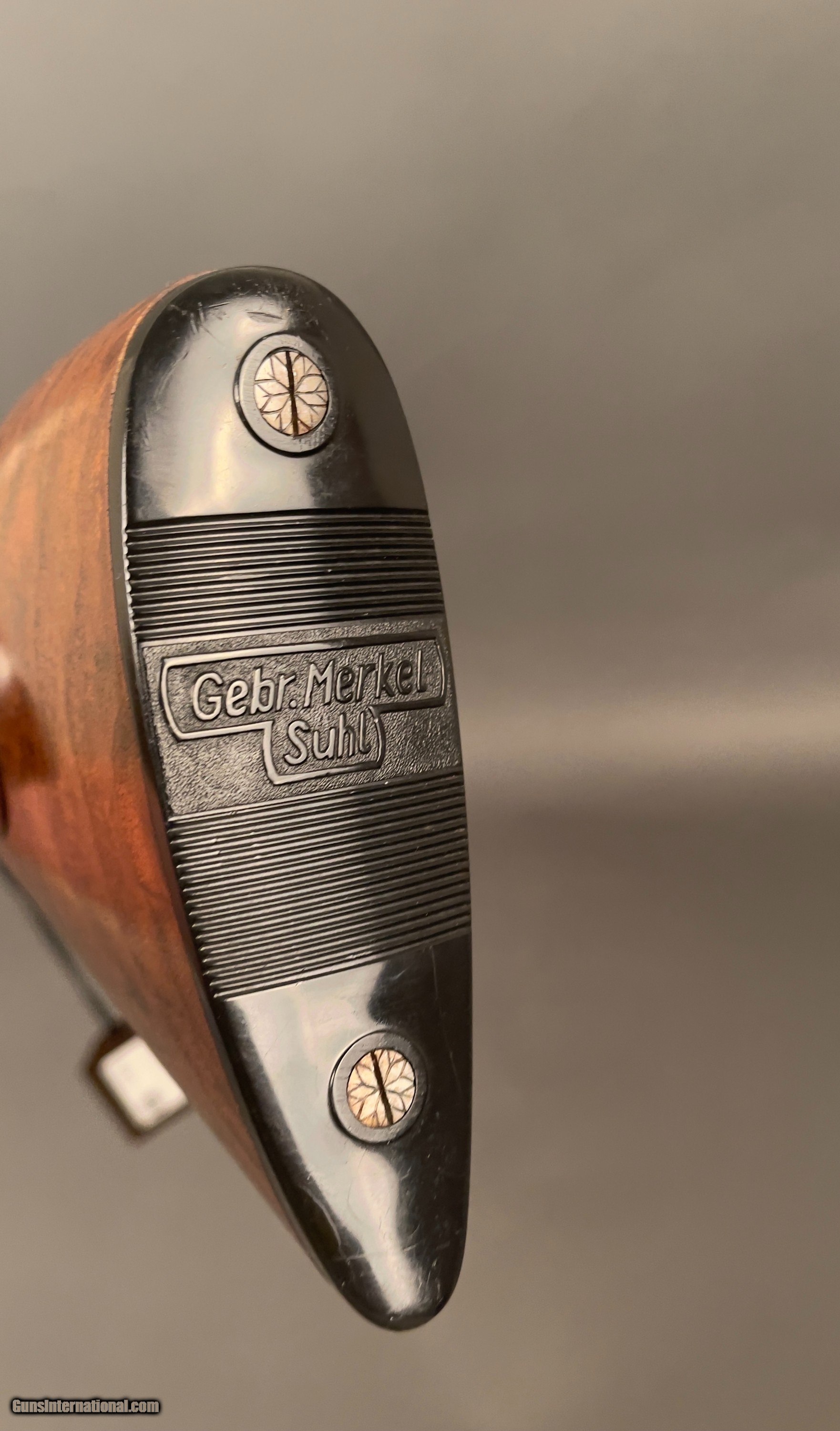 Description: Merkel M150 (20ga frame) chambered in 9.3x74R from a private collection with beautiful engraved side plates / box lock, cocking indicator, Leupold scope with Recknagel mounts. Wood is nice and in great condition with snap caps too. Barrel length is 23 1/2" and has a double trigger with the front trigger being a set trigger with a 14 1/2" LOP. SOLD Rifle Caliber: 9.3x74mmR |