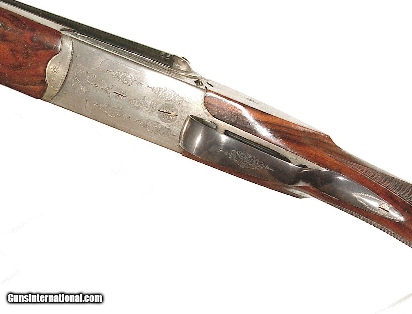 Description: .375 H&H belted magnum caliber, 24" barrels with quarter rib and two leaf folding express sight. Scroll engraved receiver with top lever opening, double underlocking lugs and third bite Greener type crossbolt . Double triggers and positive extractors. Checkered splinter forend and pistol grip buttstock measuring 14 3/4" over a Kick-Eze pad. The original buttplate is included. In as new, unused original condition. Accompanied by it's leather luggage case. SOLD |