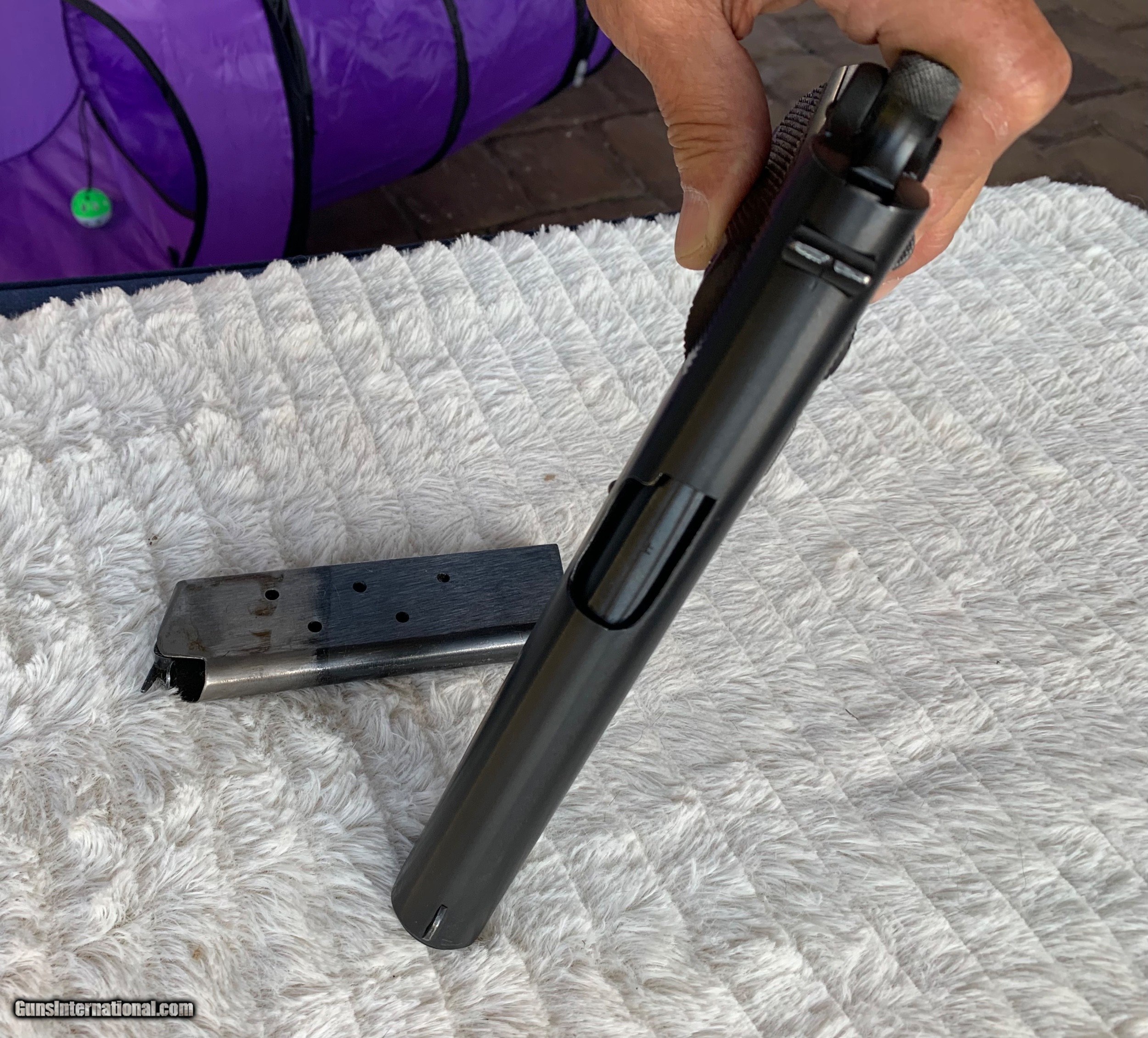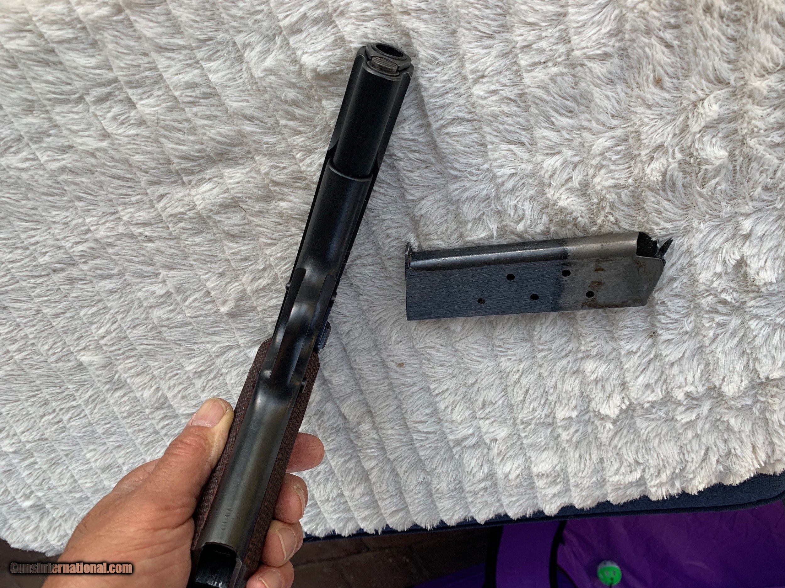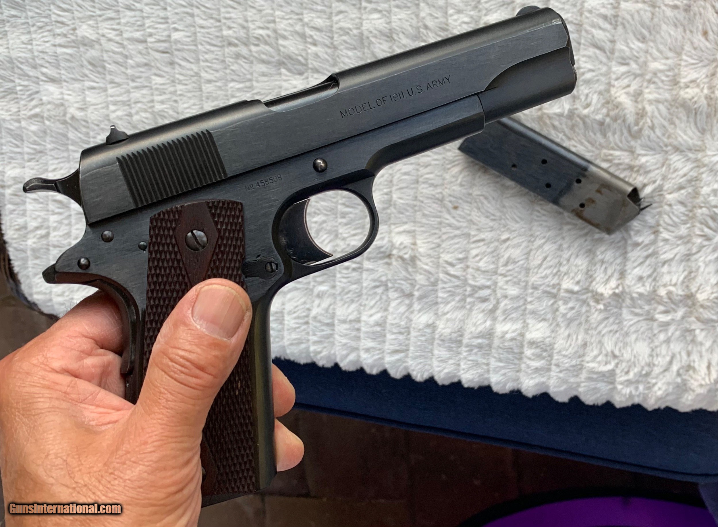 Description: Here's a stunning example of a WW1 Colt 1911 " Black Army " . Serial number 458,588. Gun is in excellent plus condition with lite handling marks. All of the solid finish is still remaining . Markings are sharp. Grips are in excellent plus condition. Bore and mechanics are in excellent plus condition ! Gun locks up tight . Gun is 100 percent all correct for a 1911 black army . Please review my photos and email me with any questions ? 3 day inspection as allways. Thank you for looking, Little Jo SOLD Curio/Relic: Yes Handgun Caliber: .45 ACP (.45 Auto) Manufacturer: Colt Model: 1912 Serial Number: 458,588 Condition: Excellent plus Bore Condition: Mint |