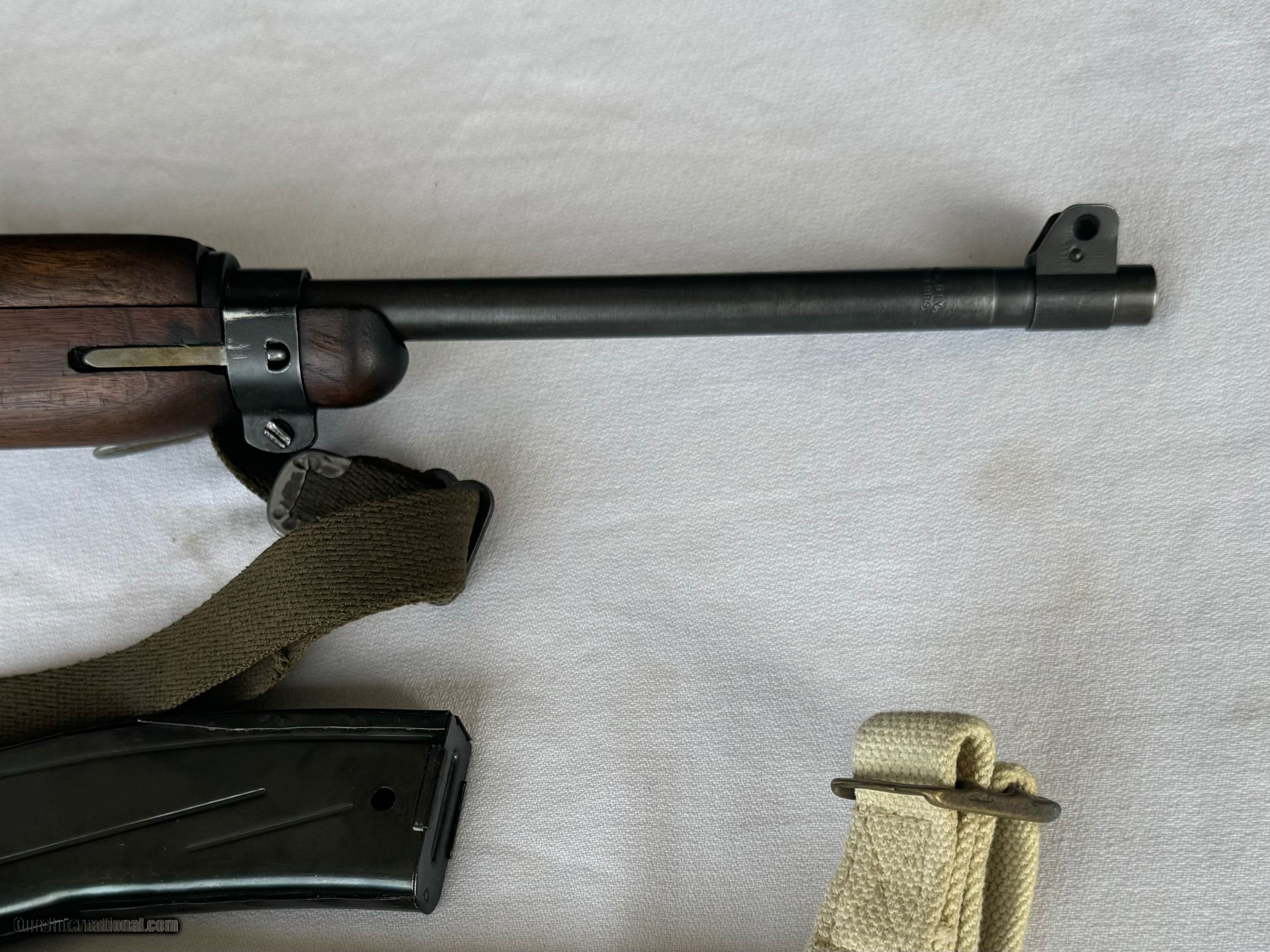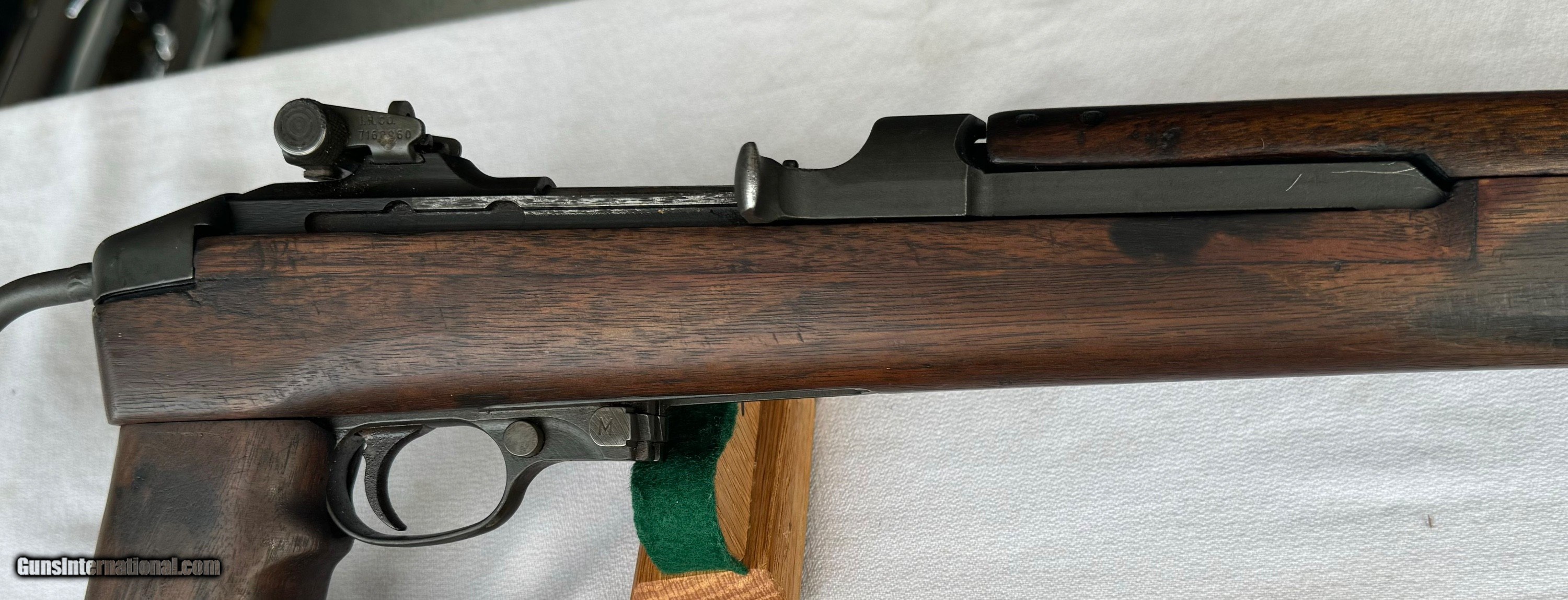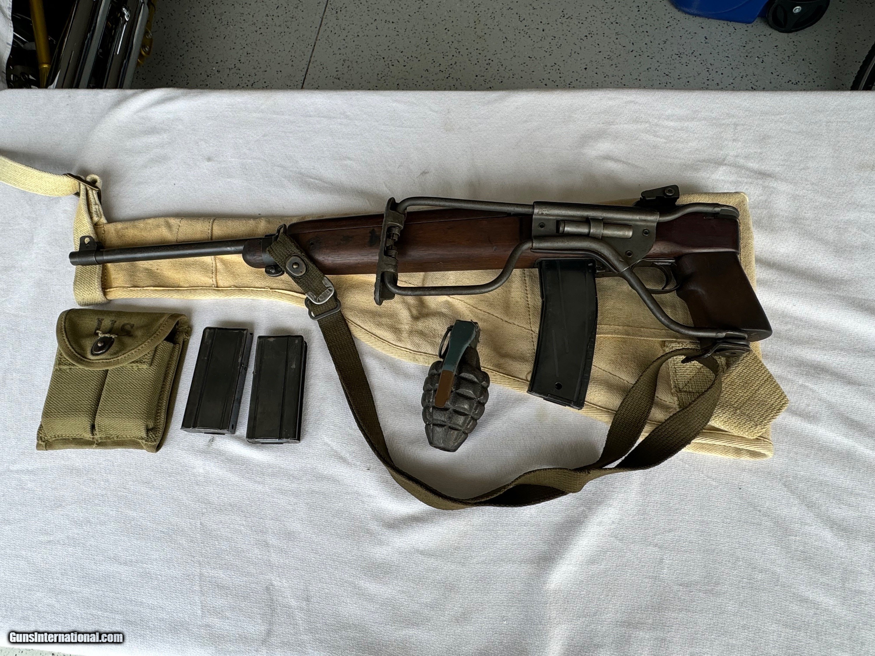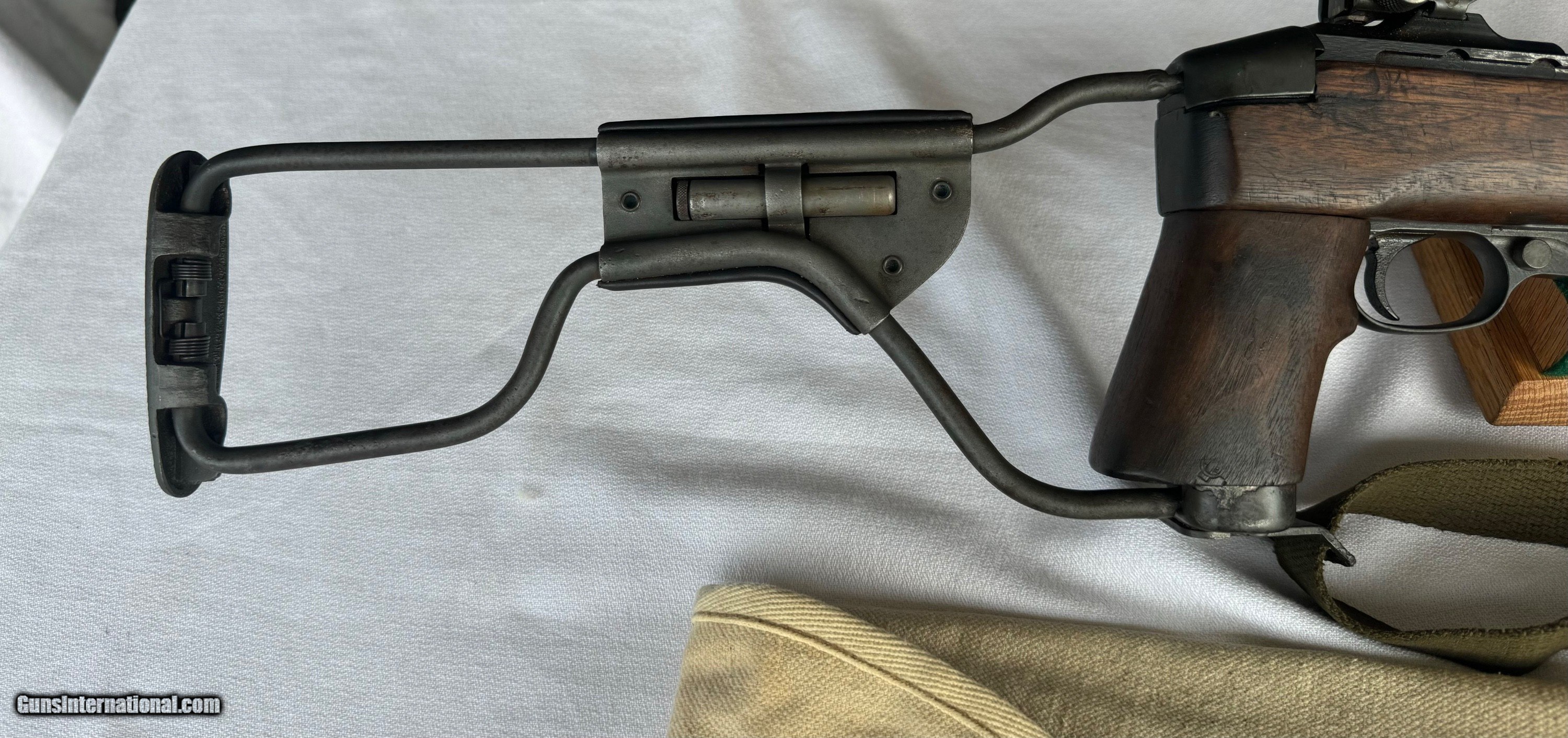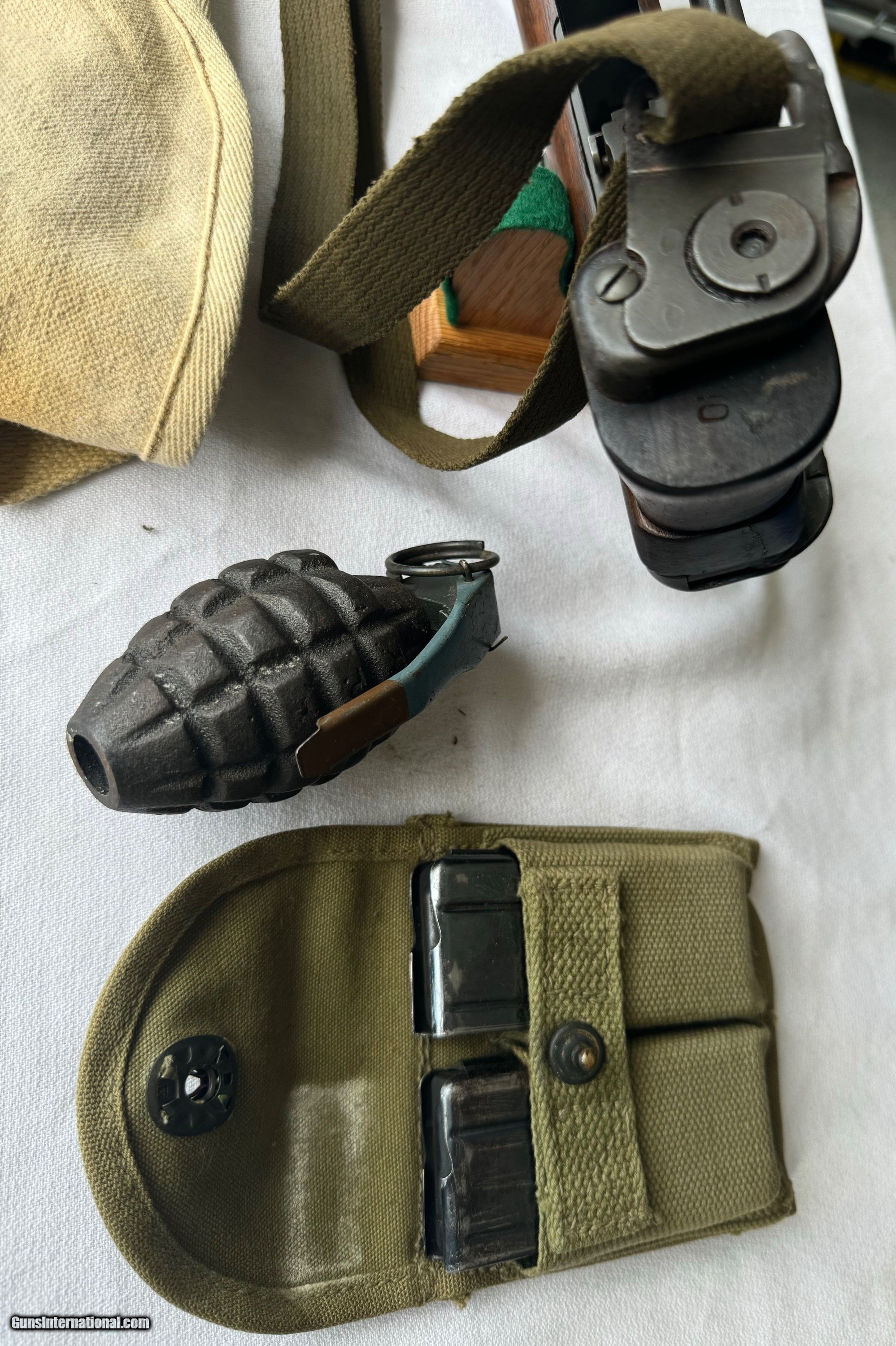 Description: Here's a Genuine Original WW2 Inland Paratrooper with extras ! Serial number 5,474,526 . Shipped in March 1944. Text book WW2 Example ! Bore and mechanics are in excellent condition. Excellent working condition. Comes with original Sling , 30 round mag and 2 - 15 round mags with U.S. pouch . Also comes with a U.S.M.C marked Jump case with dates and maker marked . Also comes with a Practice Hand Grenade. Gun has most of its original finish with wear and tear to the finish from use . Wood is original and has a neat repair on stock on right side below bolt and forend . With correct P stamp on stock indicating Arsenal wood repair . This gun seen action and shows wear from use . Comes with correct sights and inland parts throughout . Wood is also correct Inland Marked . Gun has a Inland barrel with 3/44 date. Original Folding stock is in excellent condition. Overall a Great WW2 Used but not abused correct and original Inland Paratrooper! Please review my photos and email me with any questions ? 3 day inspection as allways. Thank you for looking, Little Jo SOLD Curio/Relic: Yes Rifle Caliber: .30 Carbine Manufacturer: Inland Model: Paratrooper Serial Number: 5,474,526 Condition: Excellent |