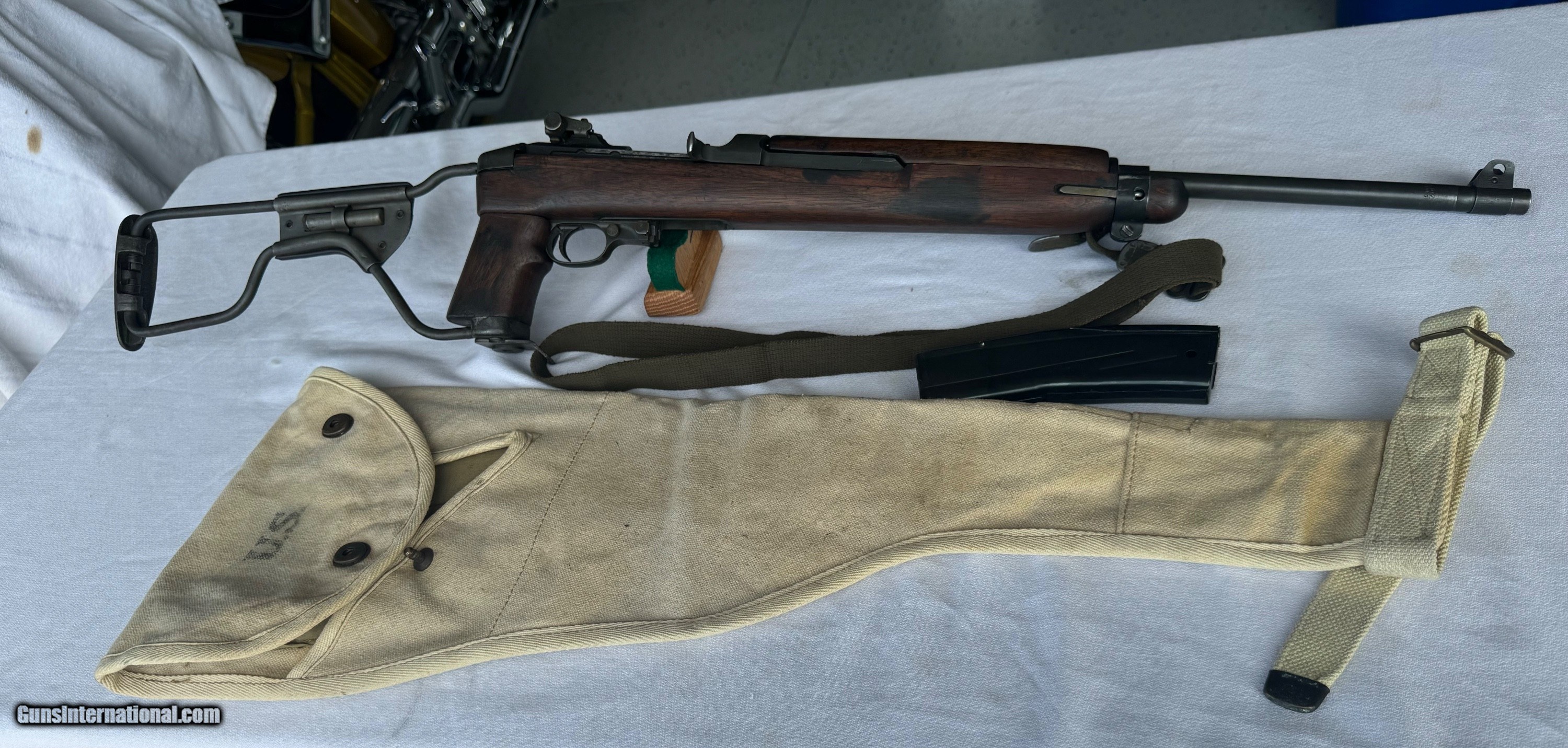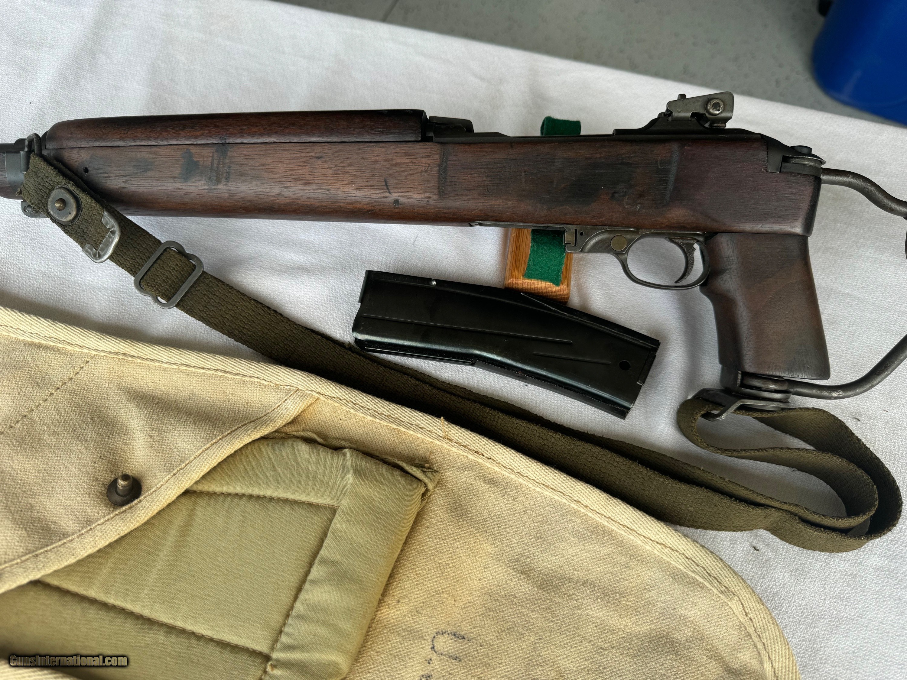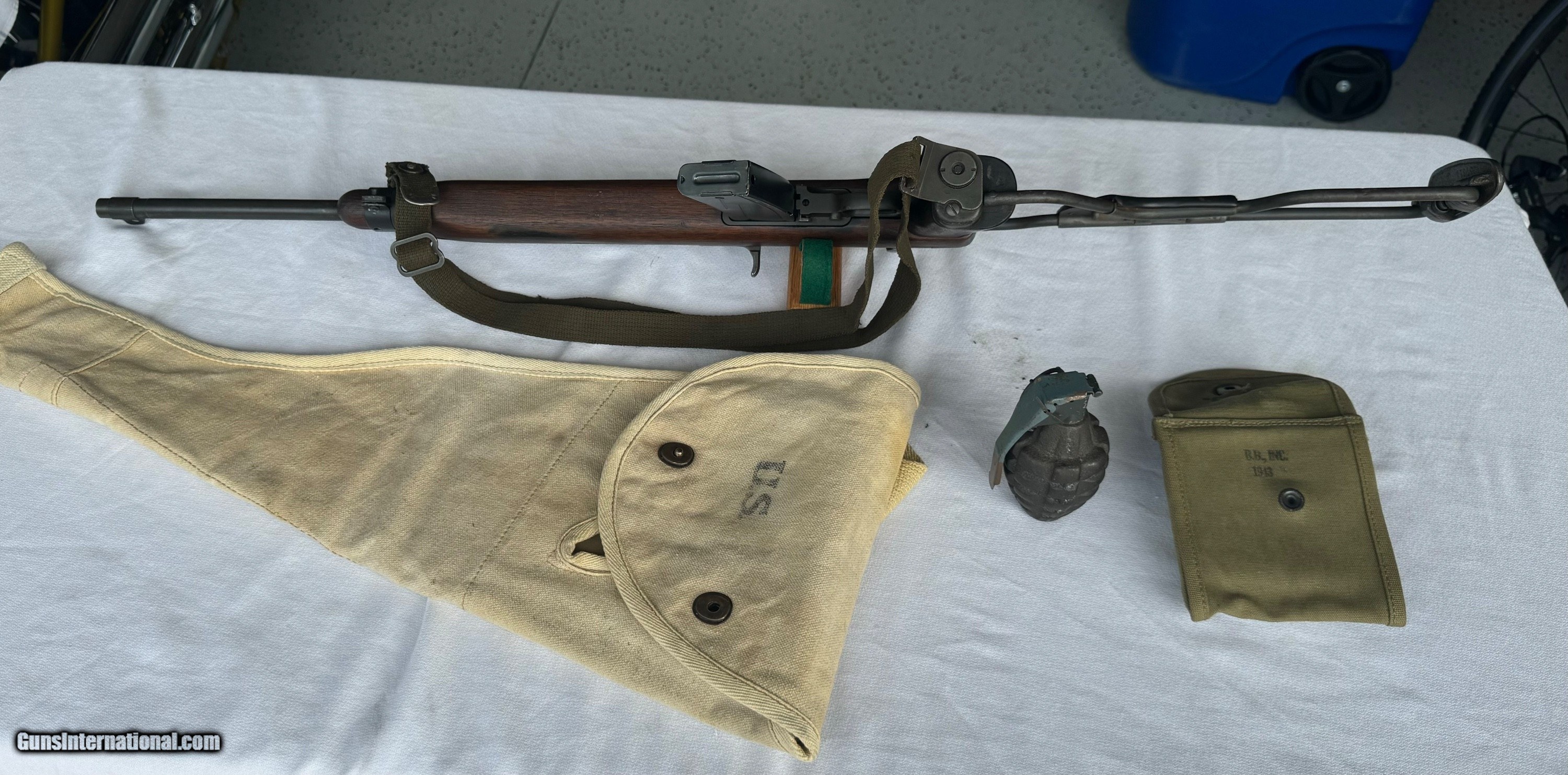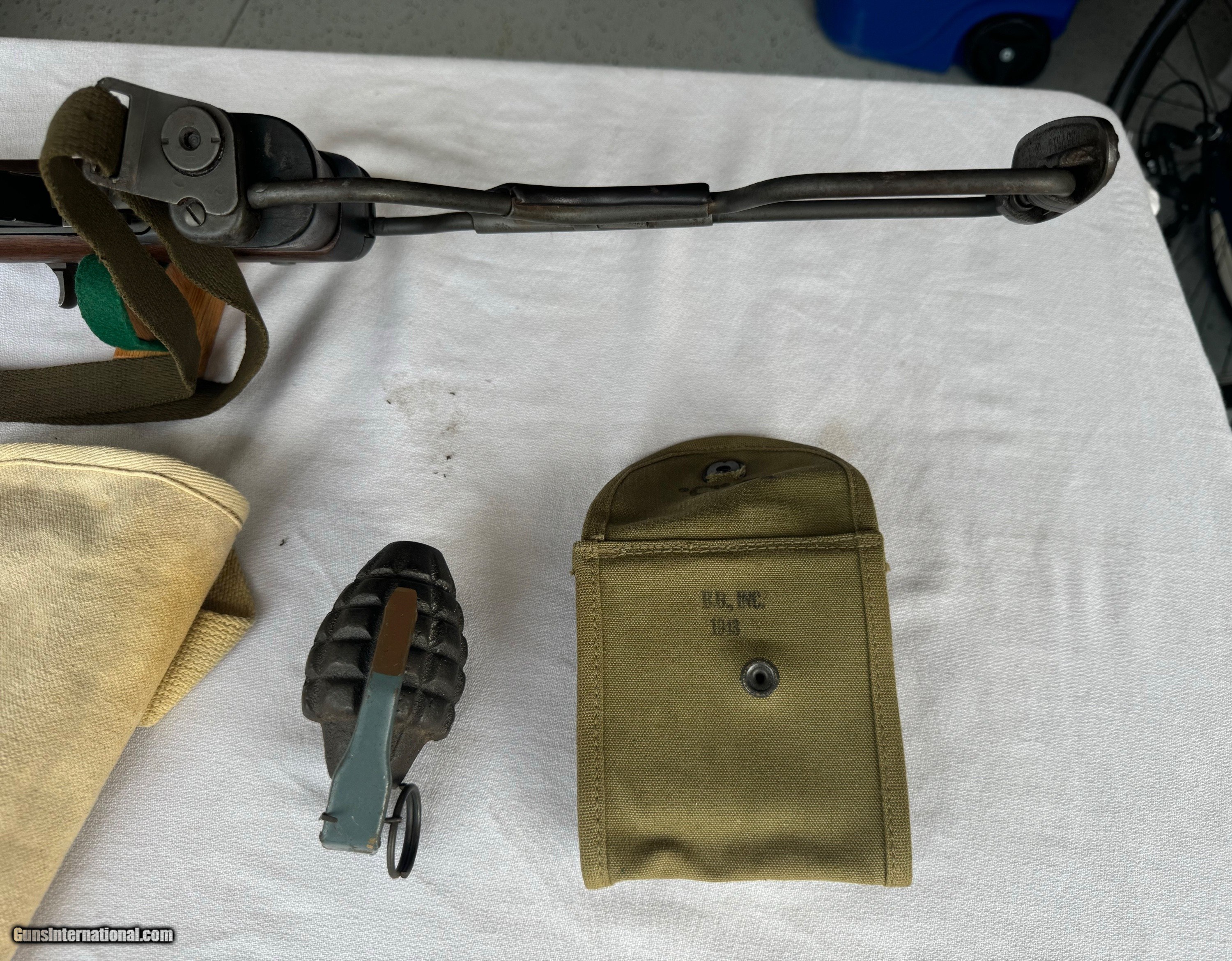 Description: Here's a Genuine Original WW2 Inland Paratrooper with extras ! Serial number 5,474,526 . Shipped in March 1944. Text book WW2 Example ! Bore and mechanics are in excellent condition. Excellent working condition. Comes with original Sling , 30 round mag and 2 - 15 round mags with U.S. pouch . Also comes with a U.S.M.C marked Jump case with dates and maker marked . Also comes with a Practice Hand Grenade. Gun has most of its original finish with wear and tear to the finish from use . Wood is original and has a neat repair on stock on right side below bolt and forend . With correct P stamp on stock indicating Arsenal wood repair . This gun seen action and shows wear from use . Comes with correct sights and inland parts throughout . Wood is also correct Inland Marked . Gun has a Inland barrel with 3/44 date. Original Folding stock is in excellent condition. Overall a Great WW2 Used but not abused correct and original Inland Paratrooper! Please review my photos and email me with any questions ? 3 day inspection as allways. Thank you for looking, Little Jo SOLD Curio/Relic: Yes Rifle Caliber: .30 Carbine Manufacturer: Inland Model: Paratrooper Serial Number: 5,474,526 Condition: Excellent |