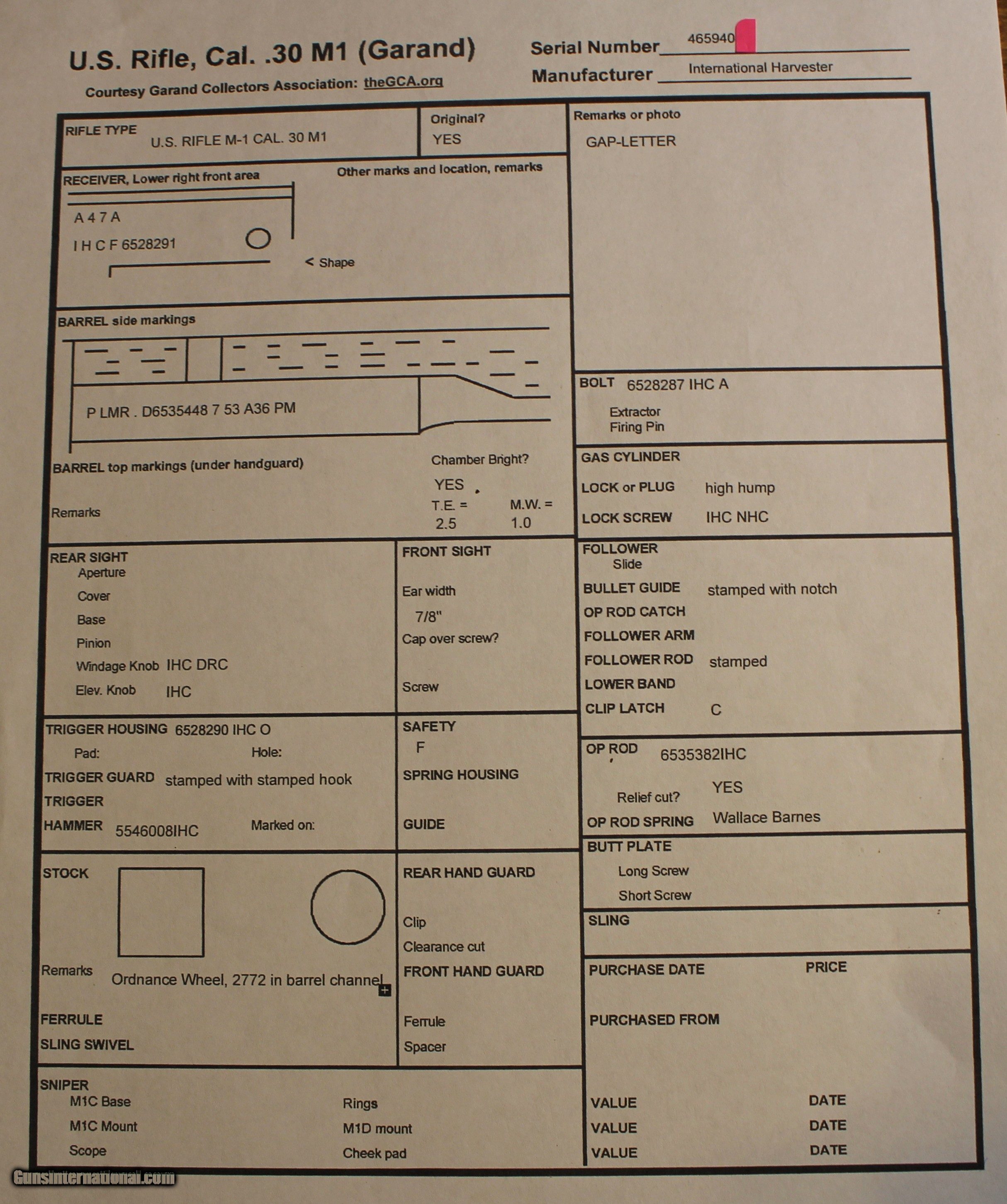 Description: Sold Returned to Owner International Harvester M-1 Garand 30.06 Gap Rifle July 1953 See Data Sheet for details on the rifle. Receiver marking is unique style in that there is a separation between "U.S." and "RIFLE"/"CAL" and ".30 M1". The aforementioned is referred to by collectors as "Gap Letter", indicating Springfield Armory manufacture. The inside if the rifle stock barrel channel 2772. Blade front and adjustable peep rear sights, with "DRC IHC" marked windage drum and "IHC" elevation drum. "Square" pattern receiver heel markings, with International Harvester bolt, trigger housing, hammer, and operating rod. Barrel is marked "P LMR" and dated "7-53" The last serial number of the firearm/receiver is covered. The build date was researched from a Scott Duff publication. and other internet publications Please see the data sheets in the pictures. I have no idea what any of it means. The estate provided them for each of the rifles and also was kind enough to show me how to remove the trigger group, receiver and stock for the pictures. We tried to get pictures of every maker's mark, logo, stamp, cartouche and whatever we could find. Look closely at the pictures as what you see is what you get. Please check the pictures to check condition. You are welcome to ask questions and ask for additional pictures. We have only listed 25 as that is all allowed. There are 132 total pictures. Just be prepared for a large download and a long time to email. Our internet connection is VERY VERY VERY slow in the country. And I really MEAN SLOW. The average time to send 70 pictures is about 6 hours This came from the estate of an FFL/SOT Gun Smith, Gun Store that is out of business. We have five seperate estates we sell for. This is just ONE of the five estates. This estate was an avid collector of Garands and components. This is from the collection or was inventory. There will be countless other listings from this inventory over the next 4 to 5 years. We are selling for the store. This is NOT a liquidation. There are no lists and will be no lists. Please check our other listings for the items. NOTE: Look close at the pictures posted As is means AS IS. There is no refund You are welcome to check out our webpage or facebook page at P&T Partners Shipping is NOT included add $60 for UPS Ground Shipping in a Plano Moulding Rifle Case and full insurance. Price is for Certified Funds meaning Certified Check or USPS Money Orders Credit or Plastic in any form, shape or manner add 3% NOTE: Credit by PHONE only WE DO ACCEPT PERSONAL OR BUSINESS CHECKS, BUT THERE IS A GRACE PERIOD OF 10 BUSINESSS DAYS ON CHECKS FROM THE DATE OF DEPOSIT. WE DO OFFER A LAYAWAY PLAN. YOU CAN LAYAWAY up to 90 to 120 DAYS . WE ALSO REQUIRE A 20% DOWN PAYMENT ON TOTAL OF LAYAWAY SALE in 7 Business days. LAYAWAYS ARE NON- REFUNDABLE. There are NO, repeat NO Credit Cards allowed on Lay-a-way. Personal or business check on any payment but the final payment. Last payment Certified funds ONLY. . I post on many of the firearms forums as PT-Partners. This is an FFL to FFL Transaction, as PT-Partners is a retail/FFL Dealer. For those that are local, there is no Face To Face. On Line means On Line General Information: FFL (Federal Firearms License) is required. Be prepared to obtain a copy of your local FFL holders license. For all in states where the local laws restrict this type of firearms, DO NOT BUY. If your local laws restrict the magazine capacity, again do not buy. I have no idea if this is a California Qualified Firearm, but I do ship to CA if you check other listings and something fits CA DOJ. If you are CA and you can PROVE, and your RECEIVING FFL contacts me, I will ship this to CA SOLD Curio/Relic: Yes Manufacturer: International Harverster Model: M1 Garand Serial Number: 465940X |
