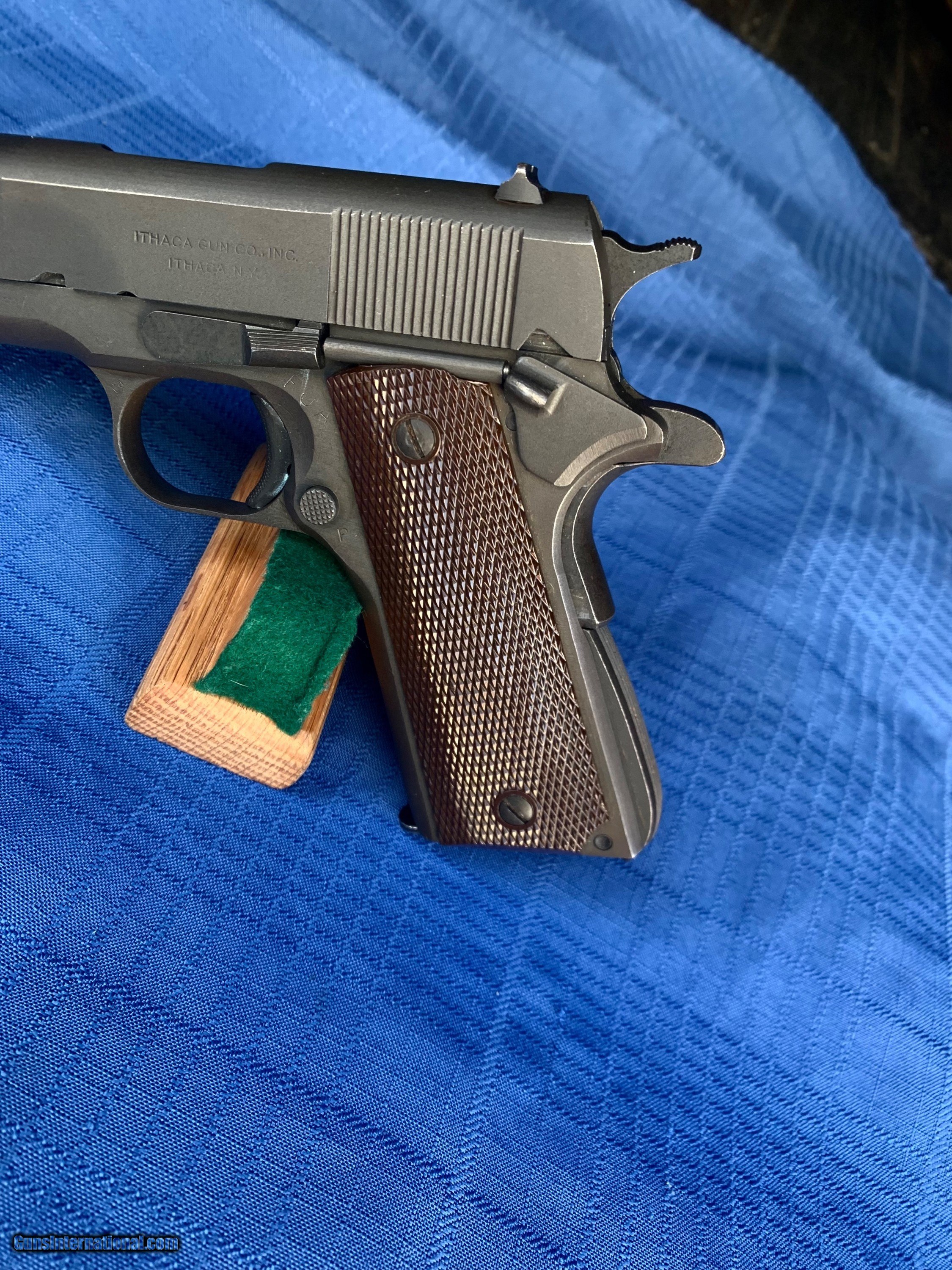 Description: Very handsome example of a Ithaca 1911A1 ! Serial number 1453024. Shipped on May 12, 1944 to Berricia Ordanance Department. Army Point , California. Gun has most all of its original Parkerized finish still remaining . Sharp markings. Gun is original and all correct 1944 Ithaca . Bore and mechanics are in excellent condition! Gun locks up tight and is in excellent working condition . Super nice WW2 Ithaca 1911A1 ! Please review my photos and please email me with any questions ? 3 day inspection As allways! Thank you for looking, Little Jo SOLD Curio/Relic: Yes Handgun Caliber: .45 ACP (.45 Auto) Manufacturer: ITHACA Model: 1911a1 Serial Number: 1453024 Condition: Excellent |