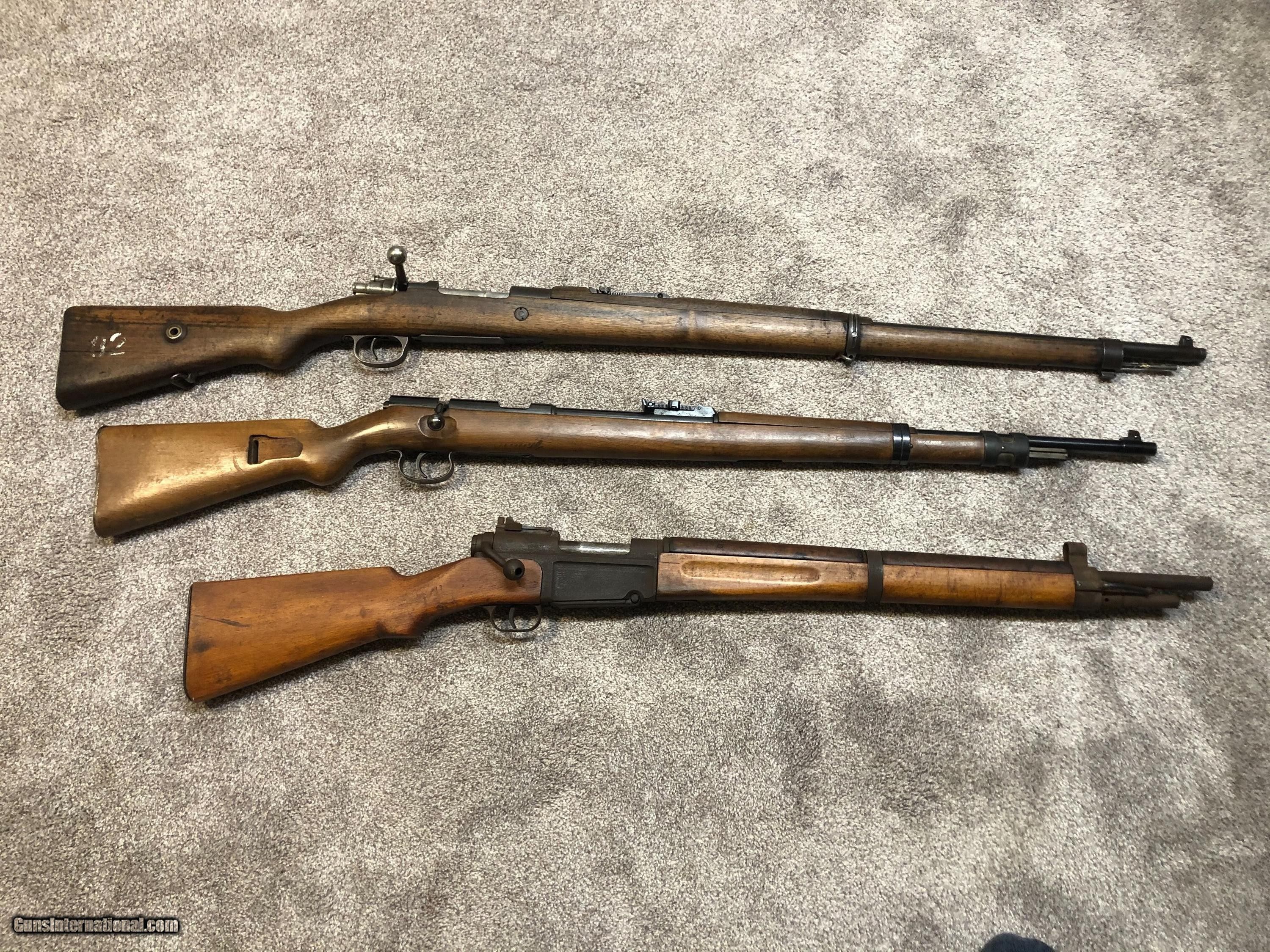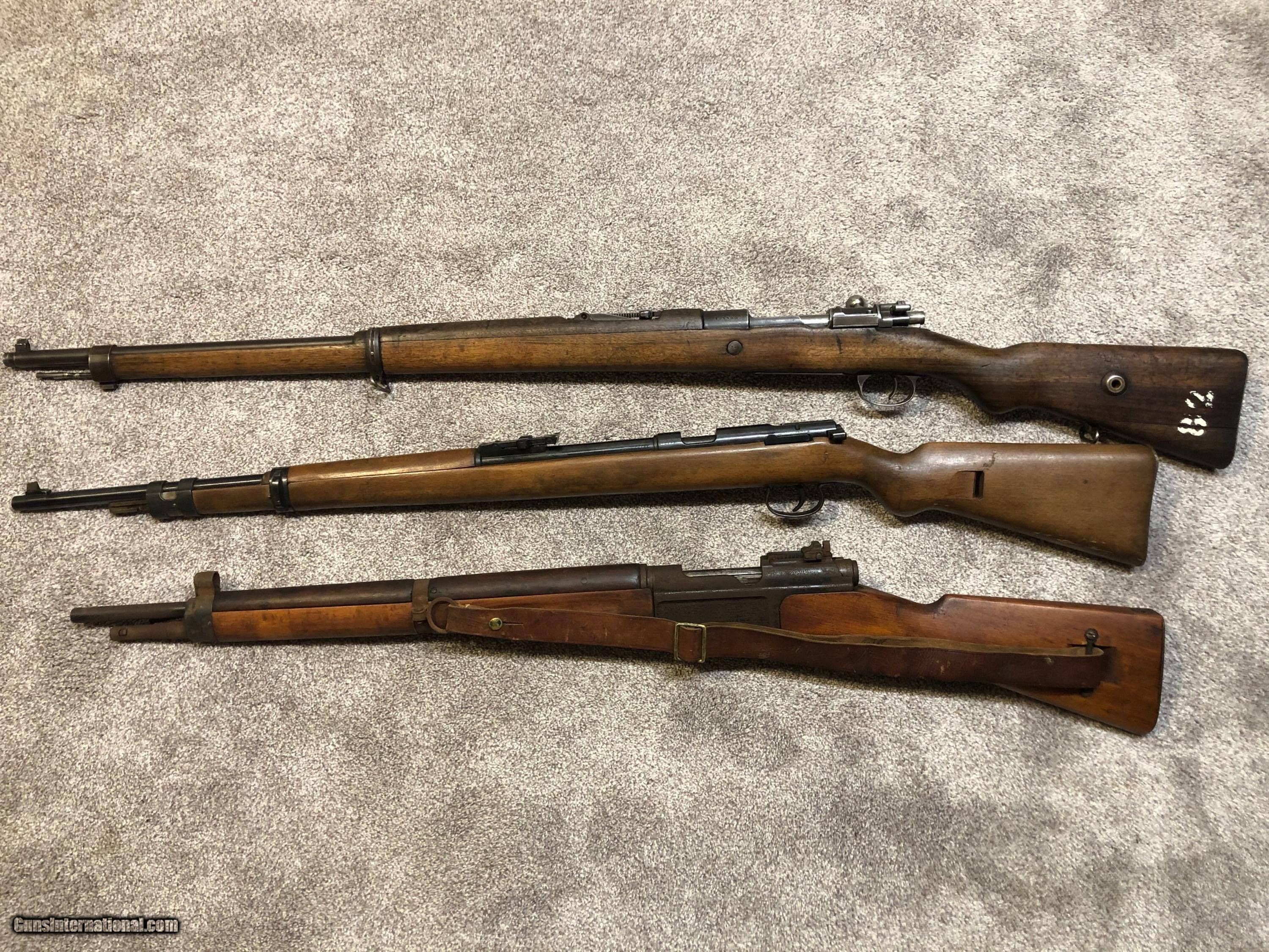 Description: mas 36, Turkish Mauser, anschutz Turkish Mauser 1944 8mm $400 Arsenal repair on lower stack w/ rack Number, overall good condition sn151485 jg anschutz 4mm $800 German training rifle sn 12337 Mas 36 vet bring back 7.5x54 $850 fairly rusty, I do not have the bring Back papers but I do have tags and metals Of the soldier that brought it back Prefer local trade but will sell. Mostly in to military surplus. If interested please email me and I will send more pictures of individual gun. SOLD Curio/Relic: Yes |