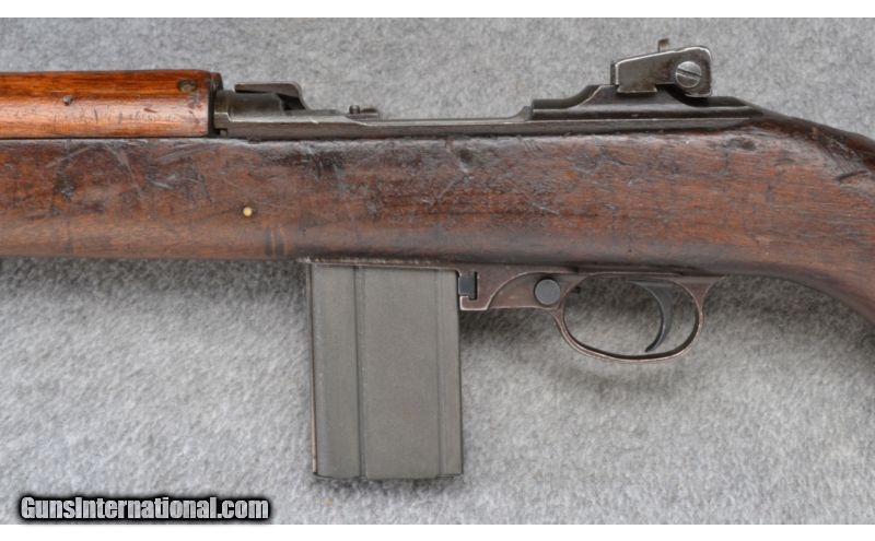Description: Metal has turned mostly a grayish patina with and excellent bright bore. Wood shows lots of use with matching serial number stamped on left side of buttstock. Upper handguard is non-matching and magazine is non-original. SOLD Manufacturer: S/N 462XXXX Caliber Info: .30 Carbine Metal Condition: Good Wood Condition: Fair Bore Condition: Excellent Barrels: 18 Triggers: Original Stock: Uncheckered Walnut Pistol Grip Stock Dimensions: 13 1/4" LOP Fore End: Uncheckered Walnut with Non-Matching Handguard Butt Pad: Checkered Steel Weight: 5 1/2 LB Sights: Military Post Front - Adjustable Aperture Rear Item Location: Wheeling, WV |