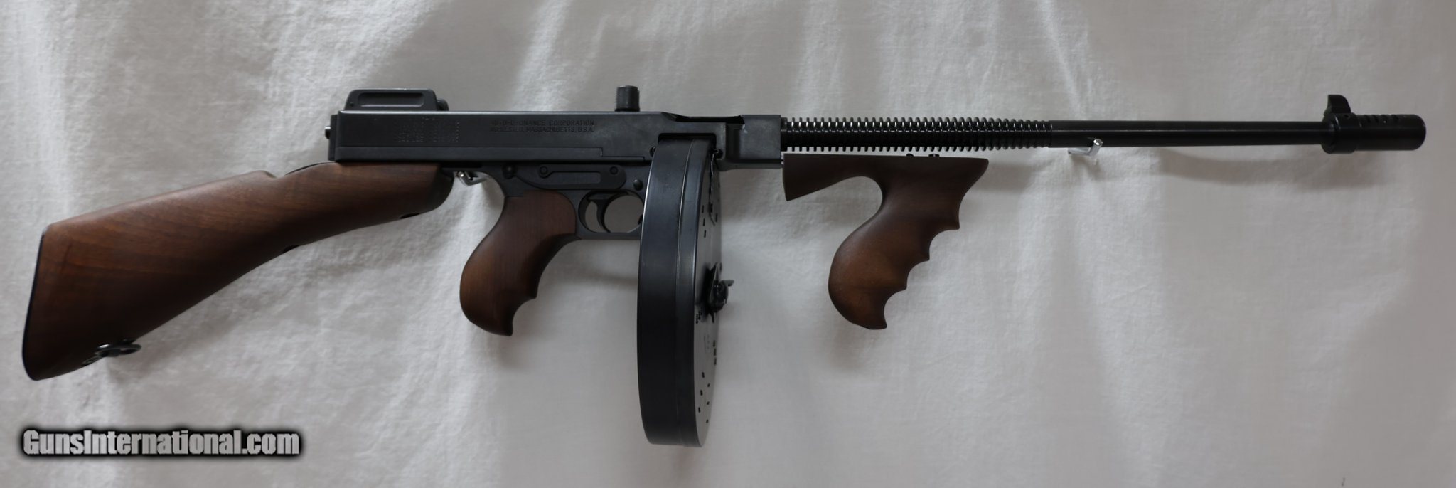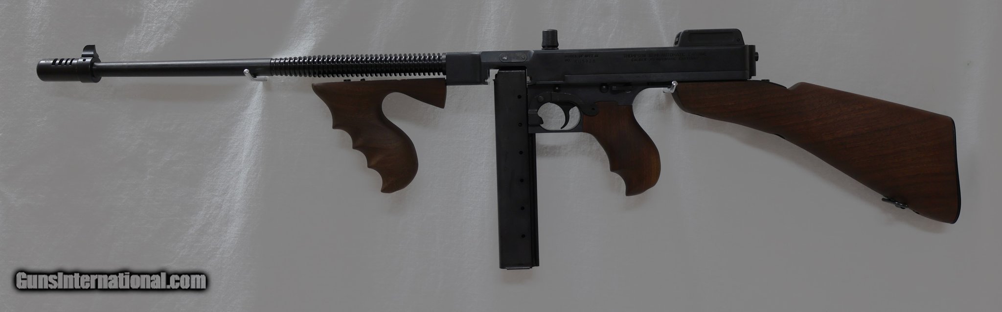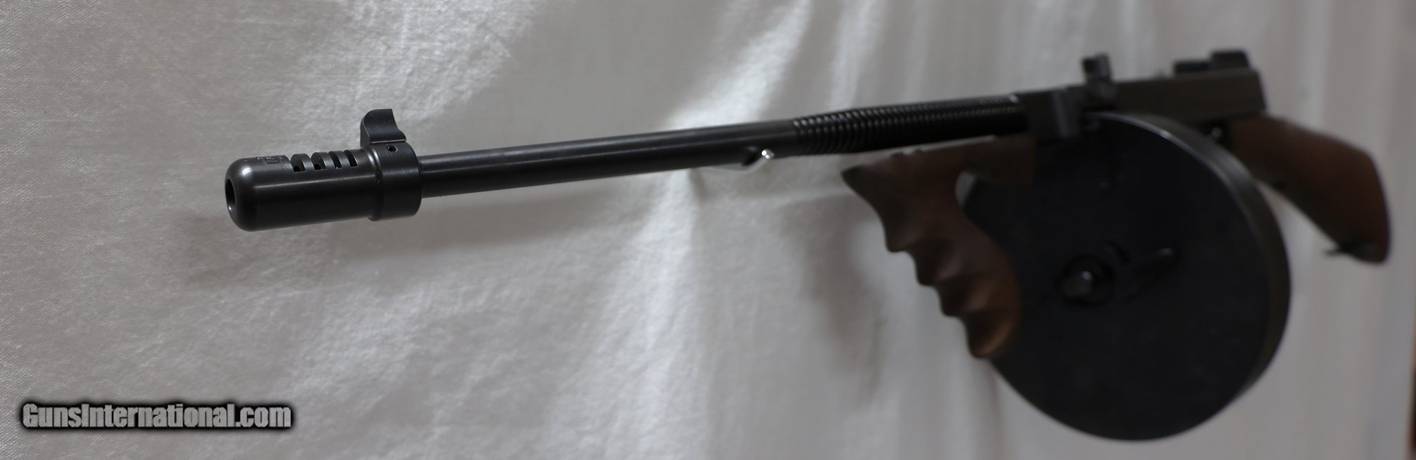 Description: Guns Listing ID: 1341119 This rifle is in \"LIKE NEW\" condition. It is unfired and in perfect condition. Any blemishes are minor from handling. Included in this sale is the Thompson hard case, one 100 round drum magazine, one 20 round stick magazine and four 30 round stick magazines. This is an excellent value on a firearm that is virtually brand new, but priced as preowned. The Thompson 1927-A1 has a pinned Cutts compensator, which lengthens the finned barrel length to 18\", and puts the overall length for the carbine at 41\" from buttstock to muzzle. It has a blade front and open rear adjustable sight. The fixed stock is crafted in luxurious polished American Walnut and has a vertical foregrip. These photos represent the exact firearm for sale. As with many used firearms, this item may contain scratches and/or signs of wear. This is not always the case but should not be unexpected. SOLD Manufacturer: THOMPSON/CENTER ARMS Model: 1927A-1 Deluxe Carbine Caliber Info: .45 ACP Condition: Used - Non-Certified Barrels: 18 BARREL Finish: BLUE |
