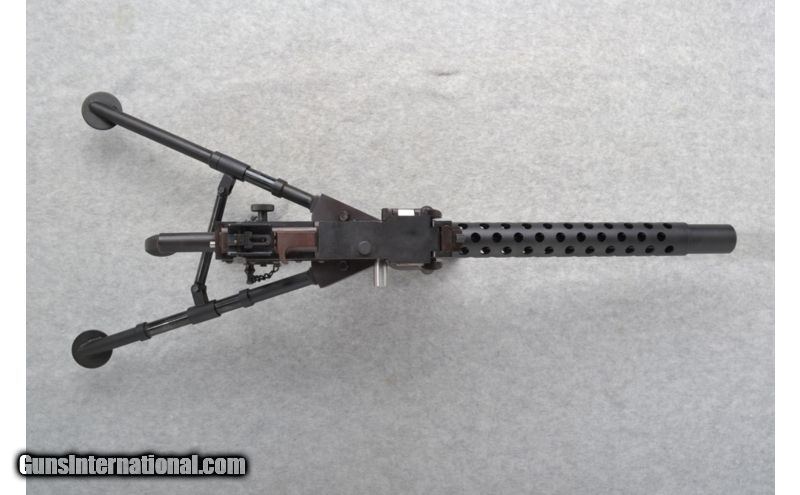 Description: This a manufactured 1/2 scale model of the Browning .30 cal. machine gun. Nearly identical in every respect. Slightly modified to take rimmed .22 Long Rifle cartidges. Modified to accomodate the limited amount of recoil pressure in .22 Long Rifle rounds. Blowback Operation. 650 RPM Cycle Rate. Fixed Tripod 14 inch - 17.5 inch. SOLD Caliber Info: .22 Long Rifle Chambers: Belt feed 100 round capacity. Metal Condition: Excellent. Bore Condition: Excellent. Barrels: 11 inch air cooled. Stock: Diamond checkered steel grip handle. Fore End: Vented black steel tube. Weight: 9 lbs. 4 oz. with tri-pod. Sights: Fixed blade front sight. Adjustable flip up tang rear. Extras: Finished hardwood carrying case includes two 100 cartridge ammo carry boxes, operators manual, one 100 round metal belt and operating diagram. Item Location: Richfield, WI |