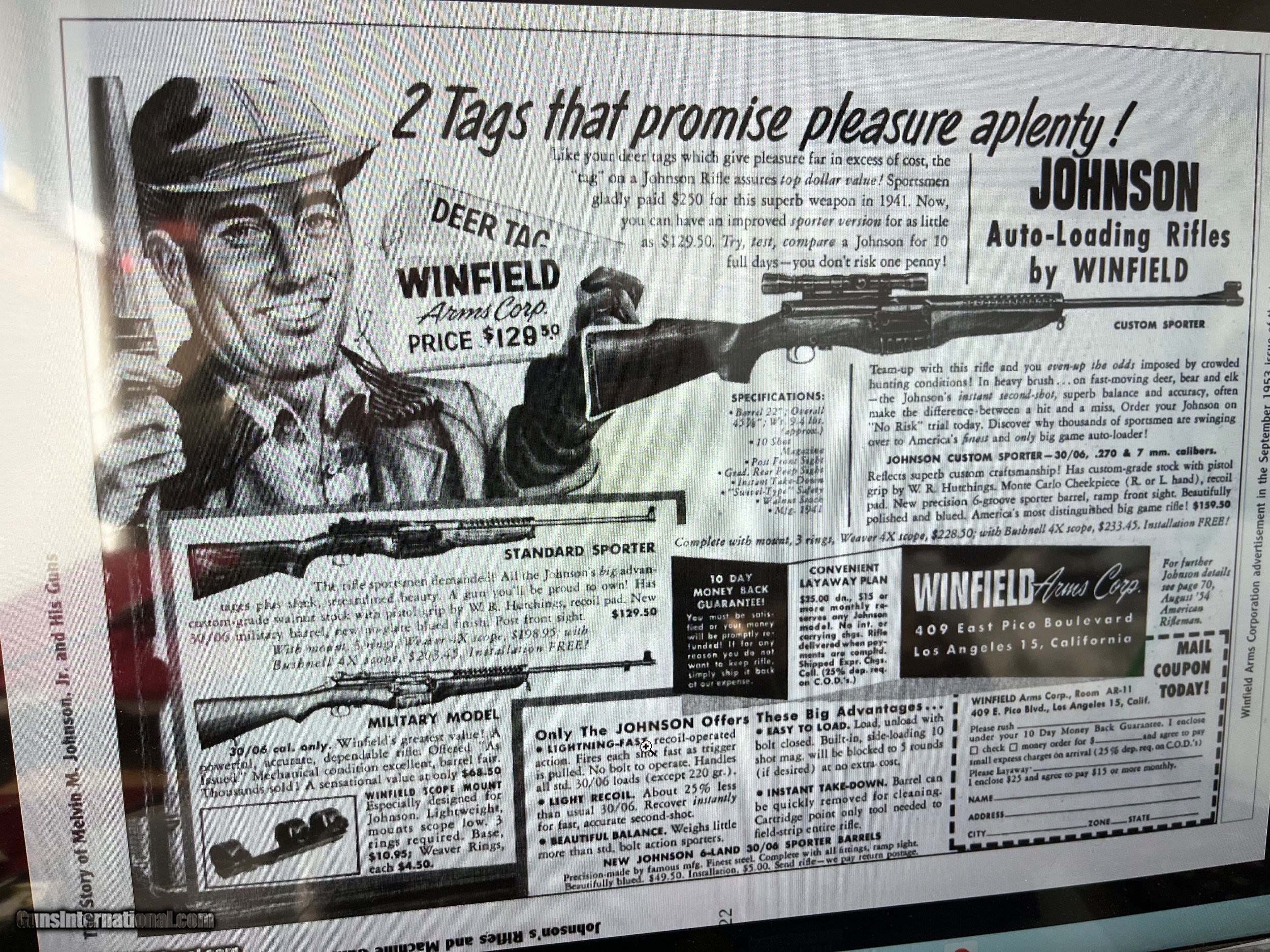 WINFIELD JOHNSON 1941 SEMI AUTO MILITARY RIFLE 30-06