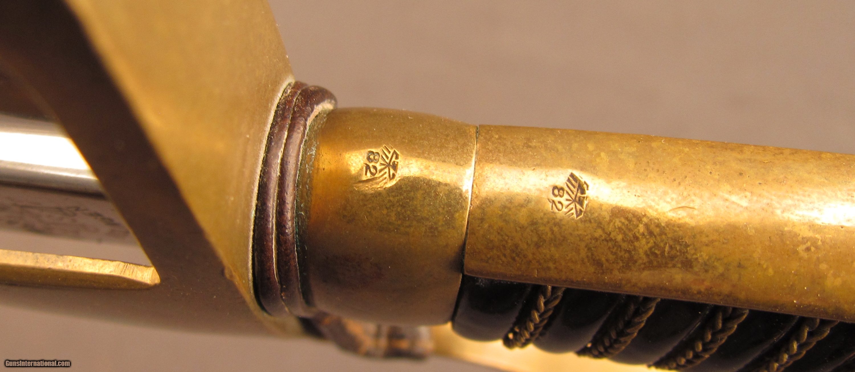Description: This is a handsome example that measures 39 3/8” overall with a 34” slightly curved, single-edged blade with long single fullers. The blade has an excellent, nearly spotless original polish, but does exhibit a few very minor specks of dark freckling on the forte obverse. A deeply struck ALCOSO “Scales” trademark is present on the ricasso reverse, as is a small Waffenamt proof on the back edge just above the hilt. The hilt itself is of standard pattern with single quillon, unmarked tombstone langets, stirrup guard, and dove pommel. The brass has a mild, yellow-ochre patina throughout with some very minor impact marks near the capstan nut, and the numerous Waffenamt proofs and issue stamps are all crisp and clear. The leather “fingerschlauf” (finger loop) is crazed and lightly flaked, but still intact and quite supple. The black composite grip is in excellent condition with a tight, original wire wrap. The matching numbered scabbard has a smooth, blue-brown patina with a few shallow dents along the body on either side. This is a great example of a Heer-issued sword and would make a splendid addition to any collection. SOLD Manufacturer: German Model: Ordnance |