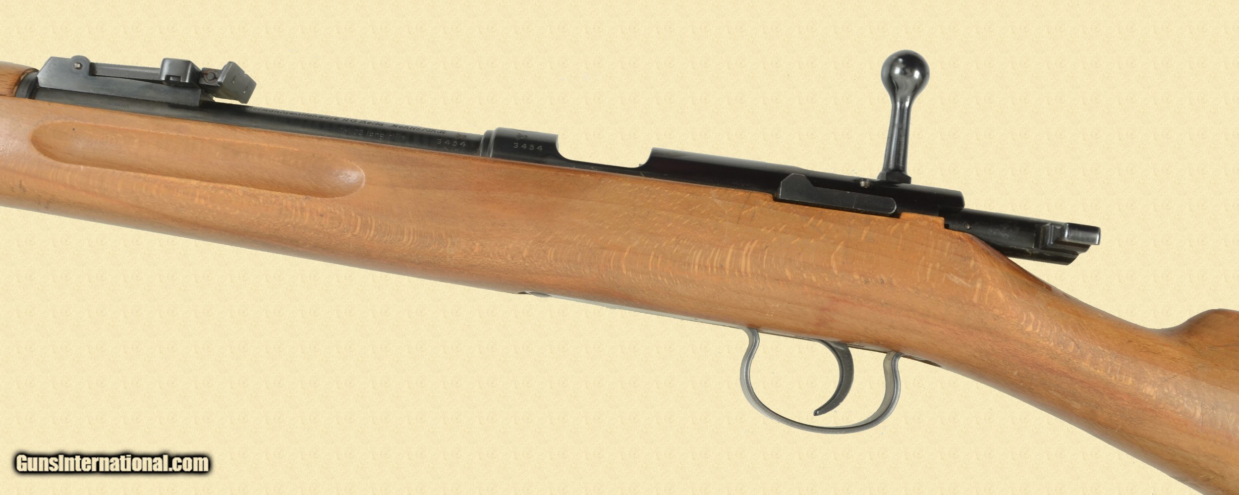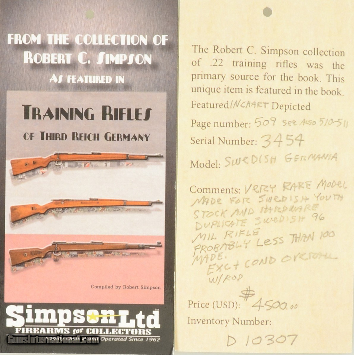 Description: 22 Caliber; 98% blue, excellent+ bore, excellent+ stock, 26'' barrel, Very rare model made for Swedish Youth. Stock and hardware duplicate Swedish 96 military rifle. Probably less than 100 of these made. This gun is featured on chart, page 509 of Training Rifles of the Third Reich Germany, compiled by Robert C. Simpson. Has cleaning rod., Please call (309)342-5800 Tues-Fri, 10 am -6pm (CST), or Sat 1pm-6pm (CST), to speak with our sales team for further information, or to purchase firearms. FEDERAL FIREARMS LICENSE (FFL): is required on all shipments of modern guns. We must wait for a copy from your dealer before we can ship to them. We will also ship C&R eligible firearms to Curio and Relic (C&R) license holders. We accept your signed, legible FFL and C&R licenses via fax at 309/ 342-5730 (always on), email at FFLsimpsonltd or through the mail at Simpson Ltd; 140 S Seminary St; Galesburg, IL 61401. Pre-1898 firearms and non-firearms items are exempt from licensing requirements. All items shipped to an Illinois address will be charged 8.75% sales tax. NOTE: Because of recent shipping restrictions and charges placed on us by UPS and FedEx (handguns must ship via next day or 2nd day air and they have added a $10 surcharge for parcels over 48”. Our return policy lasts a maximum of 3 days from the time you receive your item. If 3 days have passed since you received your purchase, and we have not been contacted by you, unfortunately, we can’t offer you a refund or exchange. If you are not happy with your purchase, please contact us by phone and/or email to arrange for a return. Items must be shipped back to us to arrive with 7 days of notification of return. SOLD Curio/Relic: Yes Serial Number: 3454 |