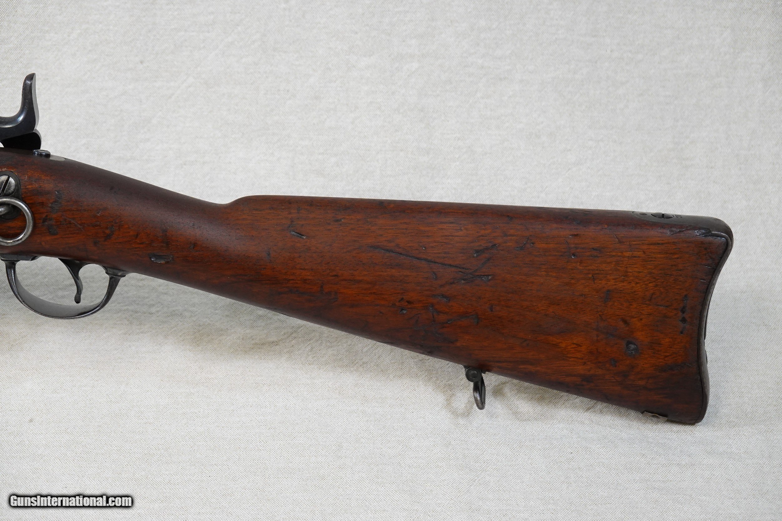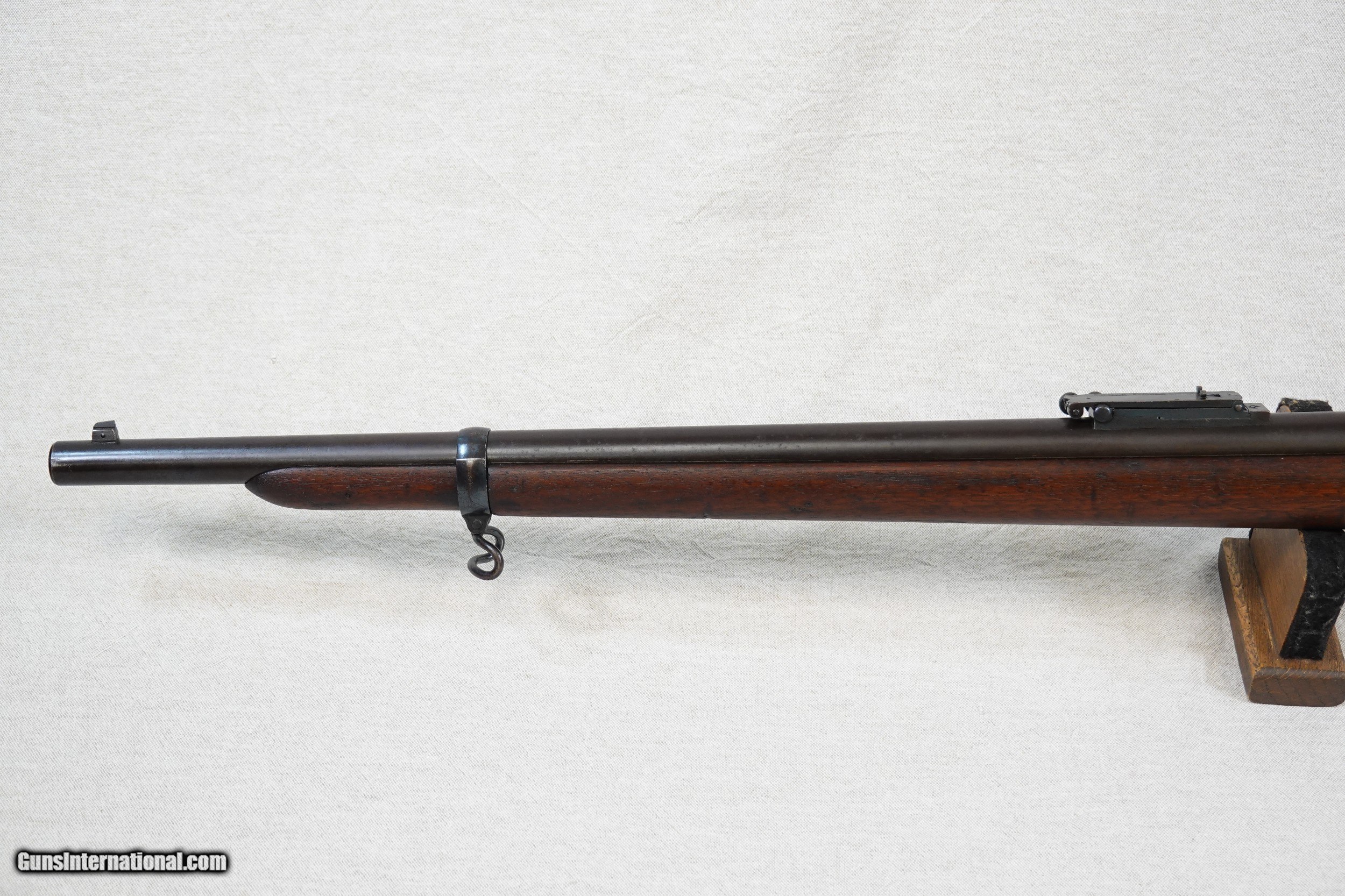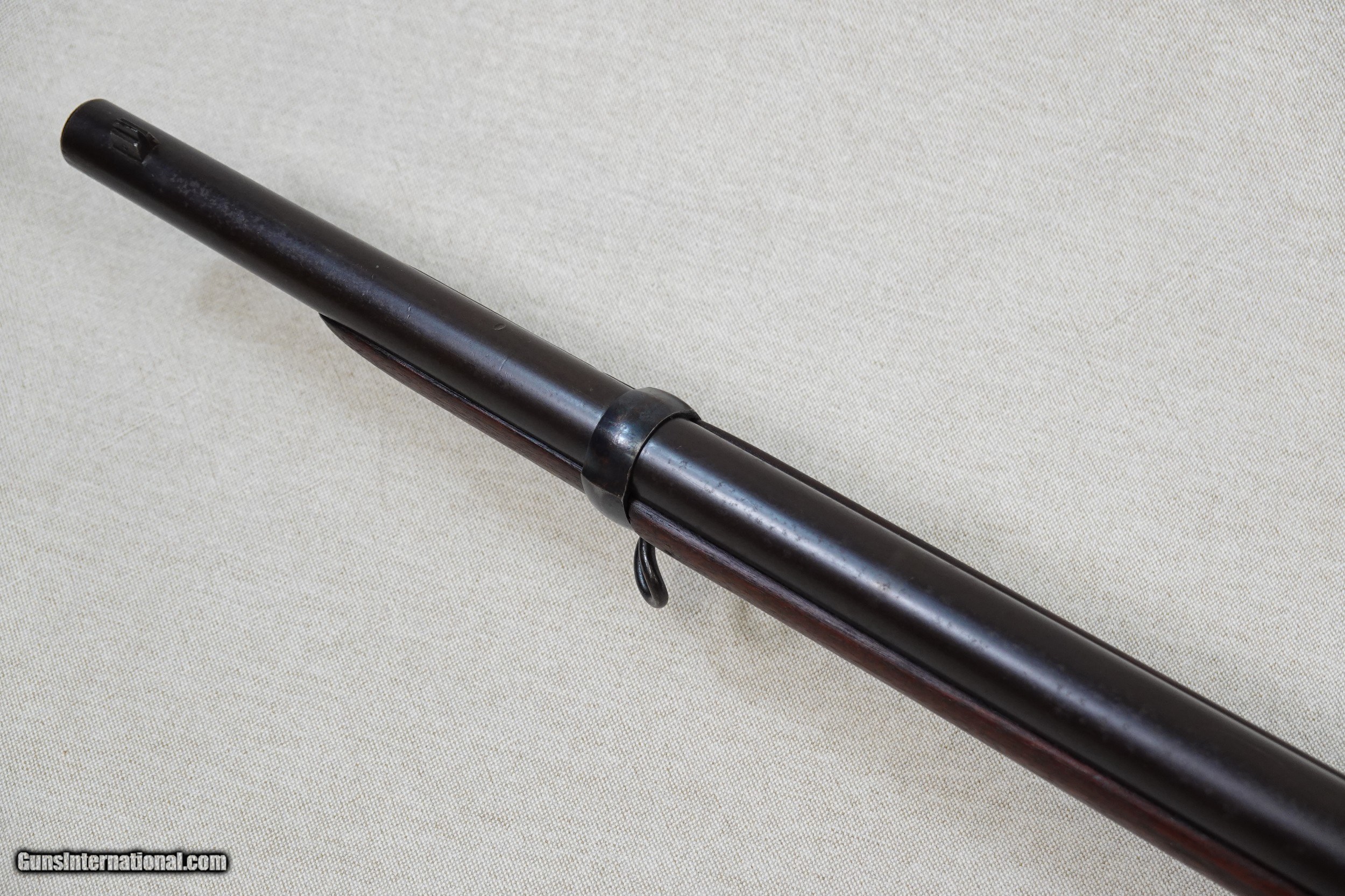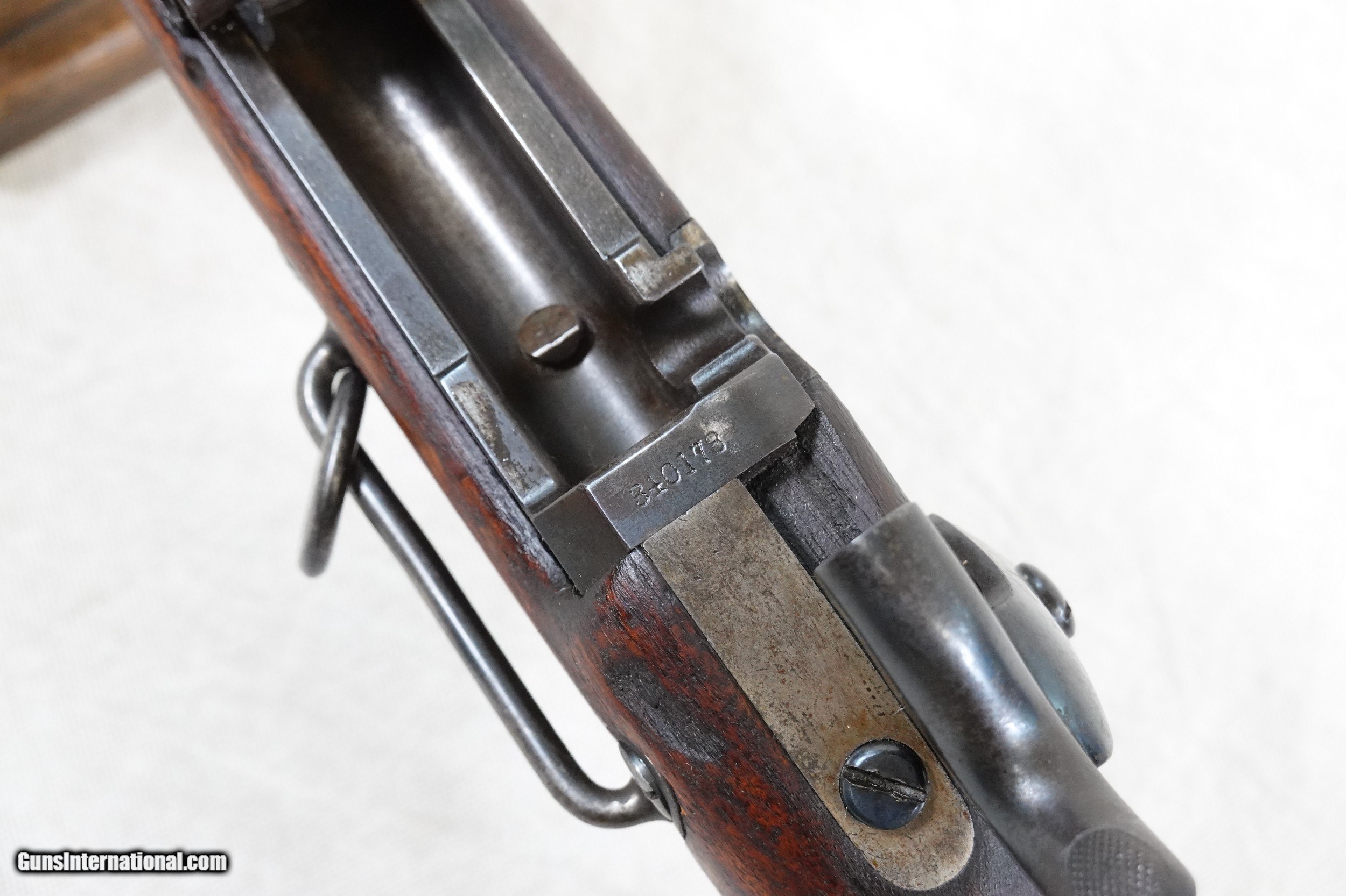 Description: This is a an exceptionally rare, 100% original, Springfield Model 1886 Experimental Trapdoor Cavalry Carbine in .45-70 caliber. In an attempt to equip U.S. Cavalry troops with a more efficient arm than the standard Model 1873 Carbine, Springfield Armory manufactured 1000 experimental carbines in 1886 with 24" inch barrels and the Allin-system single shot action. These Model 1886 Experimental Carbines featured a 3/4 length stock with a rounded forend tip, a 24" inch barrel, a 3-click tumbler action, a grooved trigger, a single upper barrel band fitted with a curved sling swivel (for ease of inserting the carbine into a scabbard) secured by a bandspring, a conventional lower sling swivel inlaid into the keel of the buttstock, a steel triggerguard assembly with no sling swivel provision, a Buffington rear sight marked "XC", a standard sling bar and ring on the left side of the carbine, and a trap-equipped steel buttplate which housed a multi-piece cleaning rod which was 1" inch longer than standard. The stock itself was newly designed and manufactured for this model rather than modifying an existing pattern, and in addition to being of 3/4 length featured a long comb with a short strong wrist. The 1886 Experimental Carbine was finished with an armory blue on all of the steel parts except for the breech block, which was color case-hardened. Almost all of the 1000 Experimental Trapdoor Cavalry Carbines produced went on to be issued to U.S. Cavalry units stationed in the American West, where they were used extensively in the ongoing American Indian Wars and various conflicts. While the carbine proved to be an excellent weapon for the time, the advantages over the standard carbine were not great enough to warrant a full-scale switch and there were no more of these neat carbines manufactured. Due to the relatively high attrition rate of U.S. Cavalry weapons in the American West, the number of original 1886 Experimental Cavalry Carbines surviving today is very small, making this a very sought-after Springfield. This particular example is serial number 840178, and it remains in 100% original condition. It has not been modified or "improved" in any way, it is just how it left the Springfield Arsenal in 1886. The original factory blue finish on this carbine is still intact but shows some moderate honest wear and areas of prior rust that have long been removed. The exterior of the barrel has turned a brown-blue with some scattered light pitting, while the lockplate and hammer retains 75% of the factory blue. The case colors on the breech block have faded to a gray-blue, while the upper barrel band, Buffington rear sight, the lower sling swivel, and triggerguard still show some nice areas of bright gloss blue around the worn spots. As you can see from the pictures, all of the metal parts have a very uniform and consistent patina that is attractive and speaks to the originality of this weapon. All of the factory markings on this Springfield are nice and visible including the spread U.S. Eagle motif and lettering on the lockplate, the "U.S. Model 1884" on the breech block, the serial number at the rear of the receiver, and the "V" & "P" proofs on the left side of the barrel. The special Buffington rear sight is in superb condition with perfect, fully-legible markings and range indications. These "XC" marked Buffington sights were only used on this carbine and nothing else, and can be identified as original by both the "XC" marking at the top of the folding leaf and by the range graduations, which were different from any other Buffington sight as they were sighted specifically for this 24" inch carbine. The bore in this Springfield is excellent, mirror-bright and clean. The rifling is still sharp and well-defined, and there is just a touch of frosting in a few spots in the grooves. Of note is the crown of the muzzle, which has a very distinctive sharp step in it due to the standard crowning tool used on it which was designed for the standard rifle barrel of a slightly different diameter. The original stock on this 1886 Experimental Carbine is solid and in great shape overall, free from any cracks, repairs, or major damage. The stock shows scattered minor dings, dents, and handling marks that you would expect to see on an issued military weapon but no eyesores or bad spots. The worst of the damage is a small chunk of wood missing from the right side of the upper tang, however it is usually hidden by the hammer and breech block lever. This can be seen in picture # 16. All of the original stock hardware is all still intact and in good condition, and everything fits together tightly. The original buttplate is in good shape overall, showing wear consistent with the rest of the carbine. The trap door still works smoothly and properly, and the trap itself still contains all 3 of the original cleaning rod sections (which are the special 1" inch longer design) and the broken case extractor. This Model 1886 Experimental Trapdoor Cavalry Carbine is in 100% perfect working order. The 3-positions of the hammer are still intact and functional, the breech block locks in and out of battery perfectly, the ejector still fires properly, the firing pin floats freely, and the trigger breaks nicely with a light pull. This is an exceptionally nice all-original example of a very rare Springfield Trapdoor variation, and would be a centerpiece-type of addition to numerous focused or general gun collections. Whether you are a collector of Springfields, Trapdoors, U.S. Military weapons, American West weaponry, experimental weapons, or general antique weapons, this very rare Springfield Experimental Carbine should be of great interest. SOLD Antique: Yes Rifle Caliber: .45-70 Government Manufacturer: Springfield Model: Model 1886 Experimental Cavalry Carbine Serial Number: 840178 Barrel Length: 24" Inches Condition: Very Good Metal Condition: Good / Very Good Wood Condition: Very Good Bore Condition: Excellent Action: Tr