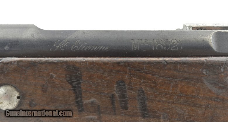 French Model 1892 Berthier 8mm caliber carbine. Made in 1896 at the St. Etienne Arsenal. Serial numbers are matching, except magazine shell. Bore has strong rifling with an area of pitting. Wood has an arsenal repair at the toe very good overall condition.