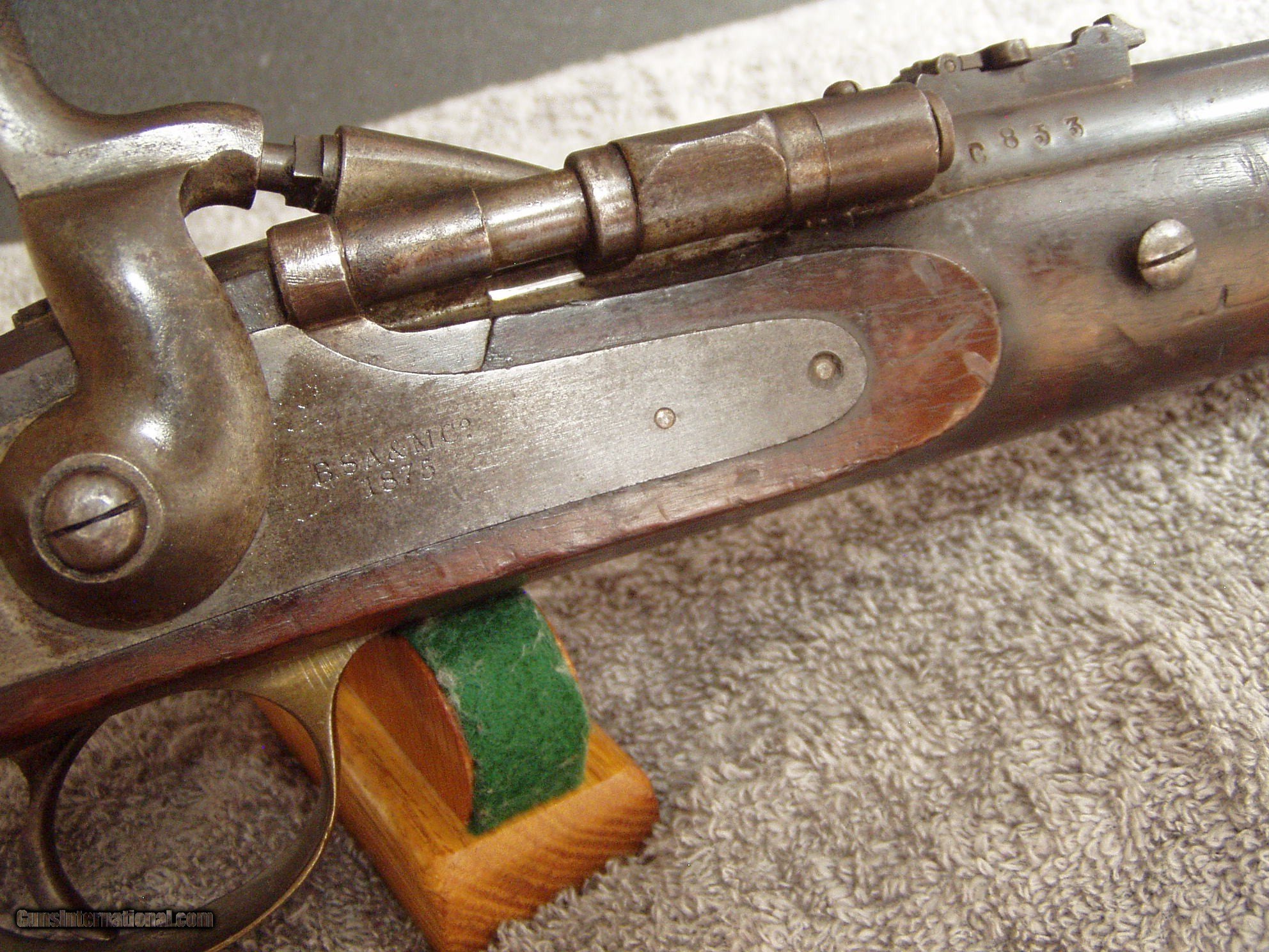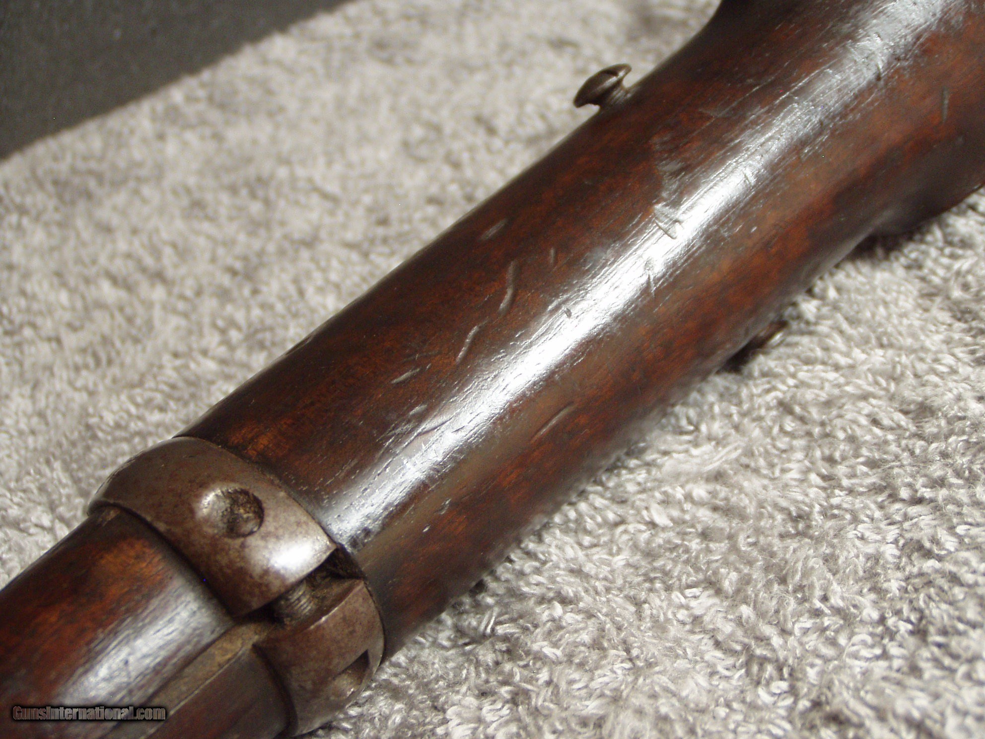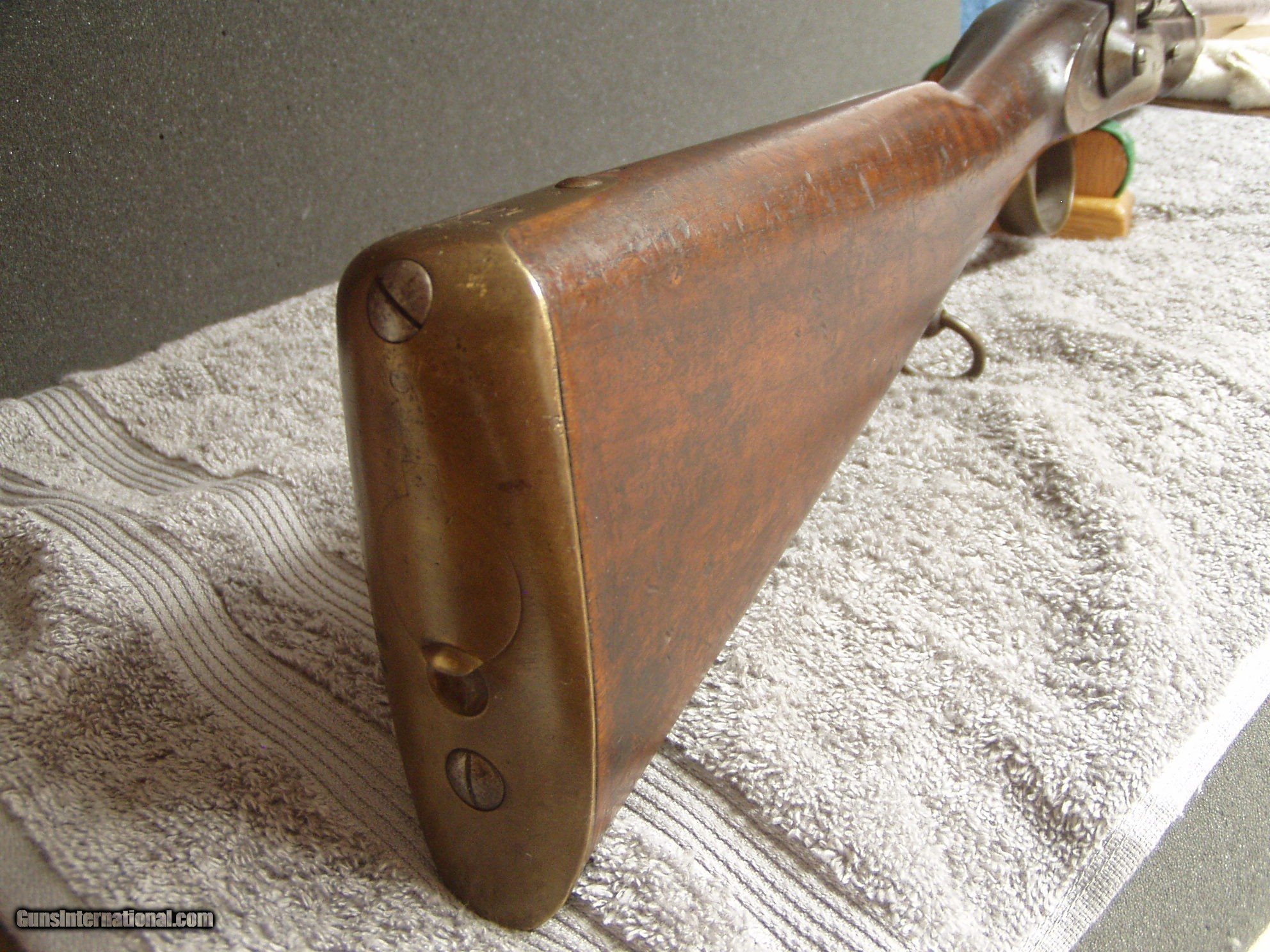 Description: This is a solid ,well used 1875 dated British Snider Cavalry Saddle Ring Carbine. It is Caliber. 577. Serial number # C853. Has a 2-piece cleaning Rod fitted in a trap in the butt plate. Has a flat hammer face. This is a fine example of usually hard used British SRCs. Standard configuration. Barrel is .19" with the Snider patent breech, brass mounted other than steel barrel. band. Rear sight is a ladder type to 600 yds. Very good overall condition. Barrel . retains strong traces of blued finish, overall mixed plum patina with staining & pitting. Breech retains strong traces of finish, as does lock with crisp markings including unit markings on buttplate tang. Stock is sound & well fit wwith sharp edges, minor chipping & numerous storage dings & dents. Mechanically fine with a bright shiny rifled bore. Buyer Pays $35.00 shipping to the lower 48 states. I accept USPS Money Orders or Bank Cashier's Check. Will accept Personal check, with shipping hold. 3% Credit Card Fee. Three day non-firing, non-disassembly inspection period. If returned, for any reason, full refund less shipping. Layaway Available! One third down, balance on or before end of 90 days. Other reasonable layaway options considered. ANTIQUE! SOLD Antique: Yes Manufacturer: BRITISH Model: SNIDER SRC Serial Number: SERIAL #C853 Bore: 19 Chambers: ONE Ejectors: MANUAL Condition: VERY GOOD Metal Condition: VERY GOOD Wood Condition: VERY GOOD Bore Condition: VERY GOOD Barrels: ONE Barrel Type: ROUND Action: SINGLE ACTION Triggers: ONE Stock: WALNUT Fore End: WALNUT Finish: PATINA Sights: BARREL &LADDER Manufacture Date: 1875 |