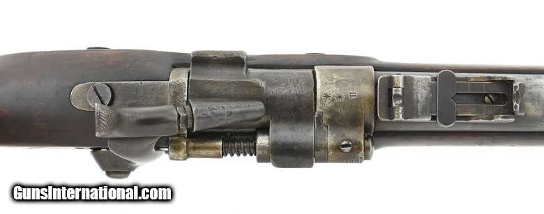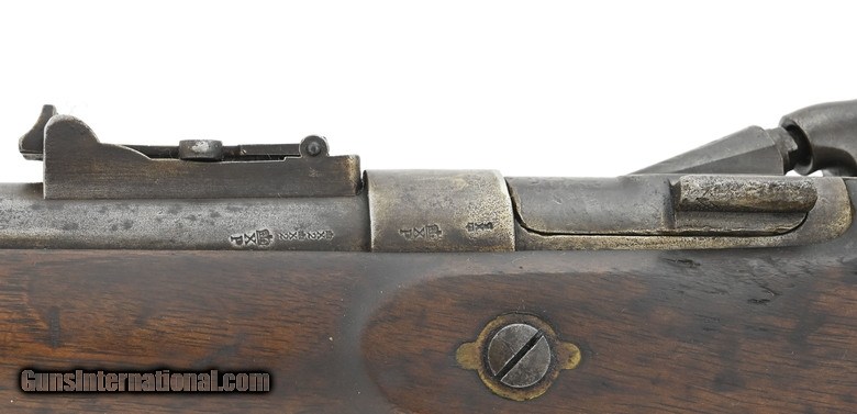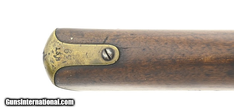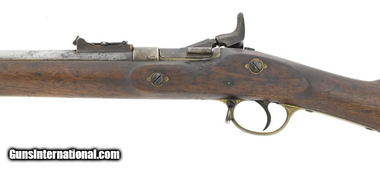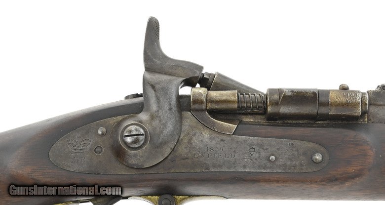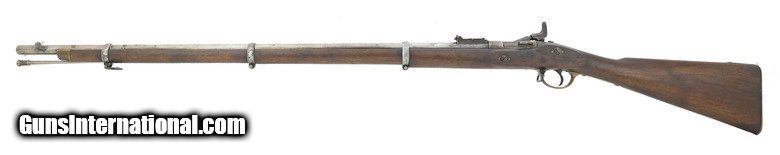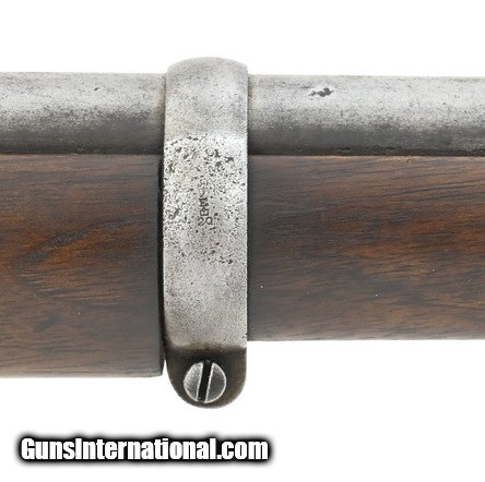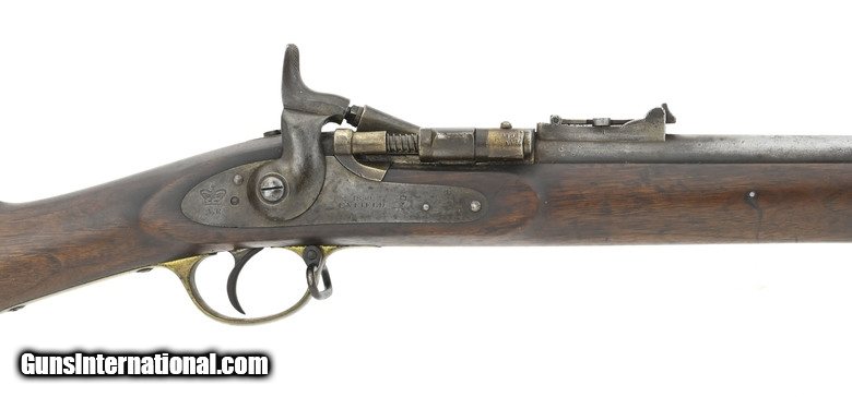 British Army Pattern 2** Snider .577 Centerfire rifle. The overall length is approximately 55”. The 36½” round barrel has a fair bore with areas of pitting. The barrel has three proof marks. The top of the chamber is stamped “II/*/*”. The breech block is marked “L.S.A.C.” with a small proof mark behind it. L.S.A.C. (London Small Arms Company) performed the conversion from a percussion muzzle-loading rifle-musket to a breech-loading .577 caliber centerfire rifle. The lock is marked in the center “1859/Enfield” with crown/broad arrow forward and a very small “14” at the top front. The tail has the crown/VR. The barrel has a gray/brown patina and the lock, action, and hammer exhibit a smooth brown patina. The bands are bright with areas of light pitting. The brass nose cap, trigger guard, and butt plate are fine. The stock is very good with no cracks or chips. The right side of the butt is marked from top to bottom “4/35/ round Enfield stamp/5/1867”. The 5/1867 denotes the May 1867 conversion date. The butt plate tang is marked “62/158”. The action functions correctly. The pattern 2** was introduced in May 1867, so this is an early example. All Snider rifles and carbines are scarce. This is a very presentable example to fill that hole in your collection.