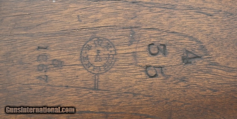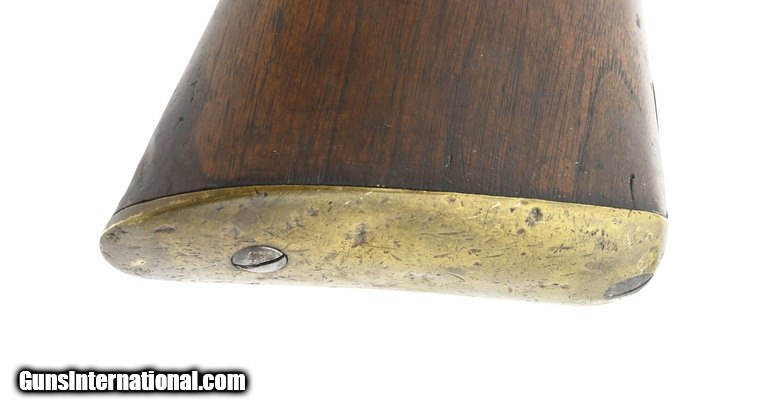 Description: " British Army Pattern 2** Snider .577 Centerfire rifle. The overall length is approximately 55”. The 36½” round barrel has a fair bore with areas of pitting. The barrel has three proof marks. The top of the chamber is stamped “II/*/*”. The breech block is marked “L.S.A.C.” with a small proof mark behind it. L.S.A.C. (London Small Arms Company) performed the conversion from a percussion muzzle-loading rifle-musket to a breech-loading .577 caliber centerfire rifle. The lock is marked in the center “1859/Enfield” with crown/broad arrow forward and a very small “14” at the top front. The tail has the crown/VR. The barrel has a gray/brown patina and the lock, action, and hammer exhibit a smooth brown patina. The bands are bright with areas of light pitting. The brass nose cap, trigger guard, and butt plate are fine. The stock is very good with no cracks or chips. The right side of the butt is marked from top to bottom “4/35/ round Enfield stamp/5/1867”. The 5/1867 denotes the May 1867 conversion date. The butt plate tang is marked “62/158”. The action functions correctly. The pattern 2** was introduced in May 1867, so this is an early example. All Snider rifles and carbines are scarce. This is a very presentable example to fill that hole in your collection. SOLD Antique: Yes |