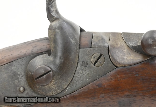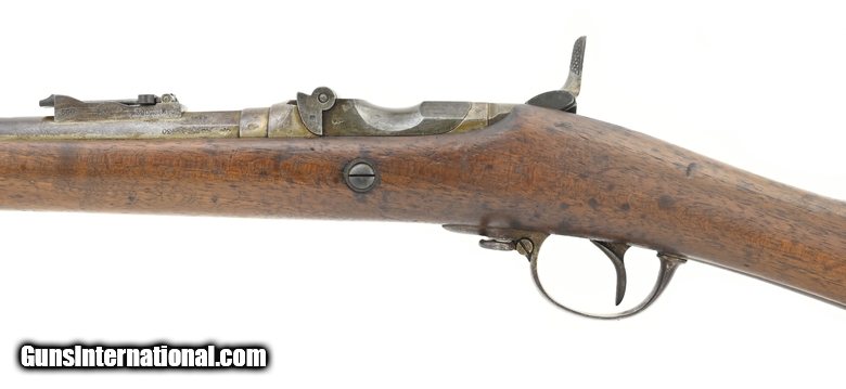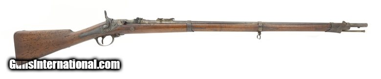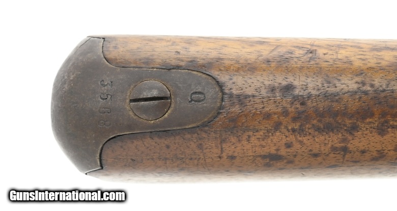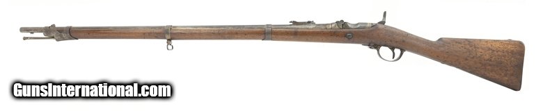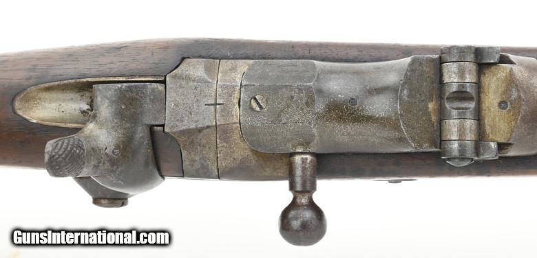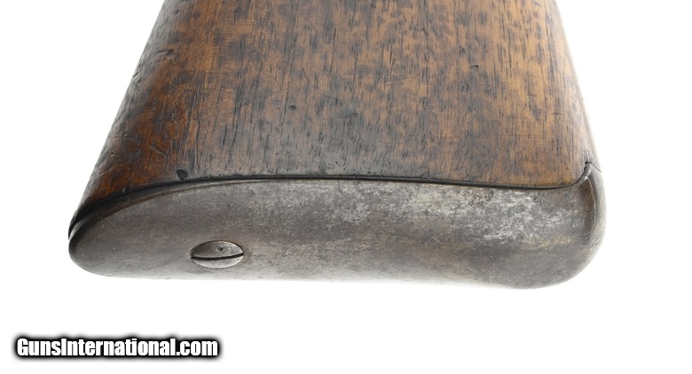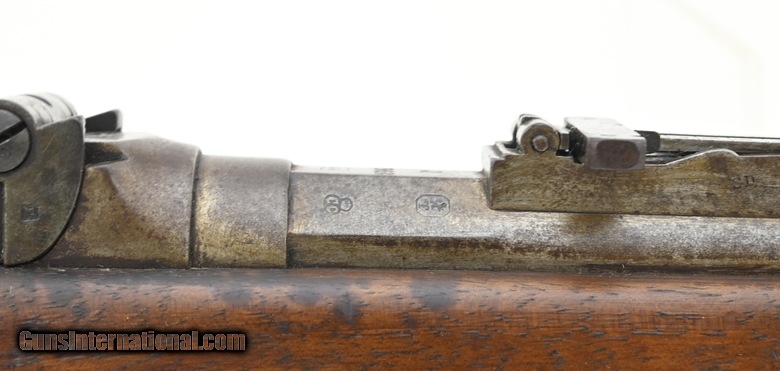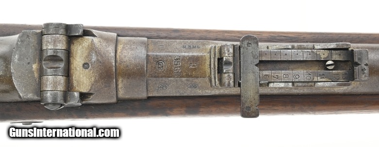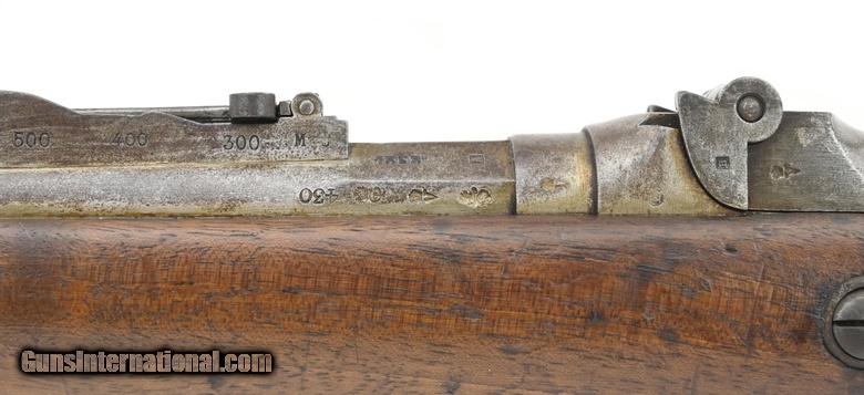 Description: "British-manufactured Albini-Broendlin rifle dated 1868. The majority of these rifles were manufactured in Belgium for their use and for foreign customers, including Japan. This rifle has the crown over “V" Victorian-era proofs on the barrel, receiver, and breechblock. The caliber is marked “.430" on barrel and the rear sight is graduated in meters, a sign it was made for export. Overall length is 53½". The approximately 34½" round barrel is chambered for the 11x50Rmm centerfire cartridge. The bore is excellent. The original bright finish has a pleasing smooth brown patina. The stock is very good with issue dings and scrapes, but no cracks or chips. Serial numbers match. The action functions correctly. The cleaning rod is a replacement. The sling swivels are present. Barrel has a bayonet lug on the bottom, approximately 1 1/16" from the muzzle. This is a very nice example of the rarely-seen British-made Albini-Broendlin rifle. This rifle conforms to the Belgian Model 1888 pattern. SOLD Antique: Yes |