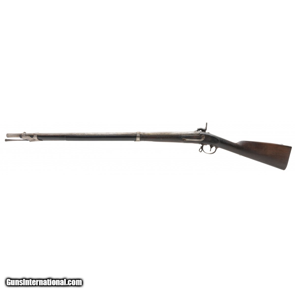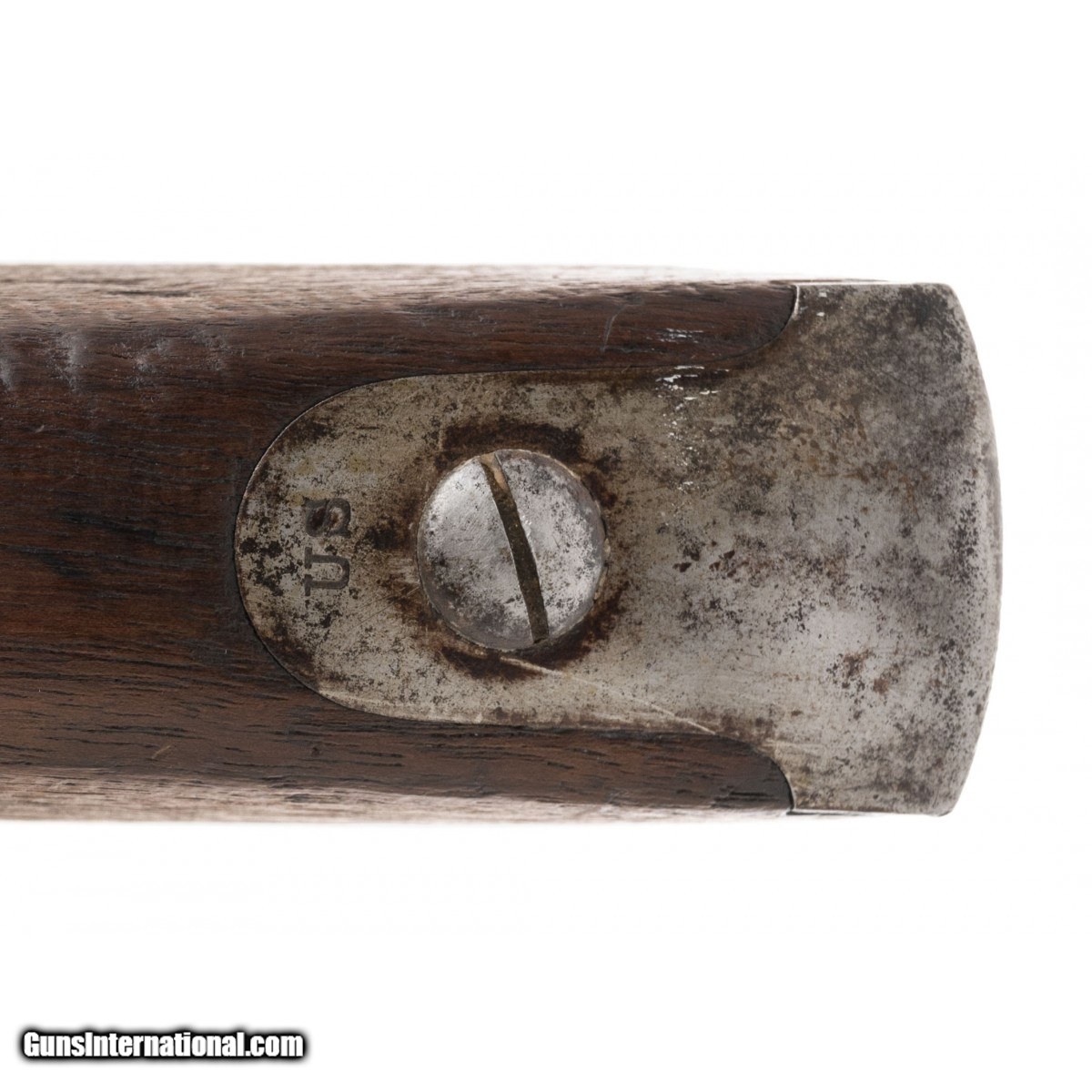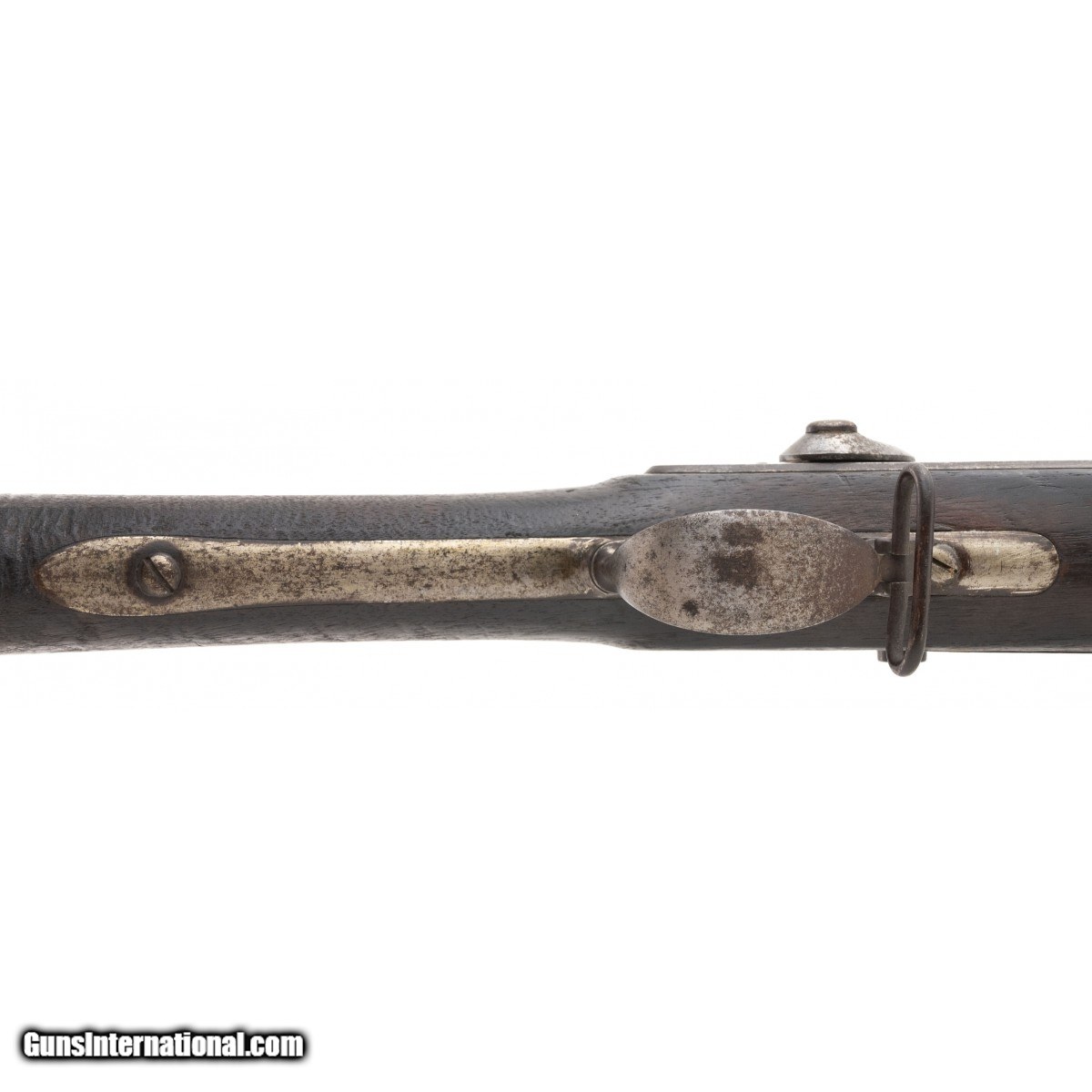 Description: " This 69 caliber smooth bore percussion U.S. Model 1842 musket has been reduced to cadet size. The overall length is approx. 51.5"". The approx. 35.75"" barrel has a good dark bore with light roughness. All the metal is bright with scattered staining. The barrel breech has the V over P over eagle inspection marks. The lock has the eagle over US at the center and SPRING over FIELD over 1854 at the tail. The shortened two band stock is very good with an indention on the left flat for an inlaid plaque. The forend has a step where the original middle band was located. The action functions correctly. This interesting gun may have been altered for military school use. SOLD |
