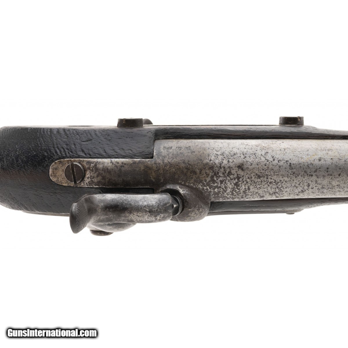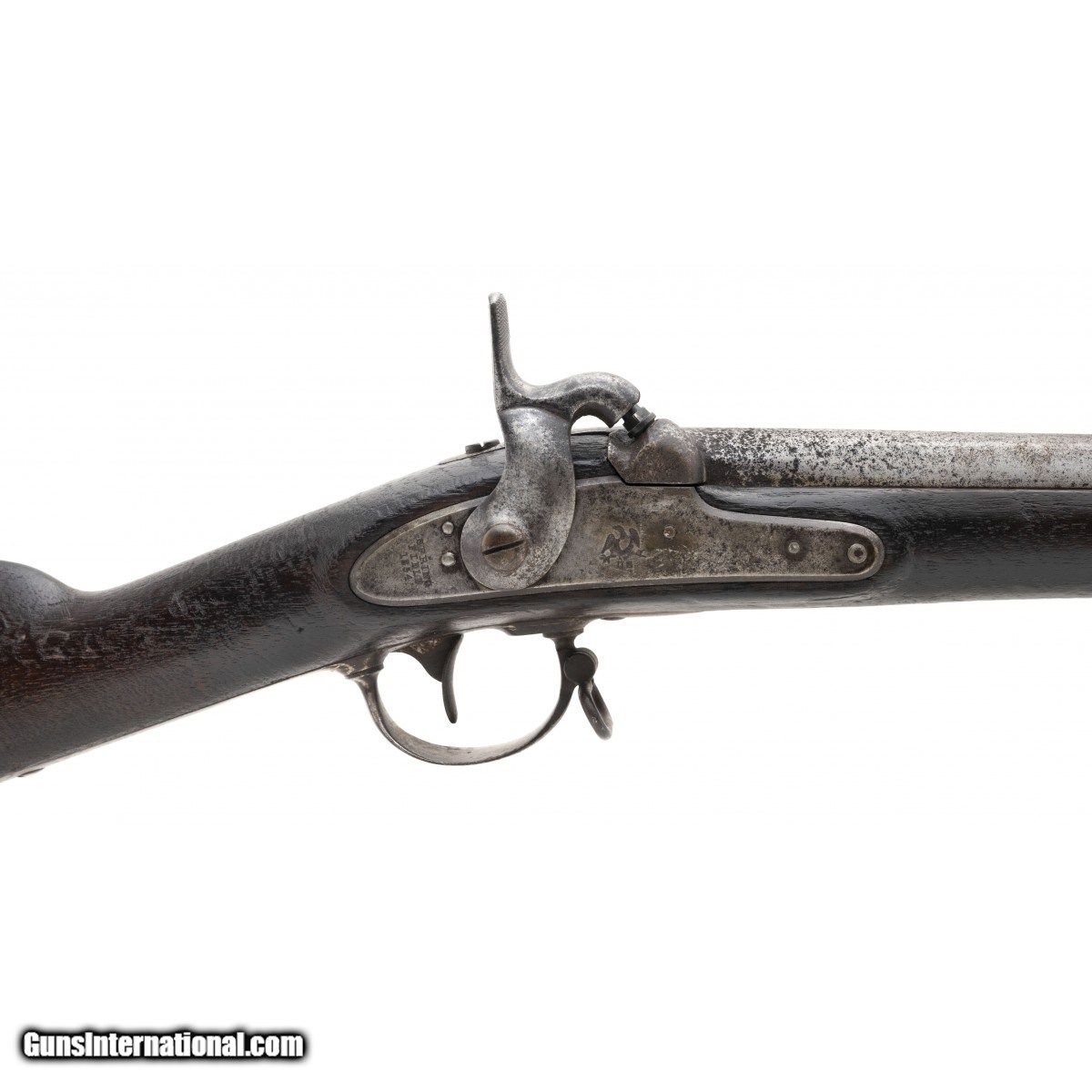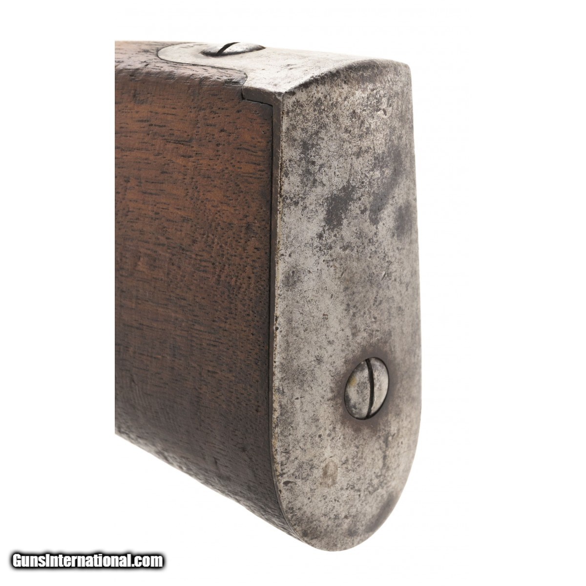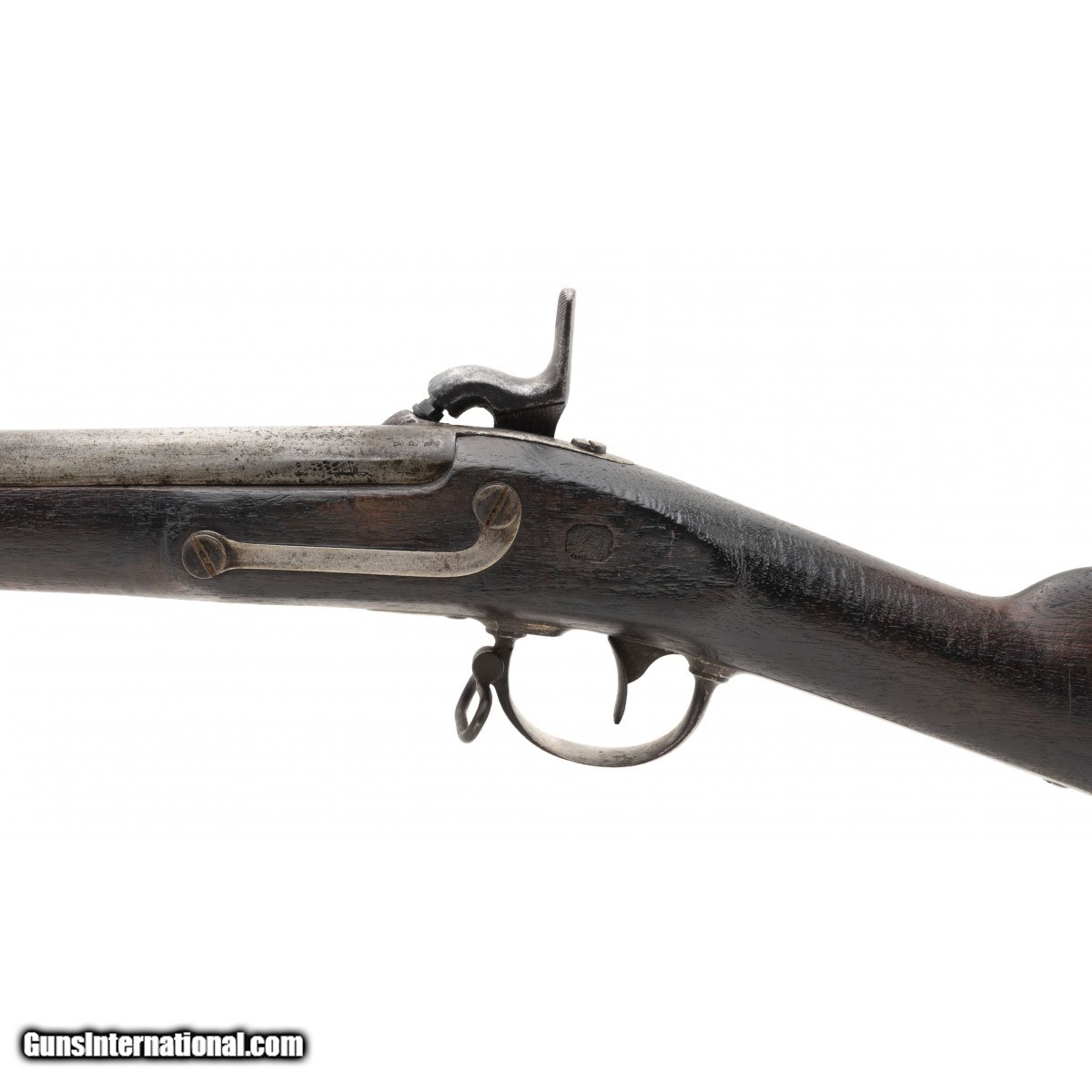 Description: " This 69 caliber smooth bore percussion U.S. Model 1842 musket has been reduced to cadet size. The overall length is approx. 51.5"". The approx. 35.75"" barrel has a good dark bore with light roughness. All the metal is bright with scattered staining. The barrel breech has the V over P over eagle inspection marks. The lock has the eagle over US at the center and SPRING over FIELD over 1854 at the tail. The shortened two band stock is very good with an indention on the left flat for an inlaid plaque. The forend has a step where the original middle band was located. The action functions correctly. This interesting gun may have been altered for military school use. SOLD |