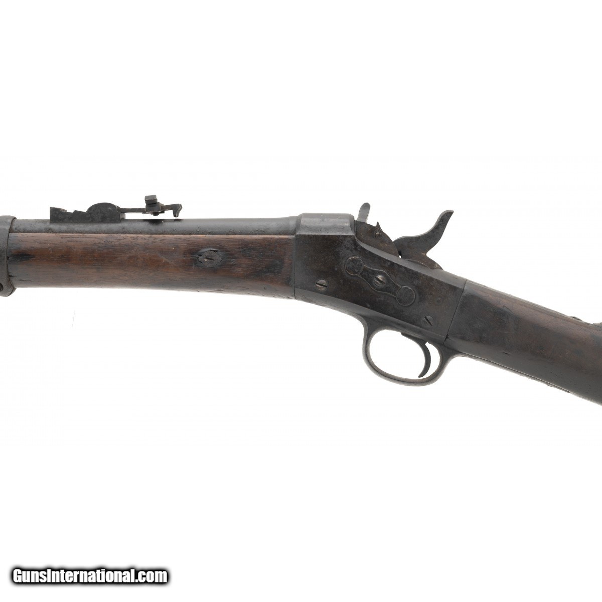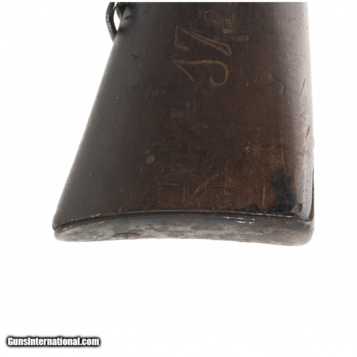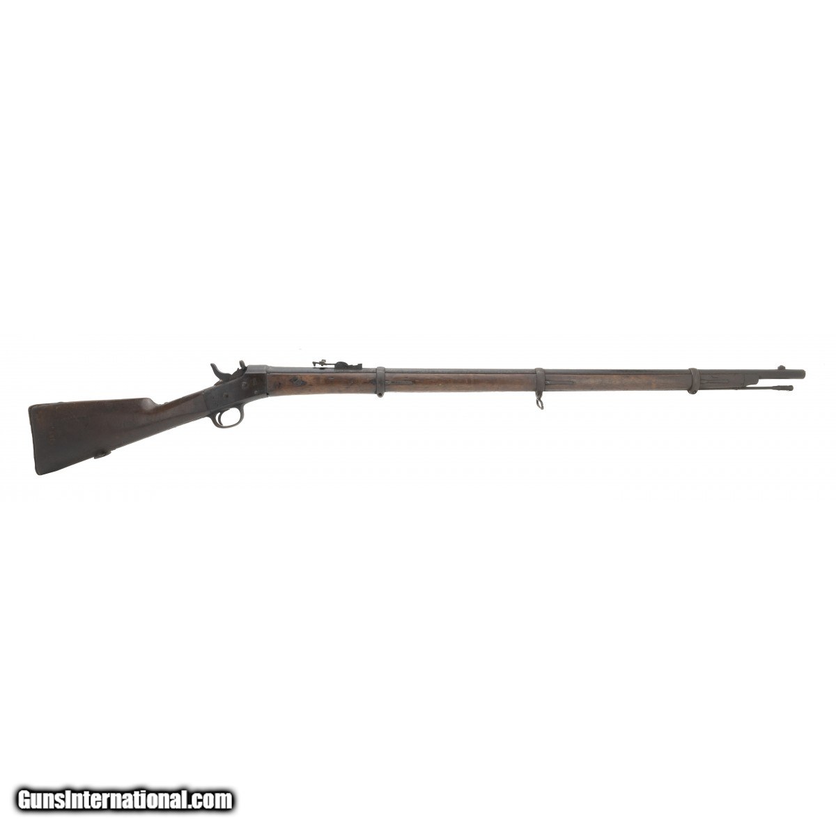 Description: "This Model 1871 Spanish rolling block infantry rifle has the Portuguese crown over AR.O. over 1881 on the left side of the receiver. The 37"" round 11.15Z57R Spanish Remington (43 Spanish) round barre has a poor bore. All the metal is dark with light roughness. The butt stock is good with what may be a unit marking cut into the left side and No. 4384 on the right at the butt and forward of that, a circle cartouche with a crown over OVIEDO over 1881. There is a 1 behind the trigger guard tang. It has the expected usage dents and dings and the butt plate has moderate pitting from poor storage. The forend is good with usage dents and dings but no cracks or chips. The sling swivels and ramrod are present. The action is tight but functions correctly. It appears this rifle was made in Spain and sold to Portugal. It would be perfect for a European military rifle collection. SOLD Antique: Yes |